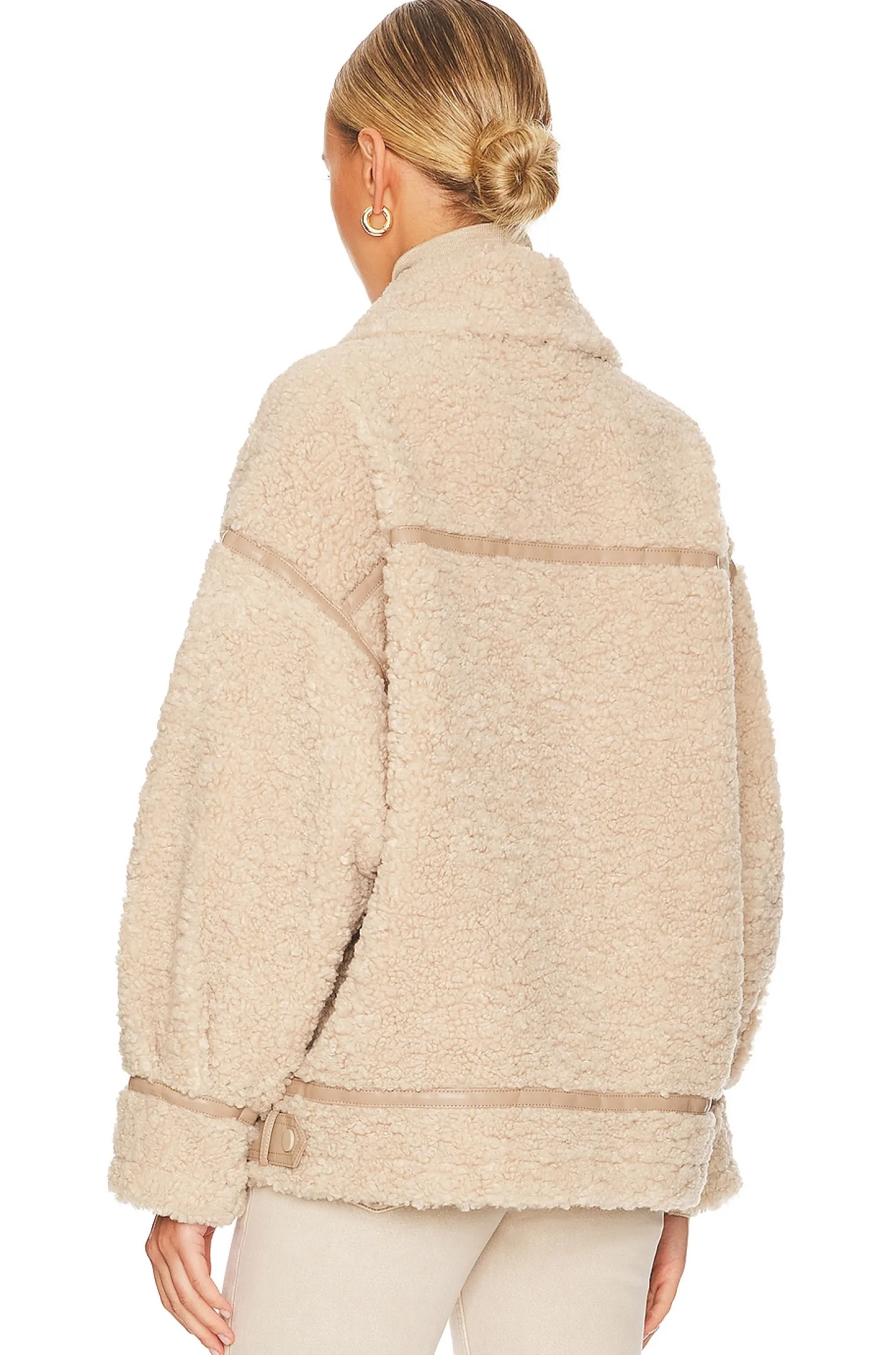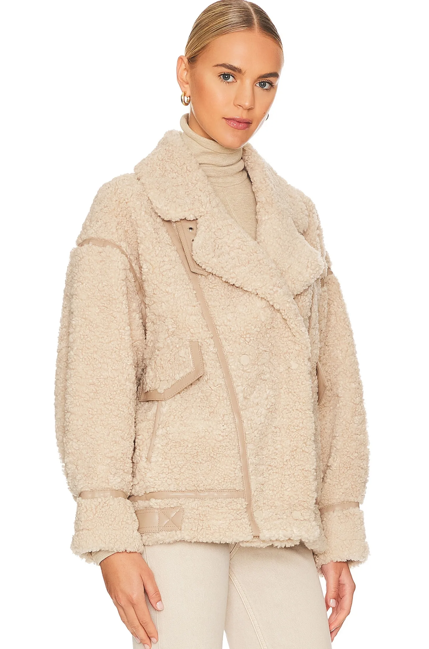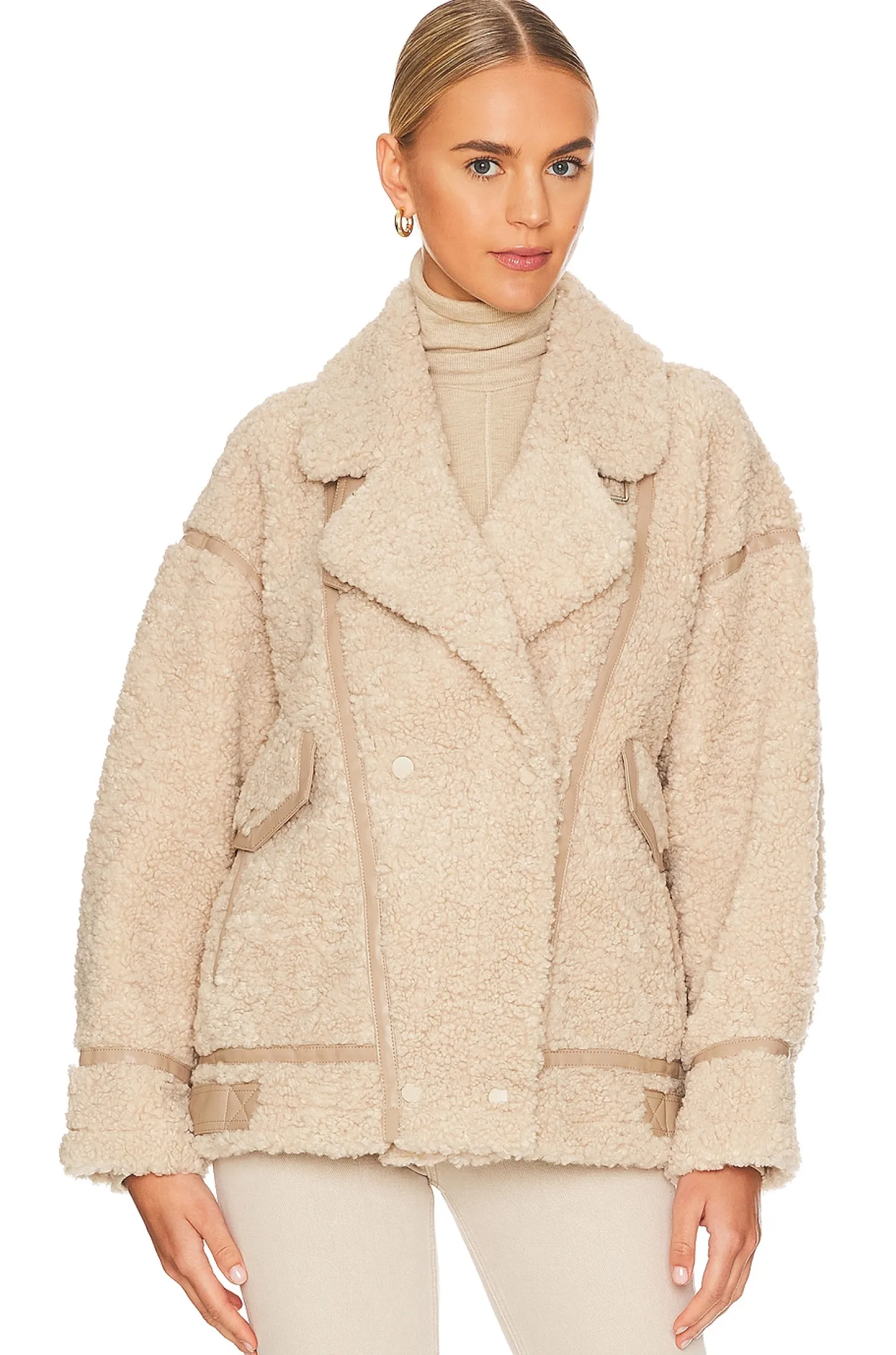 Self: 100% polyester Coating: 100% polyurethane.Made in China.Dry clean only.Front button closure.4-pocket design.Midweight sherpa fabric with faux leather trim