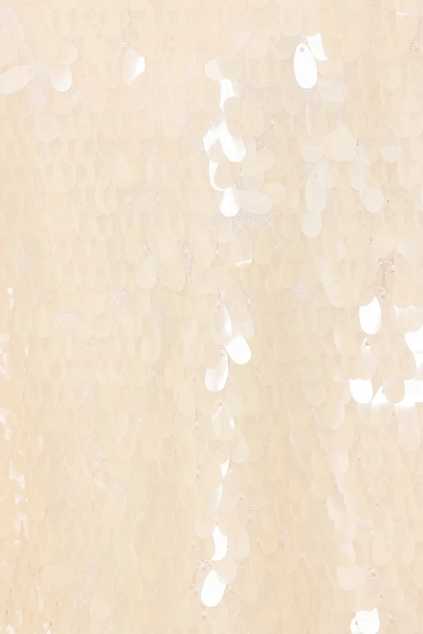 100% polyester.Made in USA.Dry clean only.Fully lined.Hidden back zipper closure.Boned bodice.Sequin embellished mesh fabric.Neckline to hem measures approx 23" in length