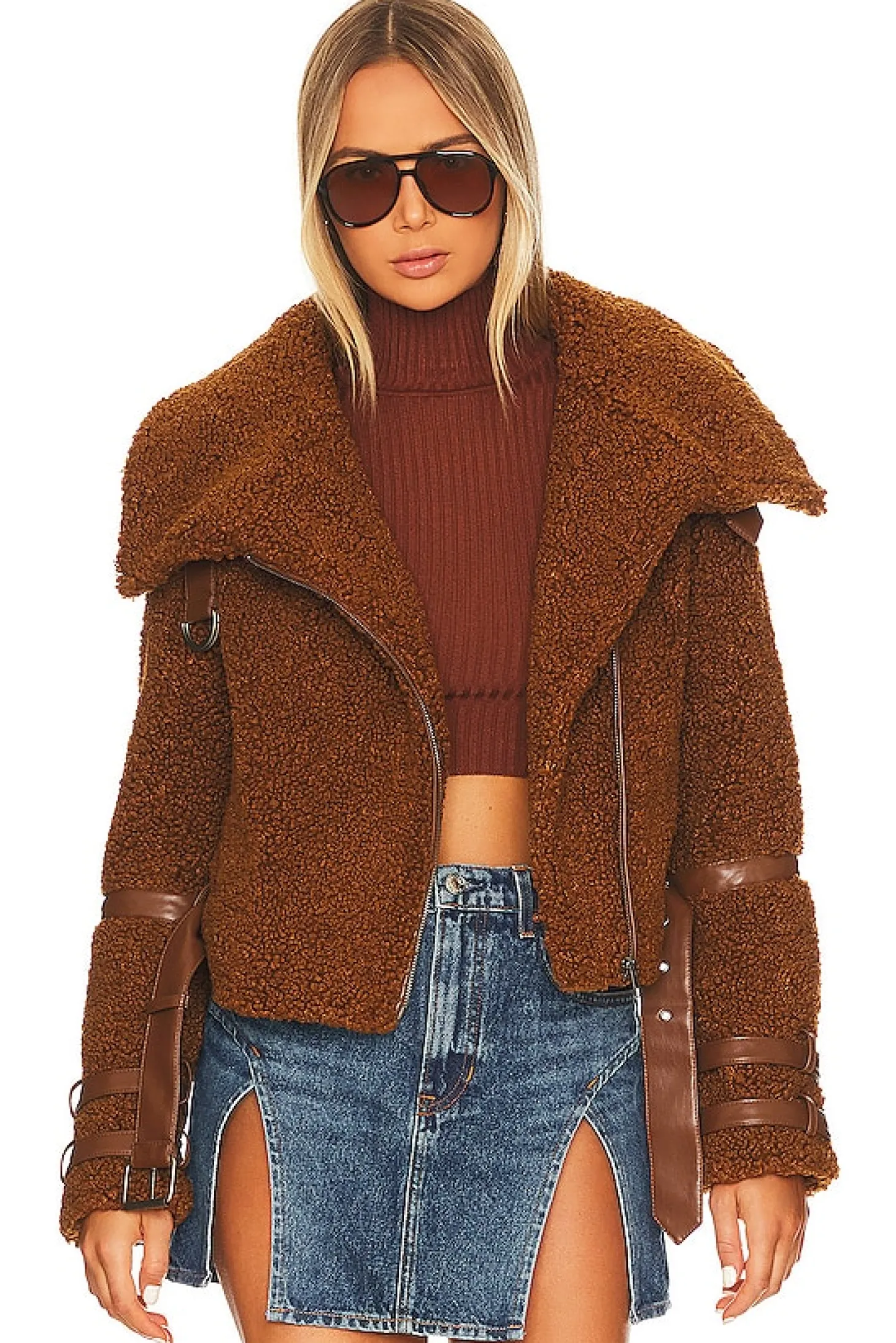 Self, Lining, & Belt Back: 100% polyester Belt Face: 100% polyurethane.Made in China.Dry clean only.Front zipper closure.Foldover top styling.Tonal faux leather waist belt and belt accents at top and cuffs.Spiral faux fur fabric