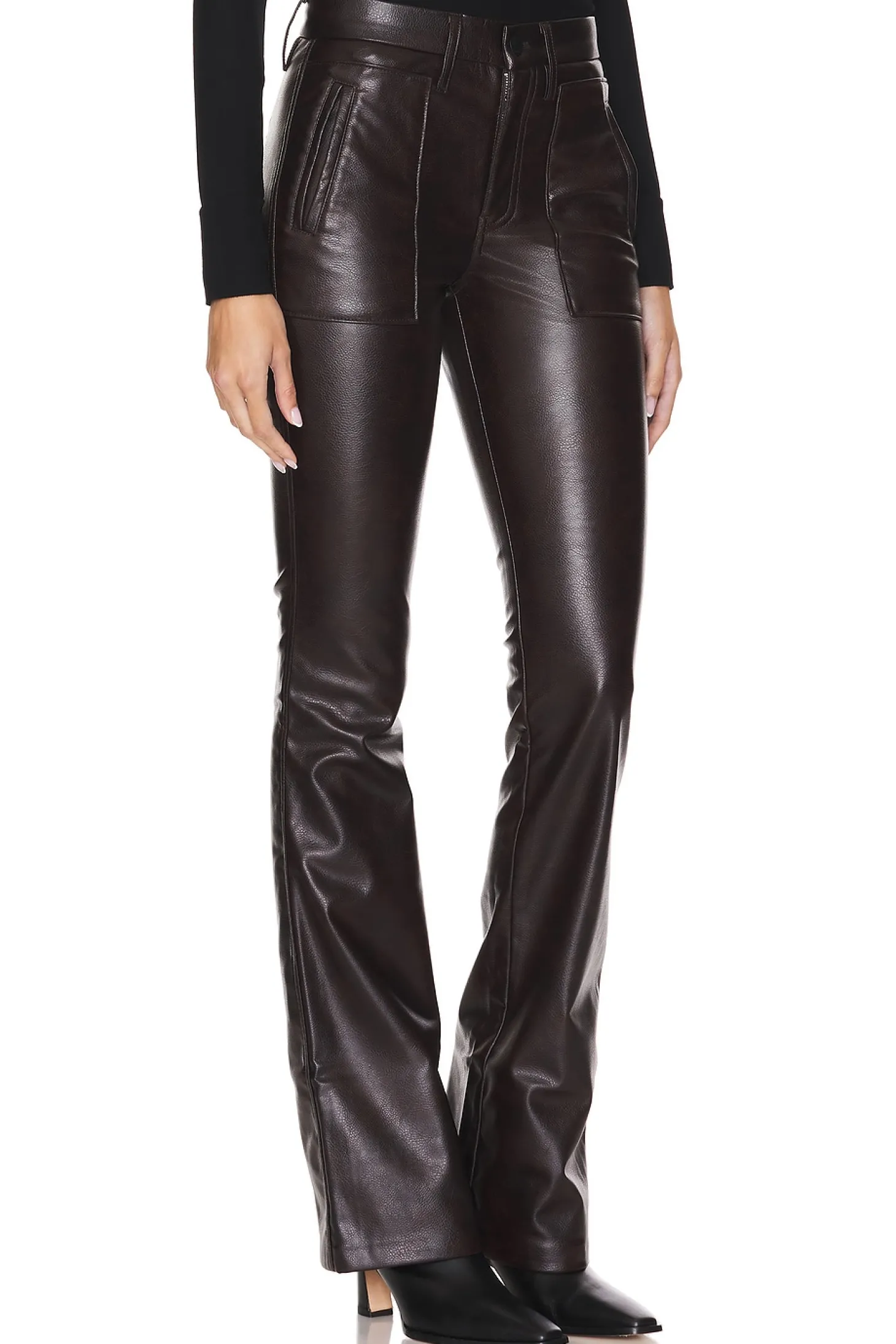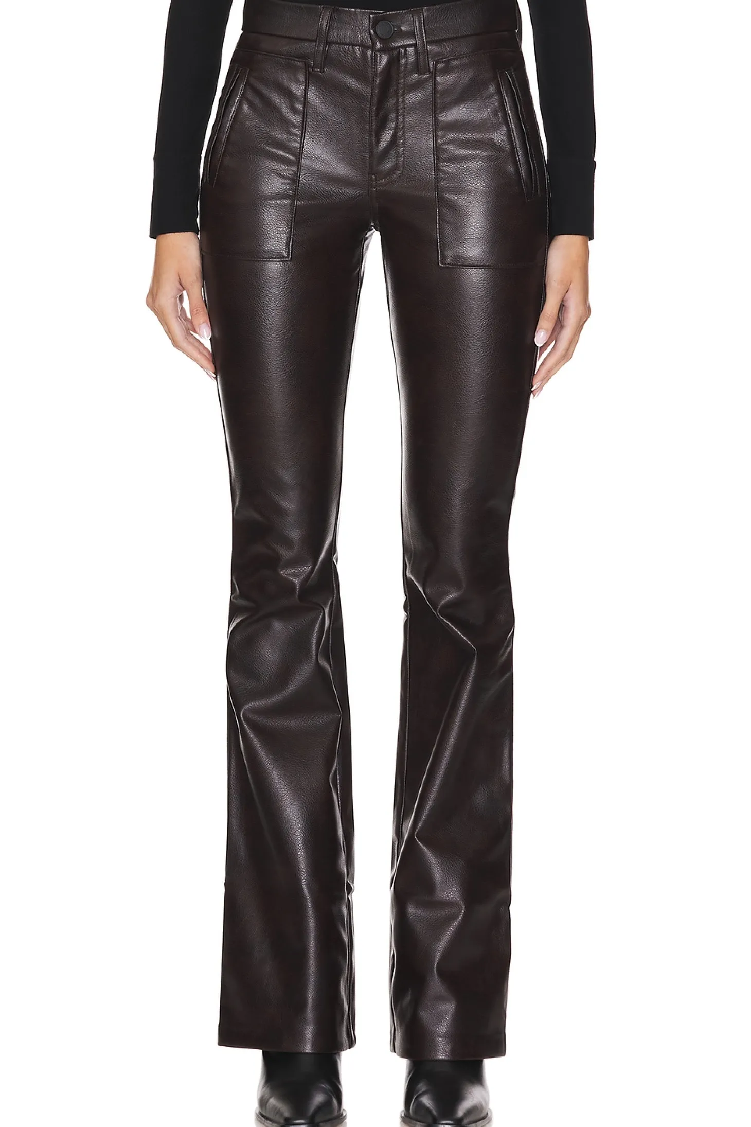 Self 1: 100% polyurethane Self 2: 100% polyester Lining: 70% polyester 30% cotton.Made in China.Professional leather clean only.Zip fly with button closure.4 pocket styling.7" at the knee and breaks to 9" at the leg opening