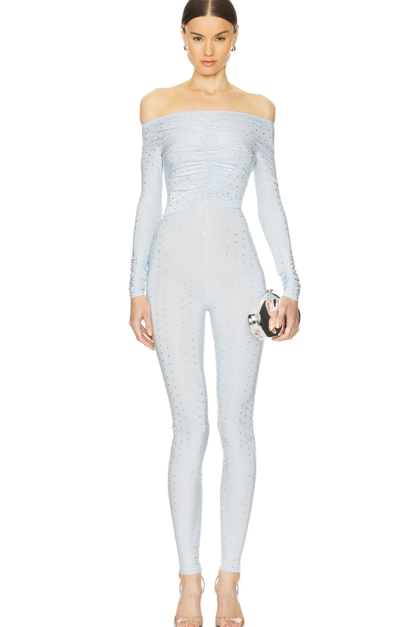 Jersey blend.Imported.Dry clean recommended.Hidden back zipper closure.Off the shoulder styling.Ruched fabric with crystal embellishments throughout.Neckline to hem measures approx 55.5" in length 12" at the knee narrows to 8" at the leg opening
