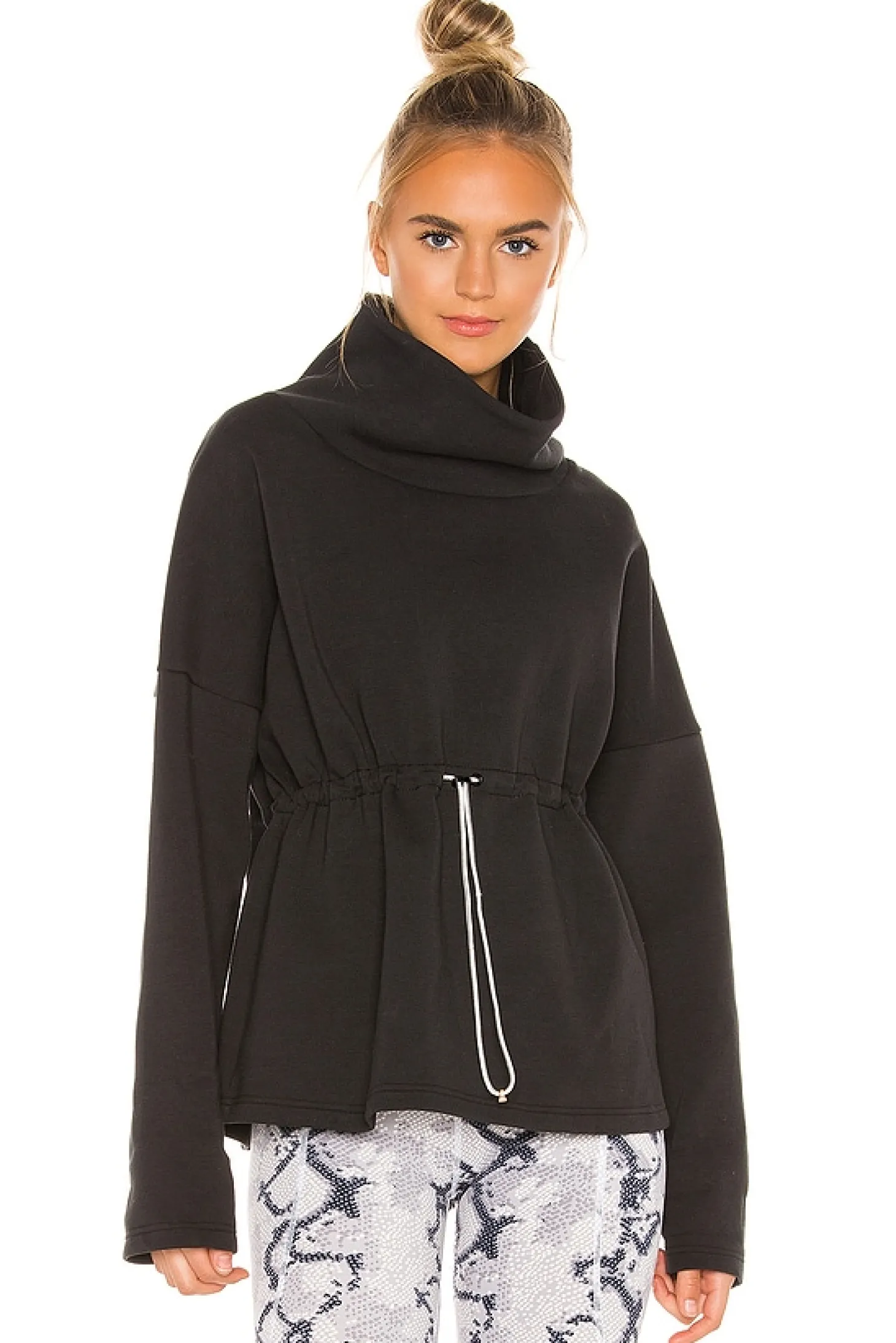 75% cotton 20% poly 5% elastane.Funnel neck.Drawstring waist with pull tab.Midweight bonded jersey fabric.Imported
