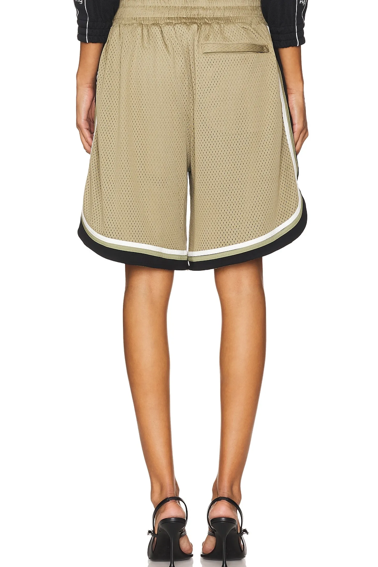 100% polyester.Made in China.Machine wash.Elastic waistband with interior drawstring.Side pockets with single rear zip pocket.Jersey fabric.Shorts measure approx 18.5" in length