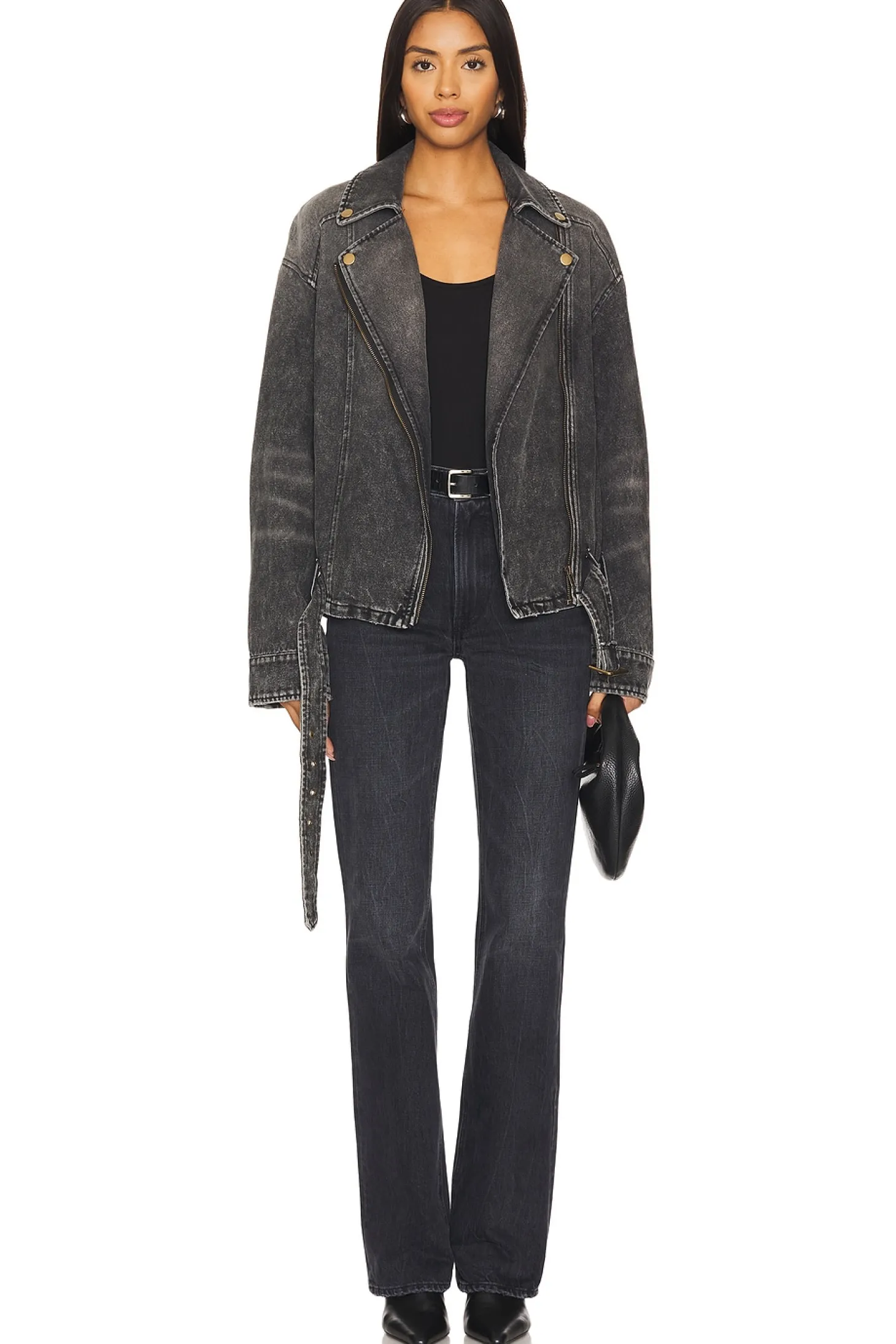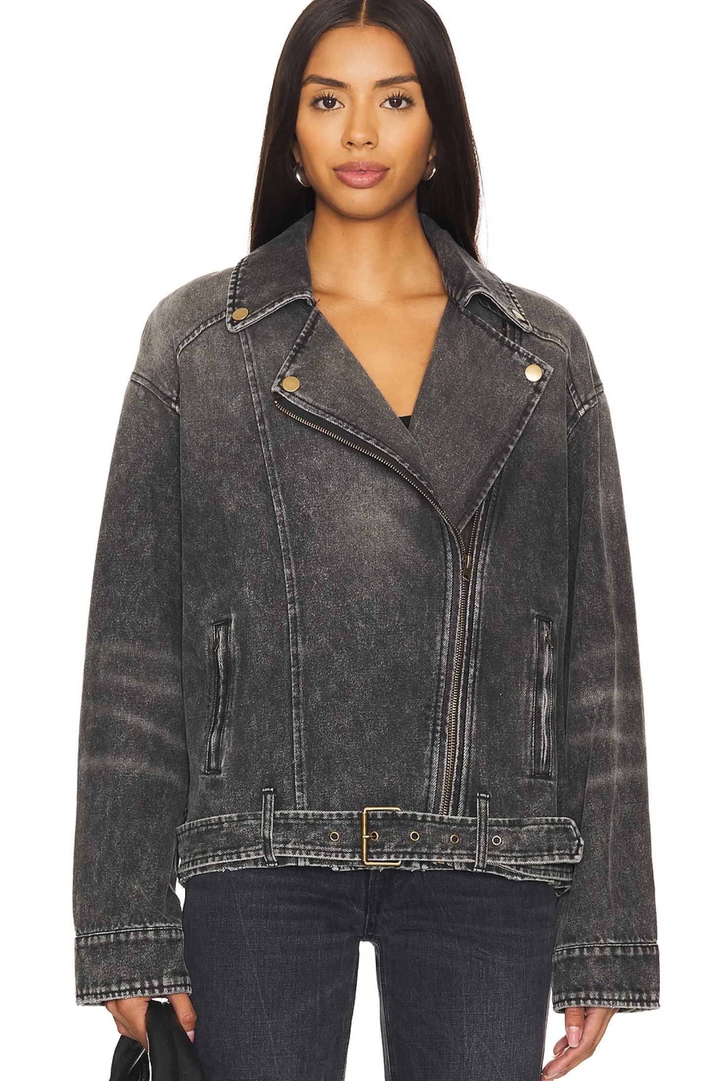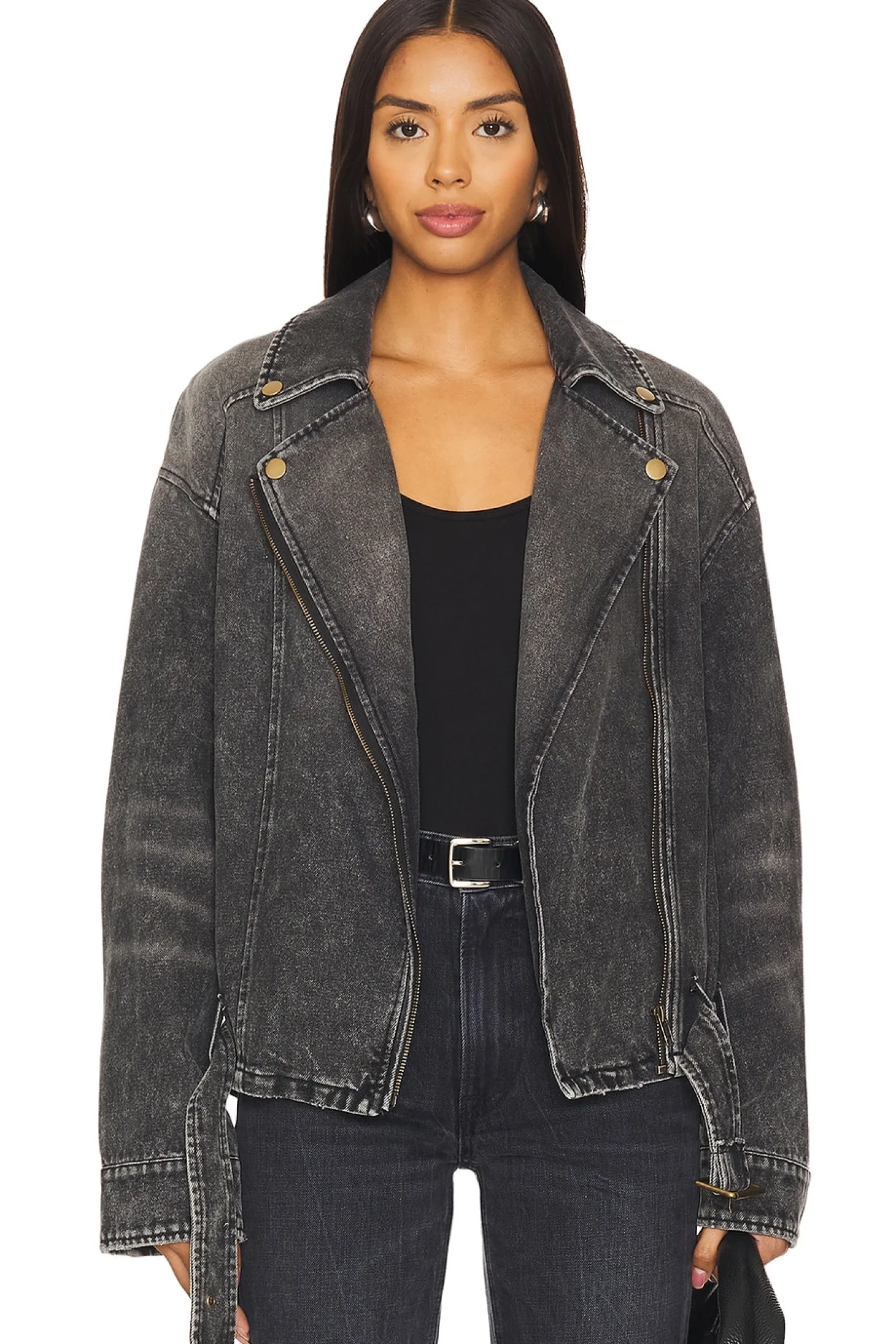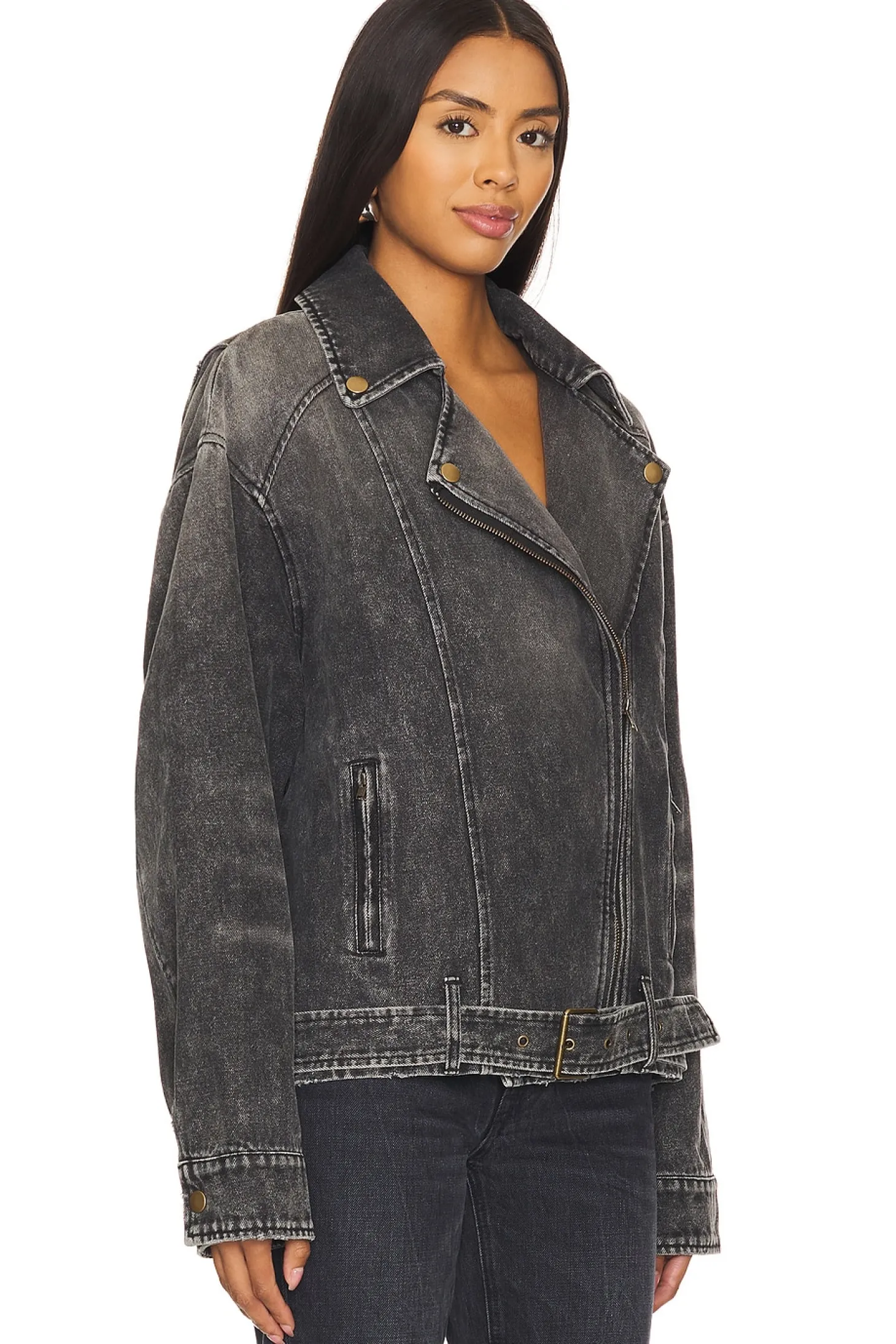 Denim textile.Imported.Machine wash recommended.Front zipper closure.Side seam zipper pockets.Button cuffs.Attached belt with buckle closure at hem.Midweight fabric