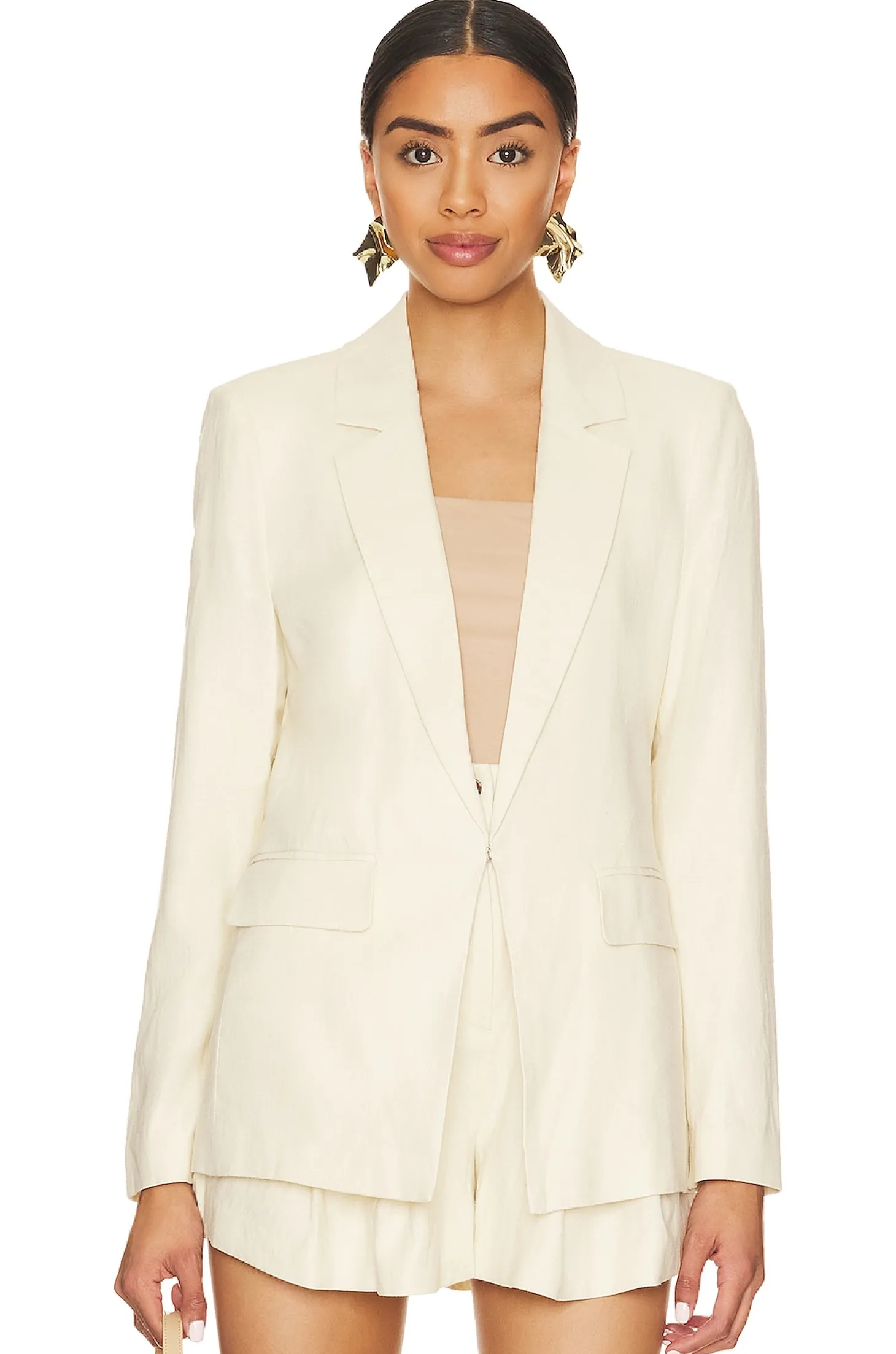 Linen blend.Imported.Dry clean recommended.Front hook and eye closure.Front flap pockets.Lightly padded shoulders.Split cuffs.Lightweight linen fabric Item not sold as set