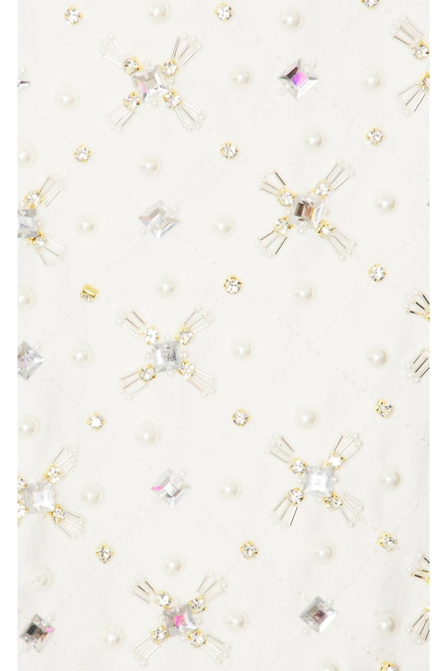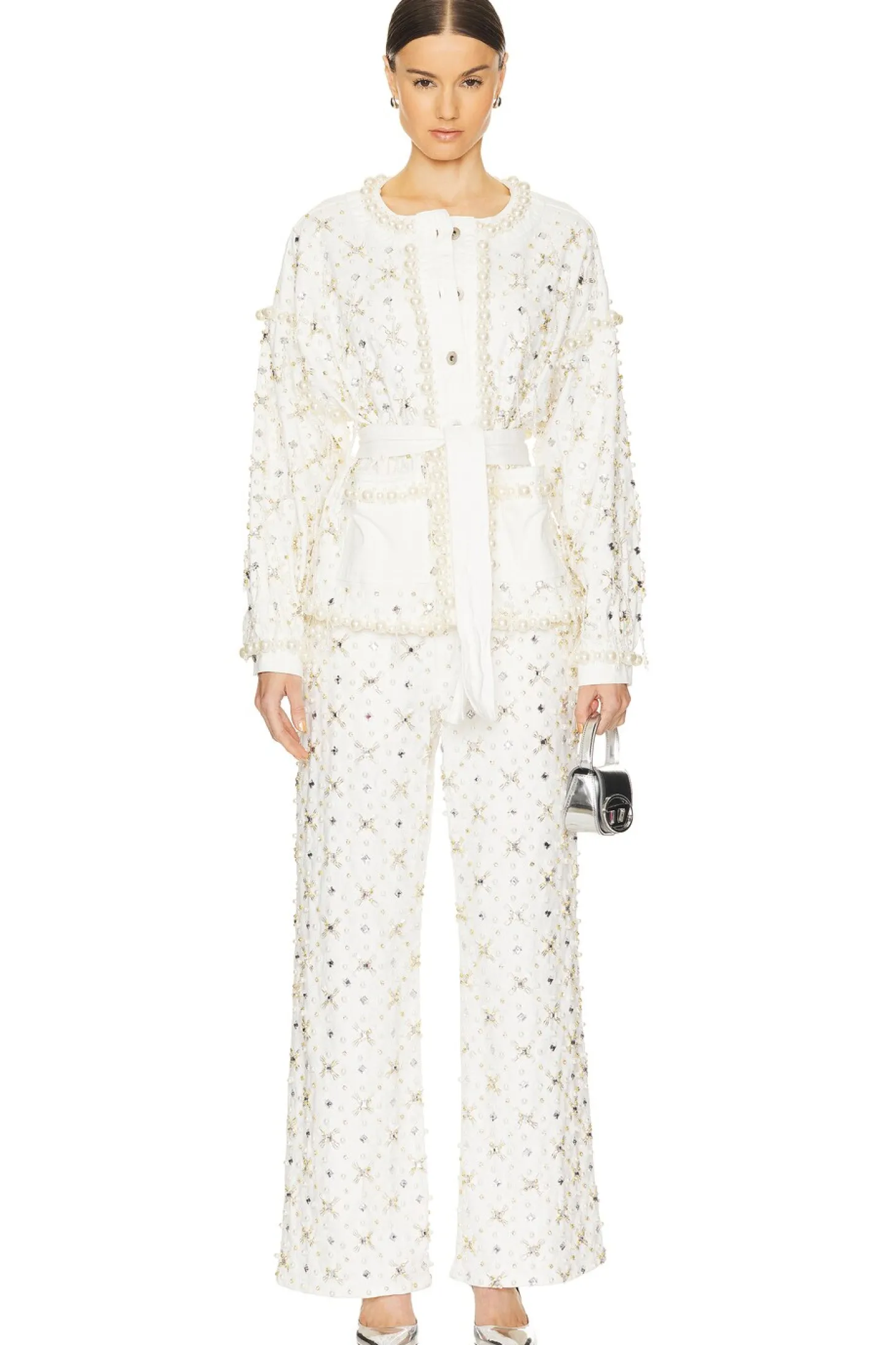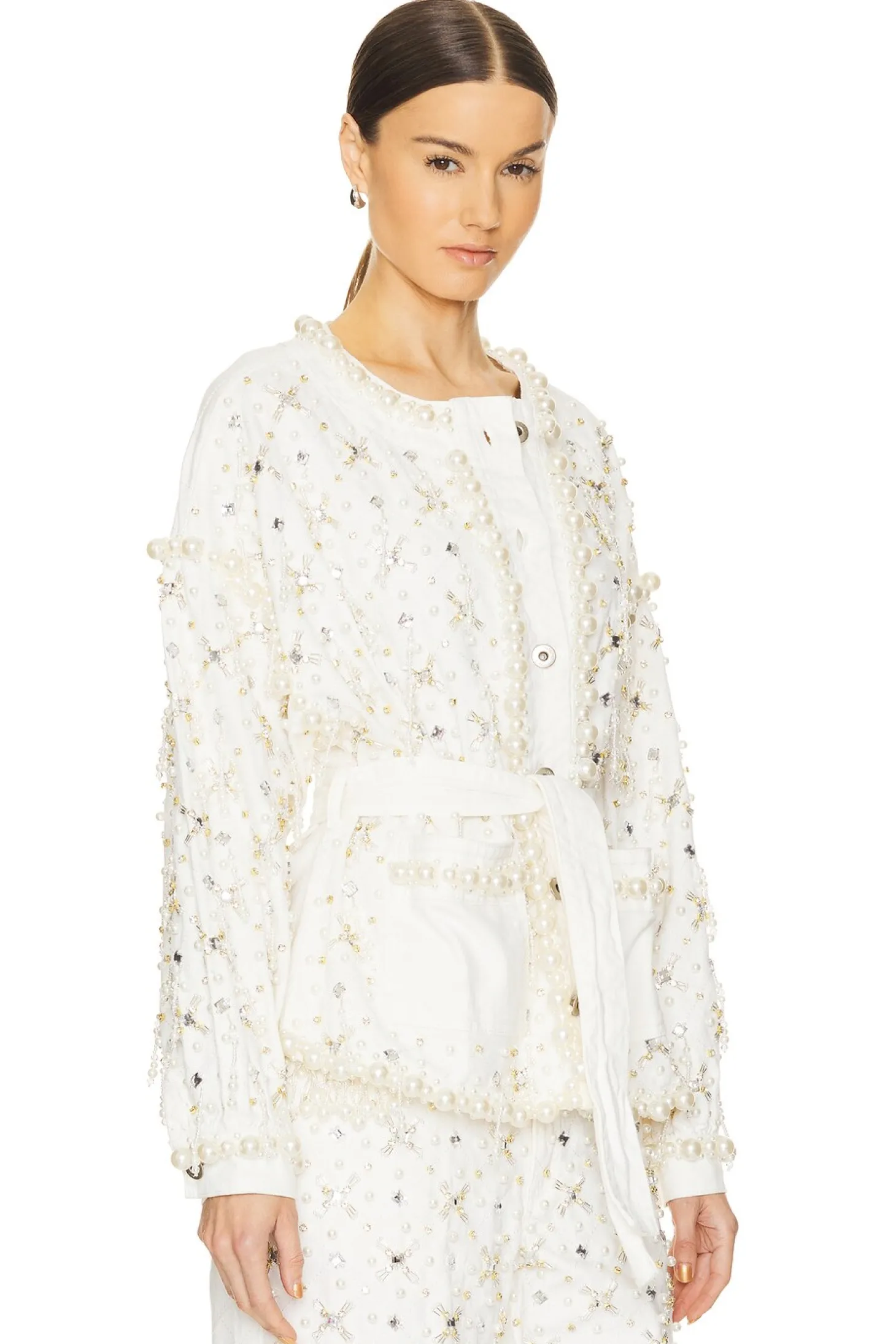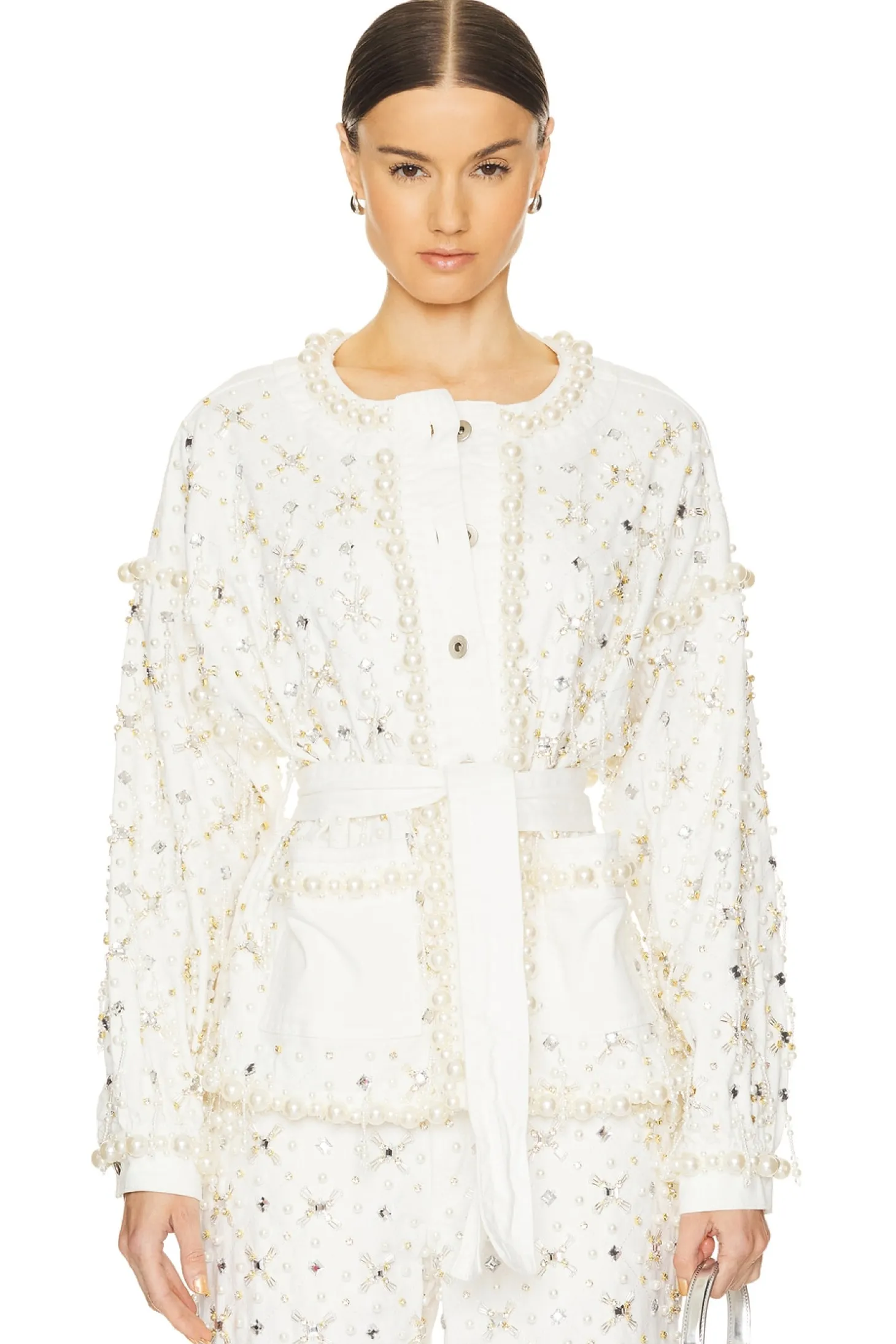 99% cotton 1% elastane.Made in Brazil.Hand wash.Front button closure.Front slip pockets.Crystal and faux pearl embellishments.Attached waist tie.Item not sold as a set