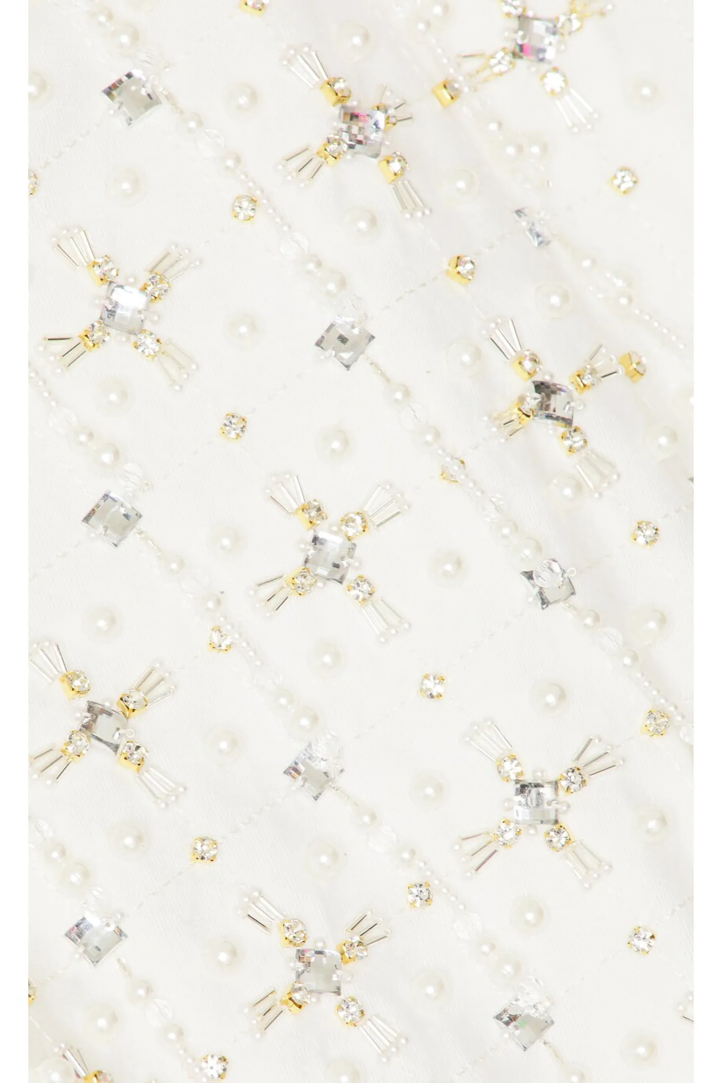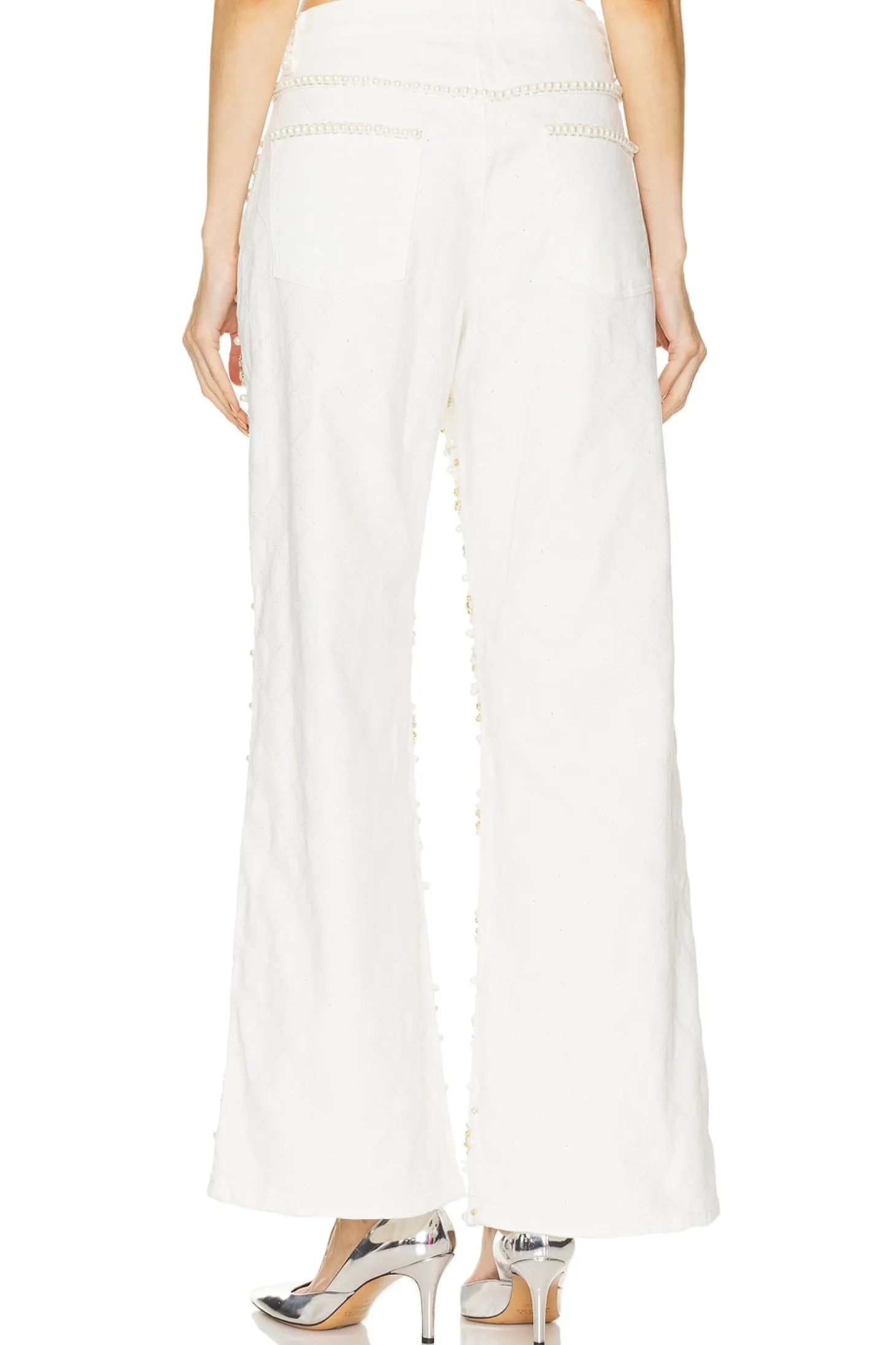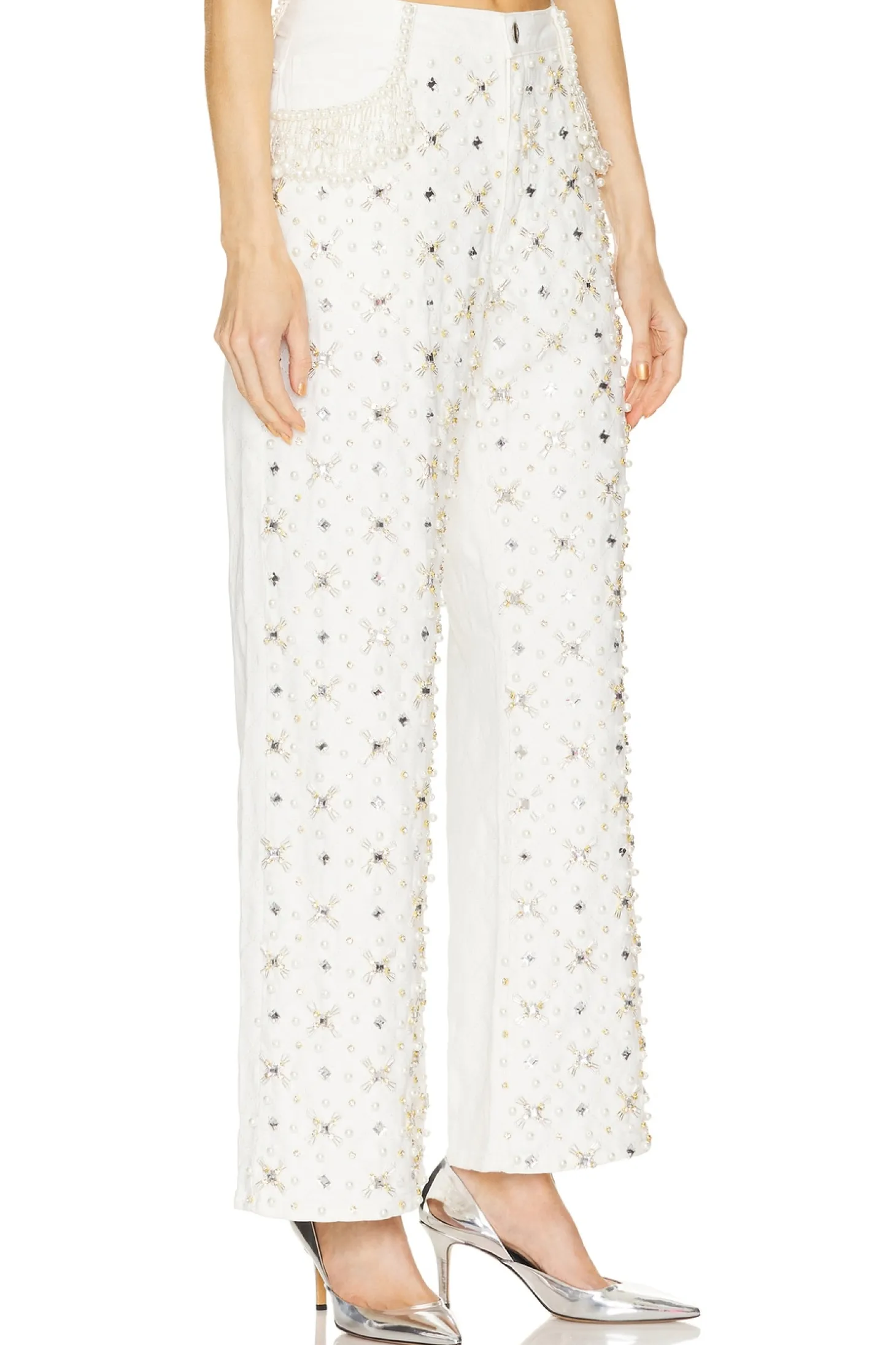 99% cotton 1% elastane.Made in Brazil.Hand wash.Zip fly with button closure.5-pocket design.Crystal and faux pearl embellishments.Midweight denim fabric Item not sold as a set.20" at the knee breaks to 24" at the leg opening