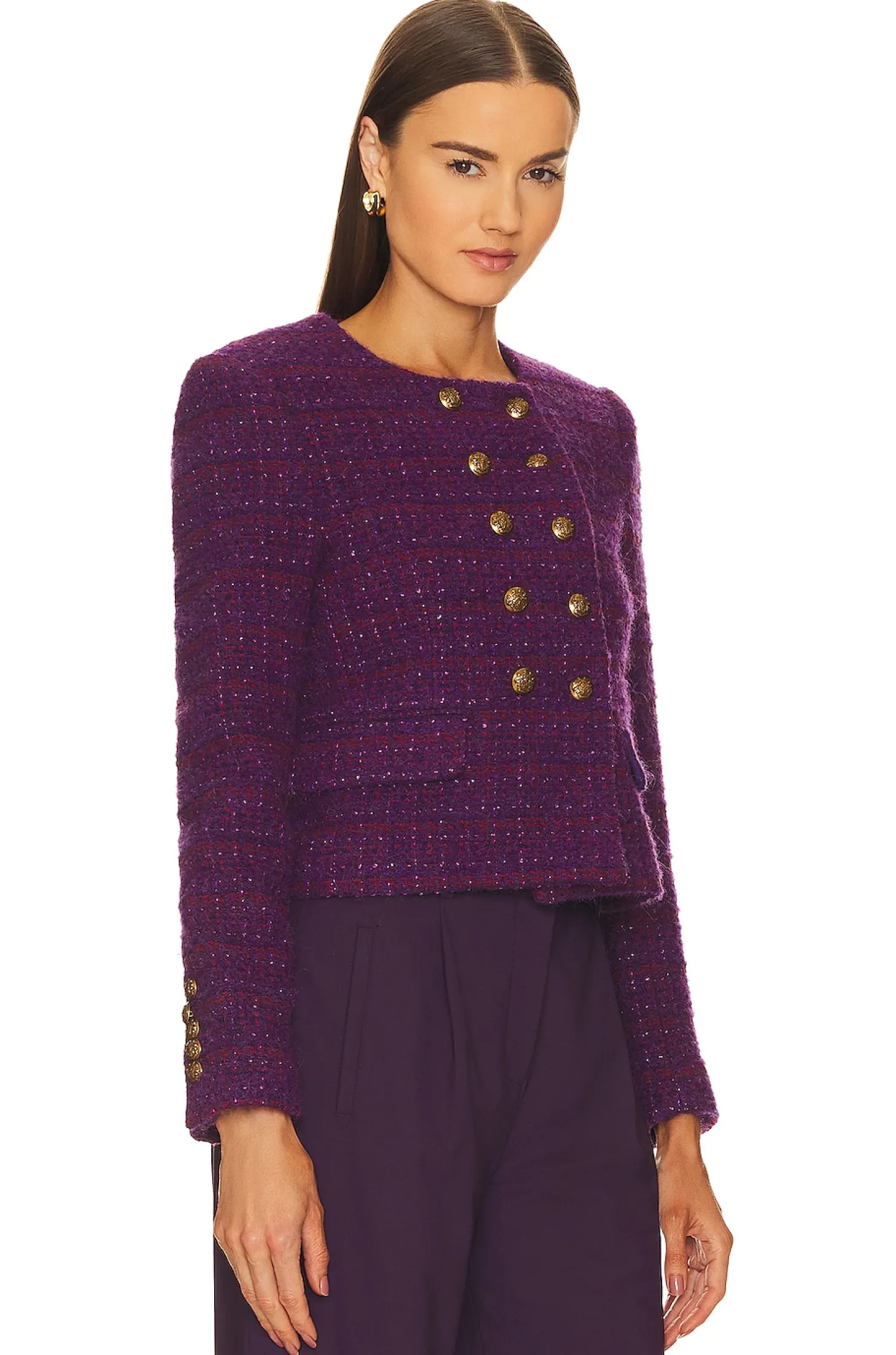 Acrylic blend.Imported.Dry clean recommended.Front button closure.Lightly padded shoulders.Front faux flap pockets.Midweight tweed knit fabric
