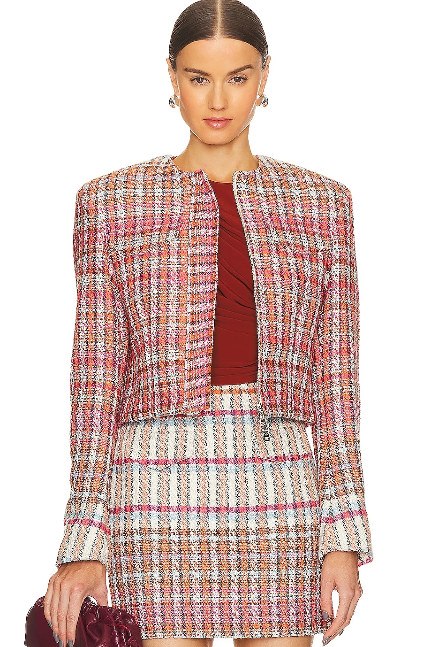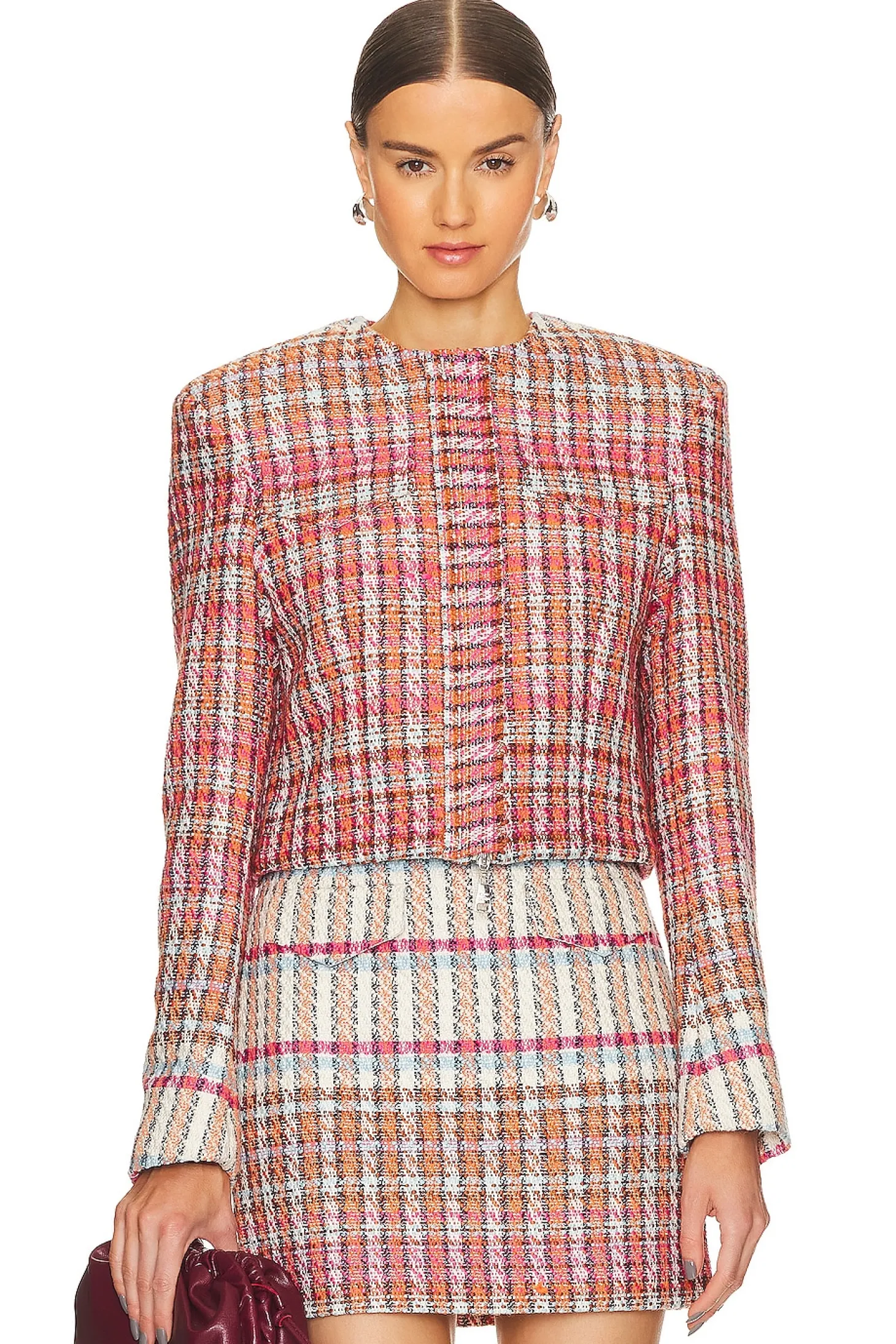 Shell: 58% cotton 20% wool 20% acrylic 2% polyester Lining: 55% polyester 45% viscose .Made in China.Dry clean recommended.Front zipper closure.Padded shoulders.Breast flap pockets.Zipper cuffs.Midweight tweed fabric