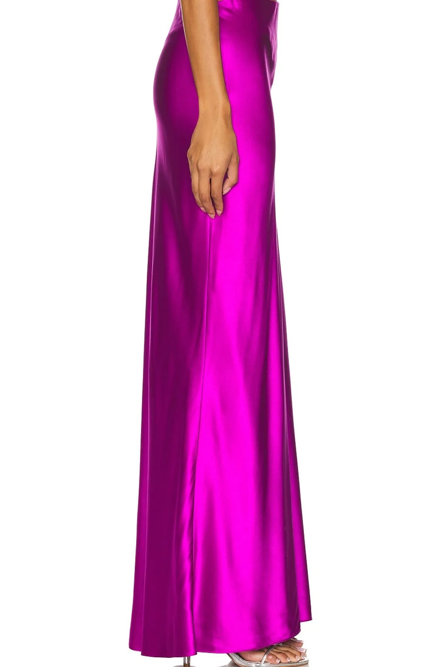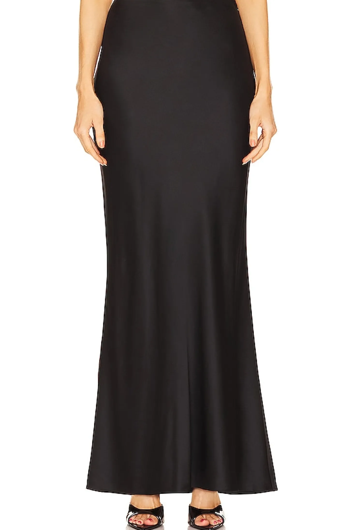 Self: 100% silk Lining: 100% silk.Made in China.Dry clean only.Fully lined.Hidden side zip closure.Satin fabric.Item not sold as set.Skirt measures approx 43" in length