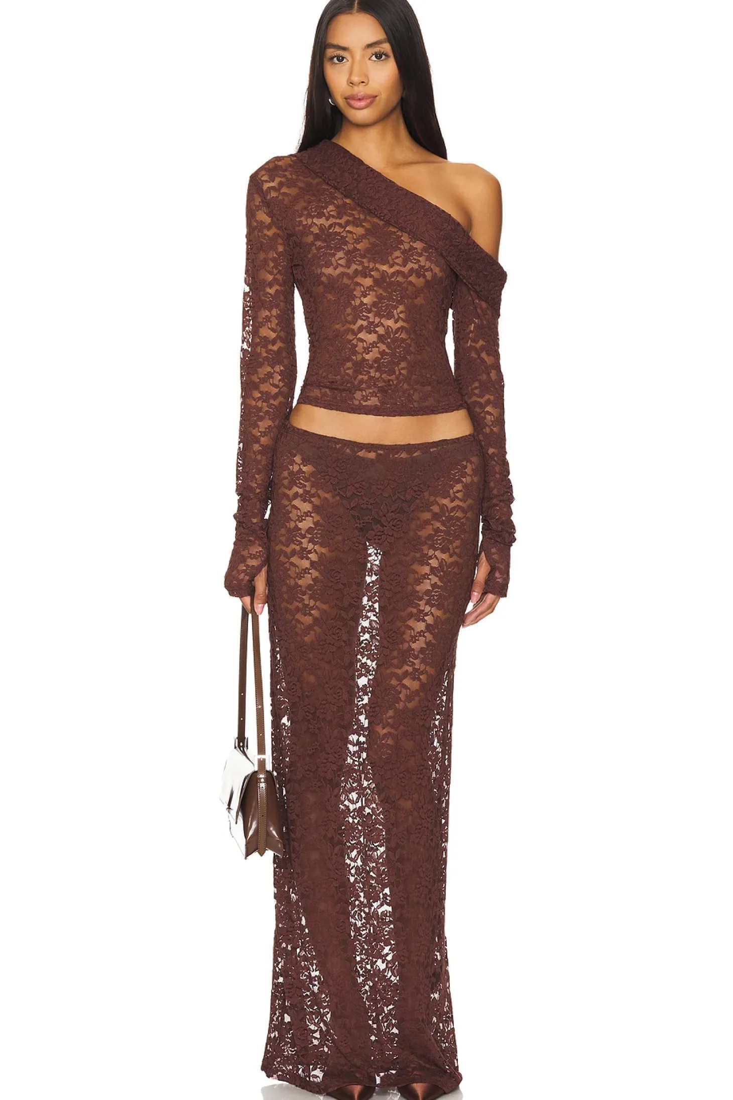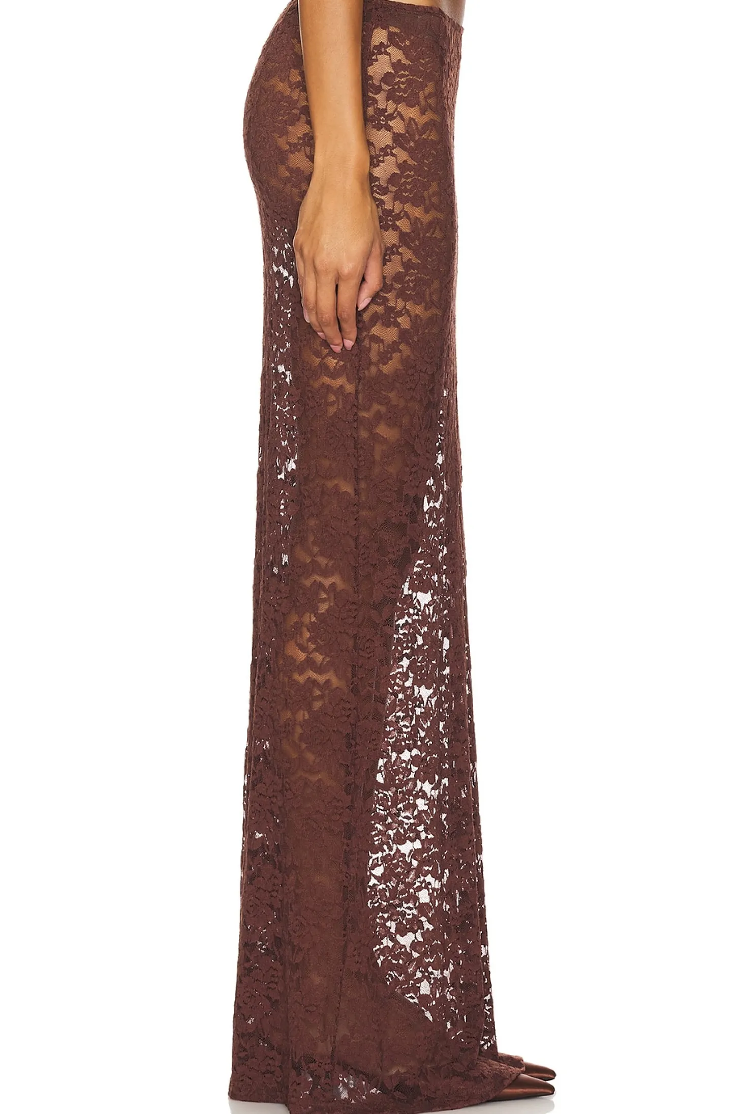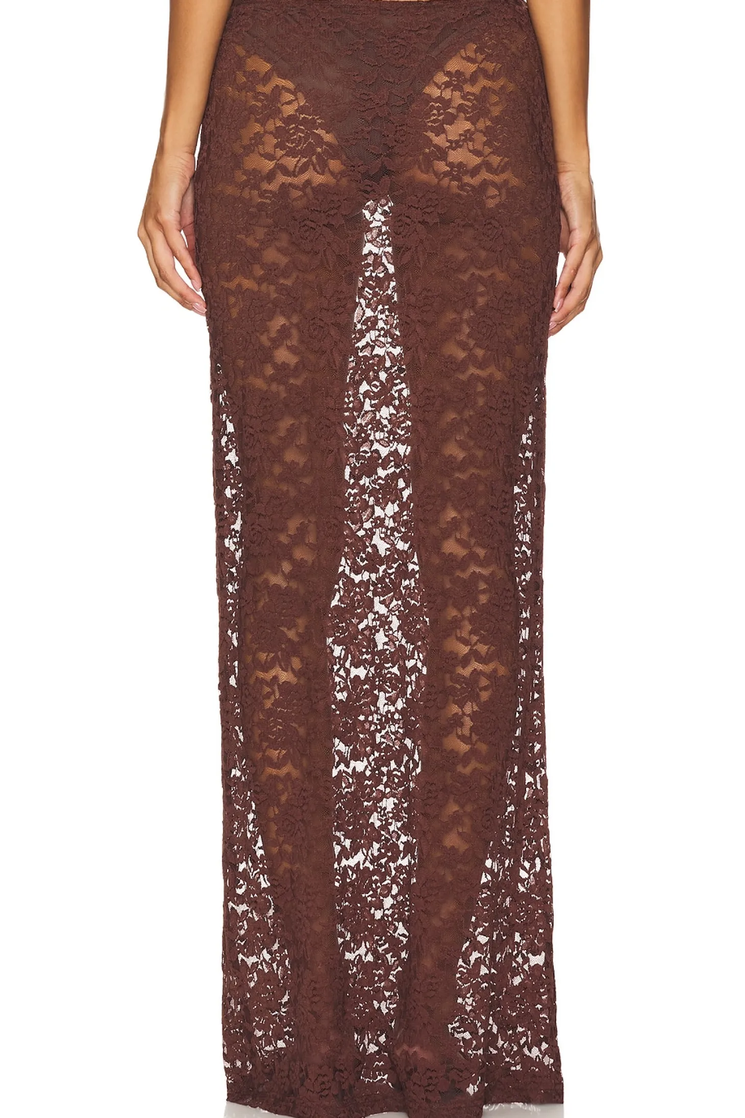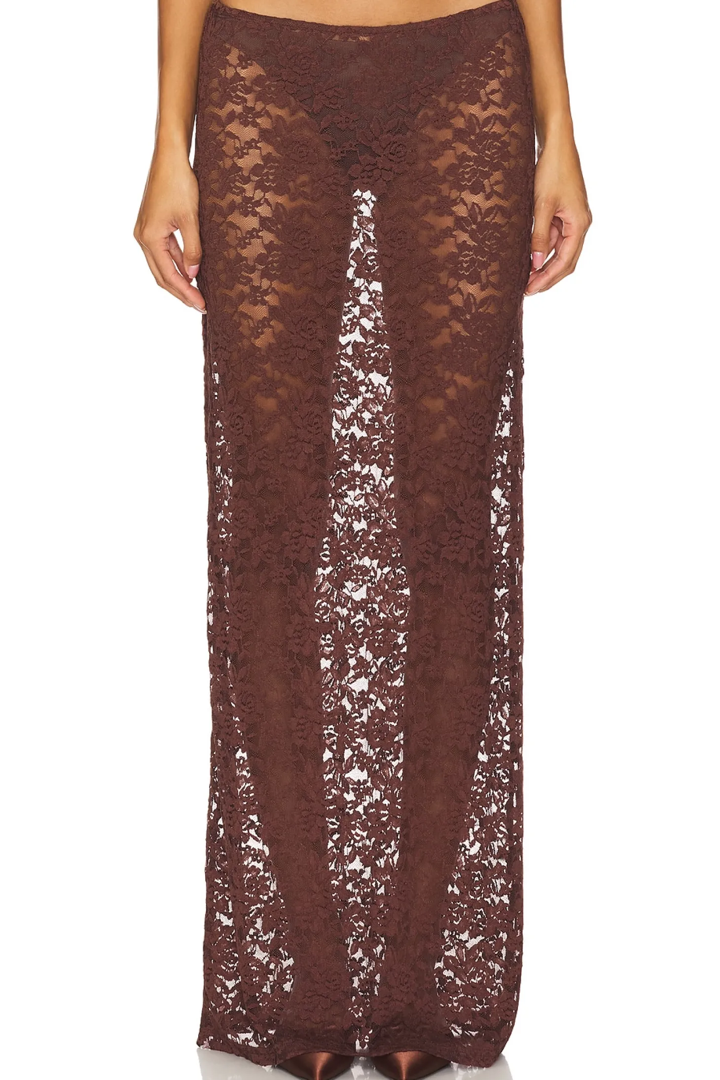 90% nylon 10% elastane.Made in China.Hand wash.Unlined.Pull-on styling with elastic waistband.Floral lace fabric.Item not sold as set Garment is intentionally sheer, undergarments will show through. Please note undergarment not included.Skirt measures approx 43" in length