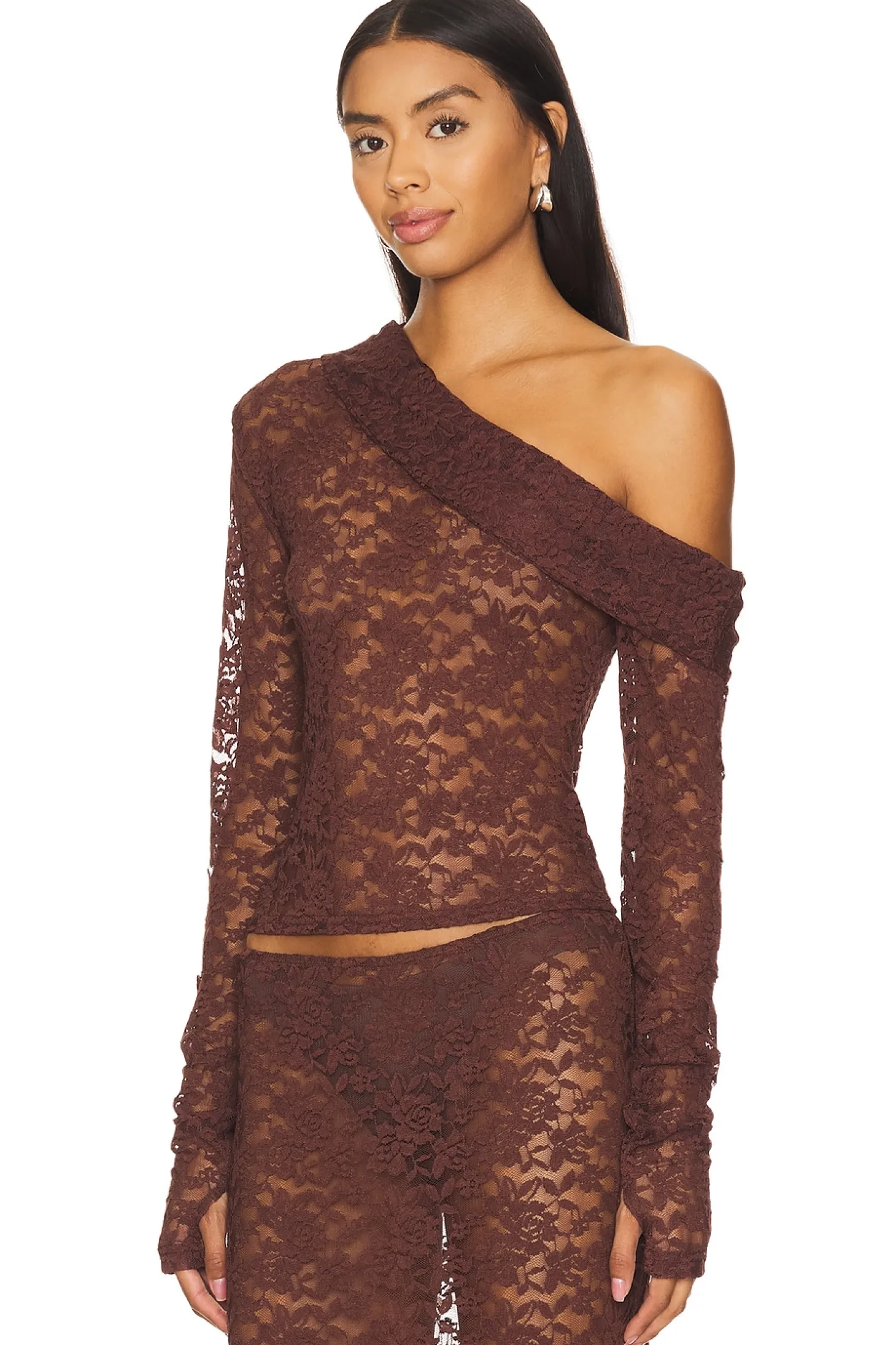 90% nylon 10% elastane.Made in China.Hand wash.Pull-on styling.Foldover neckline.Thumbhole design.Floral lace fabric Item not sold as set.Garment is intentionally sheer, undergarments will show through. Please note undergarment not included