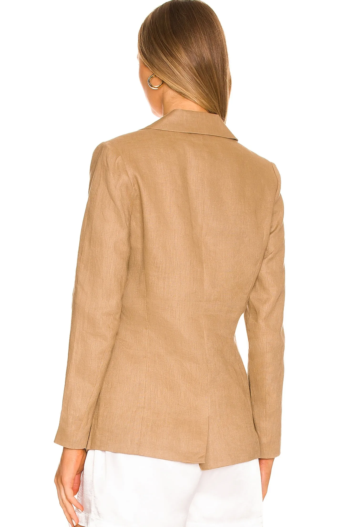 Linen blend.Imported.Hand wash recommended.Singular front hook and eye closure.Lightly padded shoulders.Side flap pockets.Linen fabric
