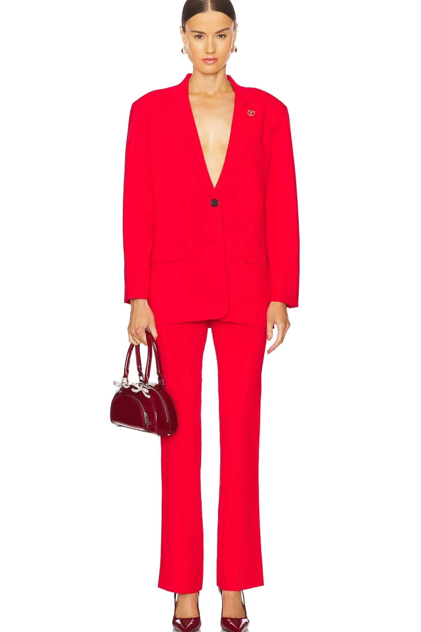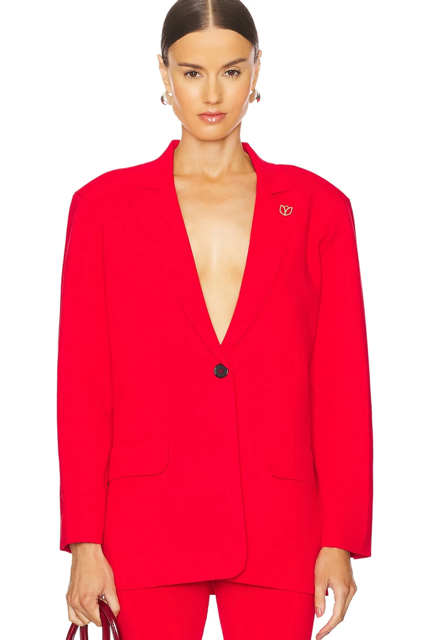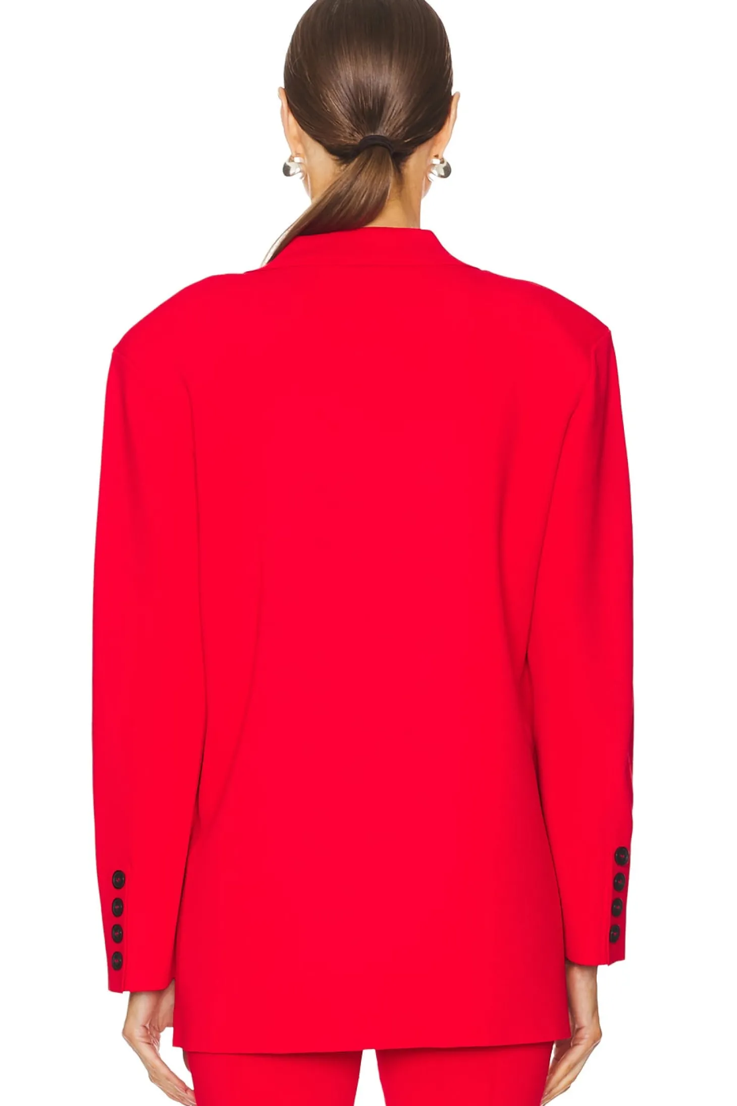 Ponte textile.Made in China.Dry clean only.Singular front button closure.Padded shoulders.Gold-tone accent at shoulder.Button cuffs.Item not sold as a set