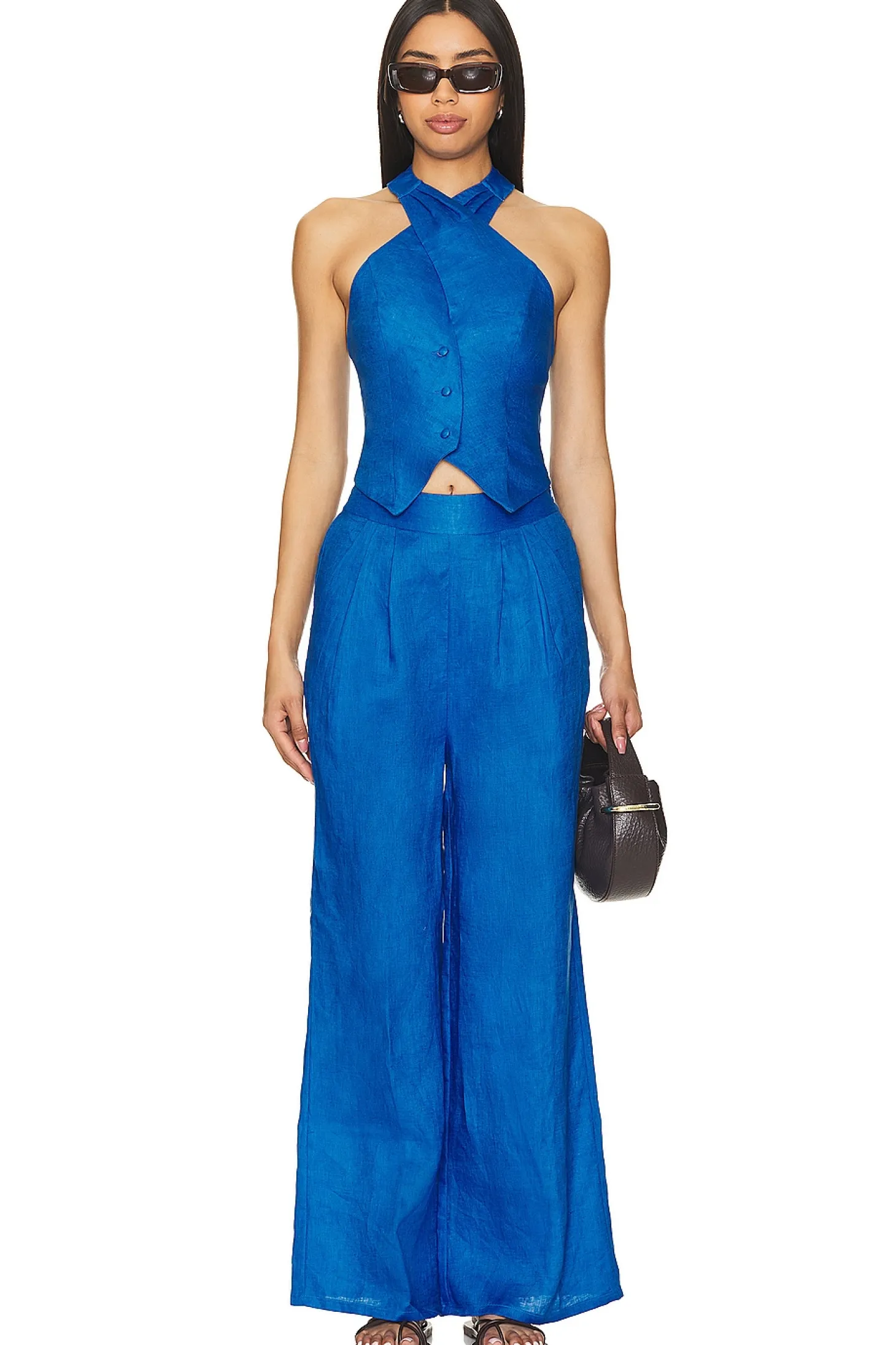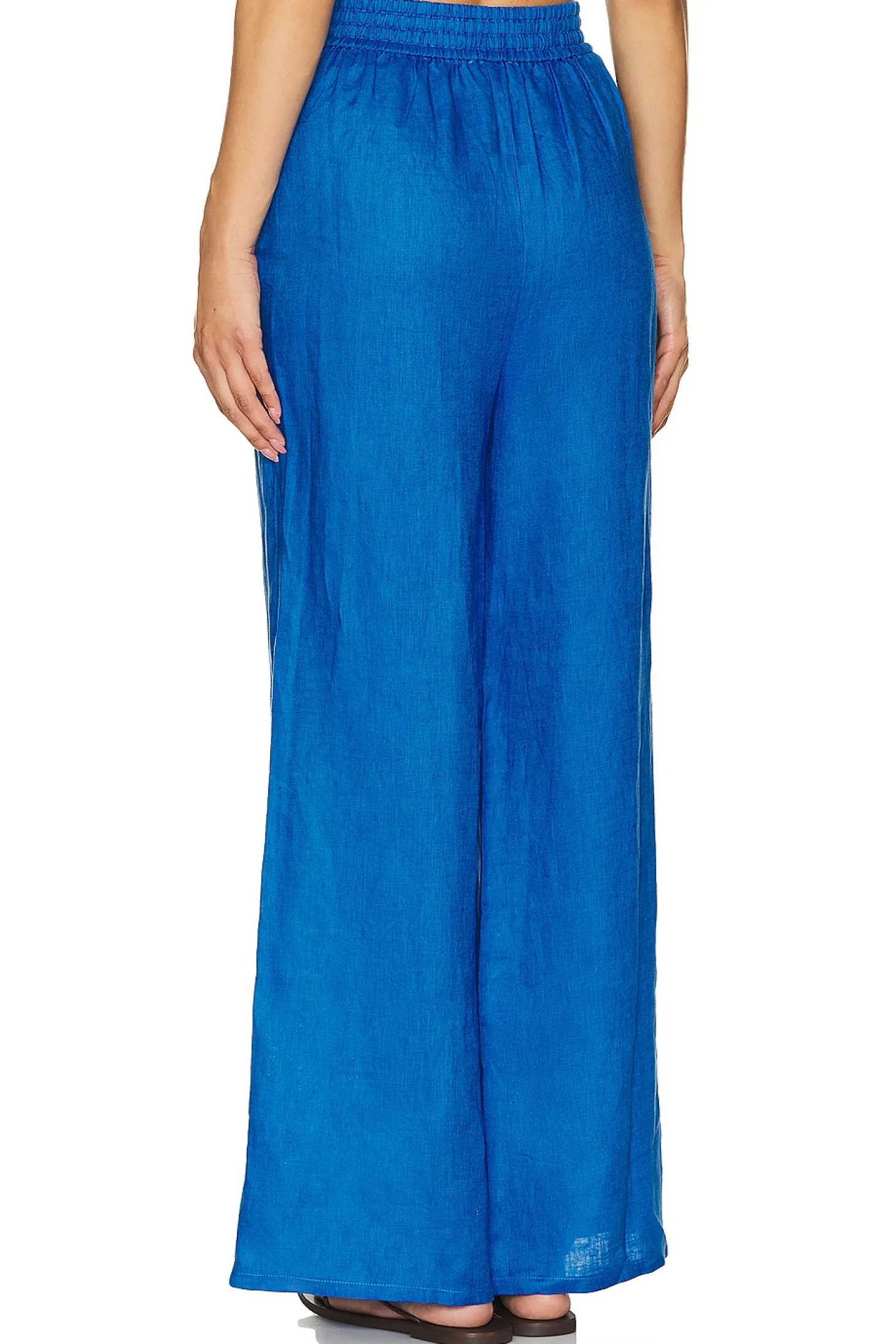 Self: 100% linen.Made in Vietnam.Hand wash.Hidden side zipper closure.23" at the knee breaks to 25" at the leg opening