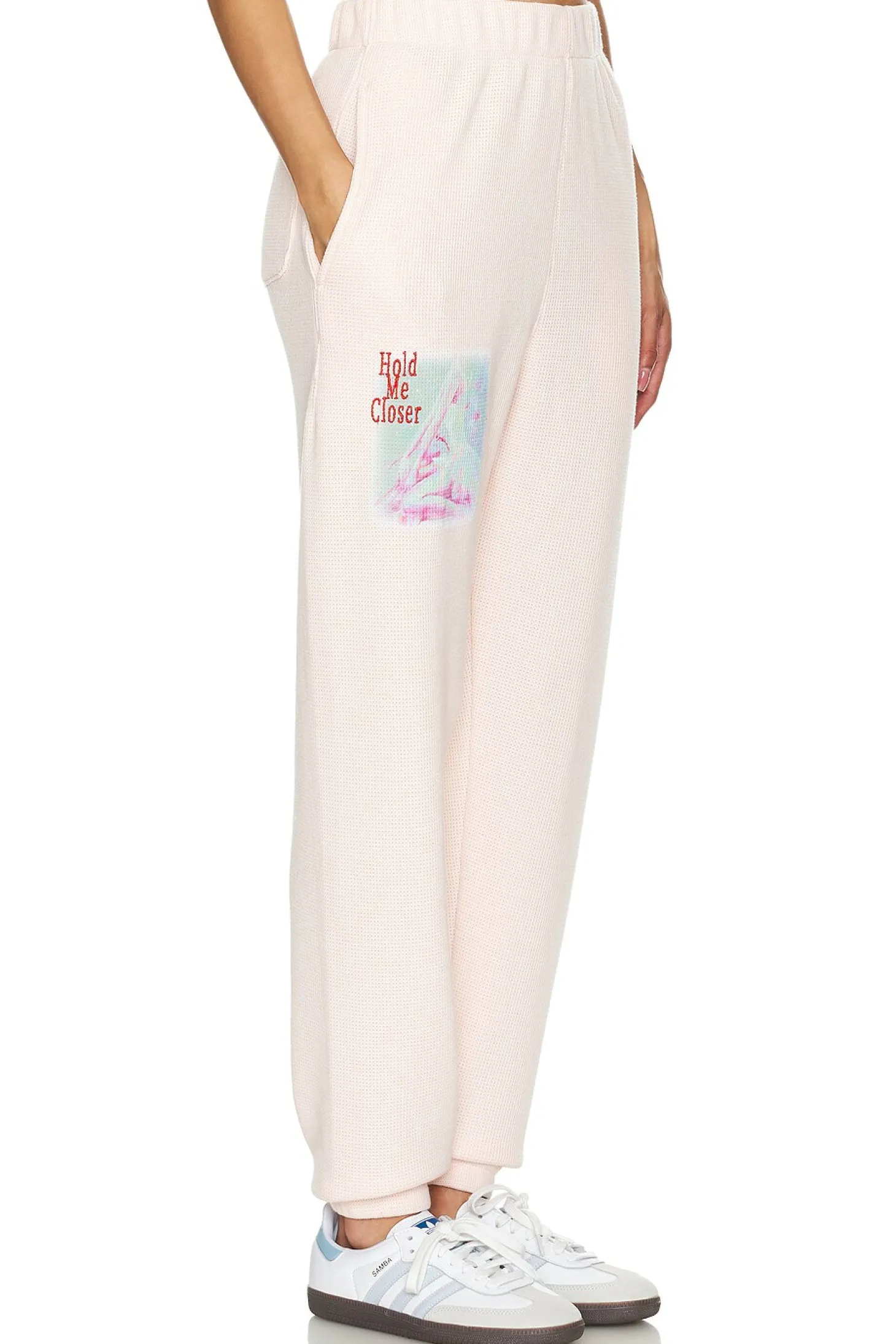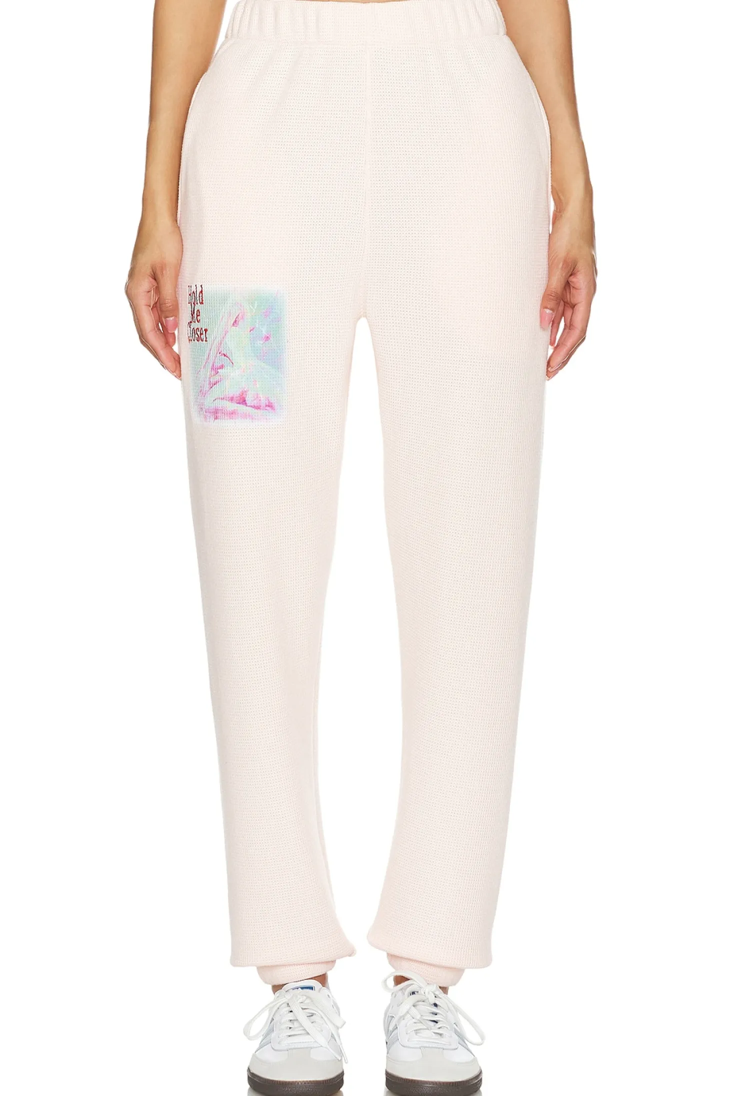 68% polyester 29% rayon 3% spandex.Made in China.Machine wash.Elastic waistband with side slit pockets.Single pouch pocket on back.Graphic detail on front and back.20" at the knee narrows to 10" at the leg opening