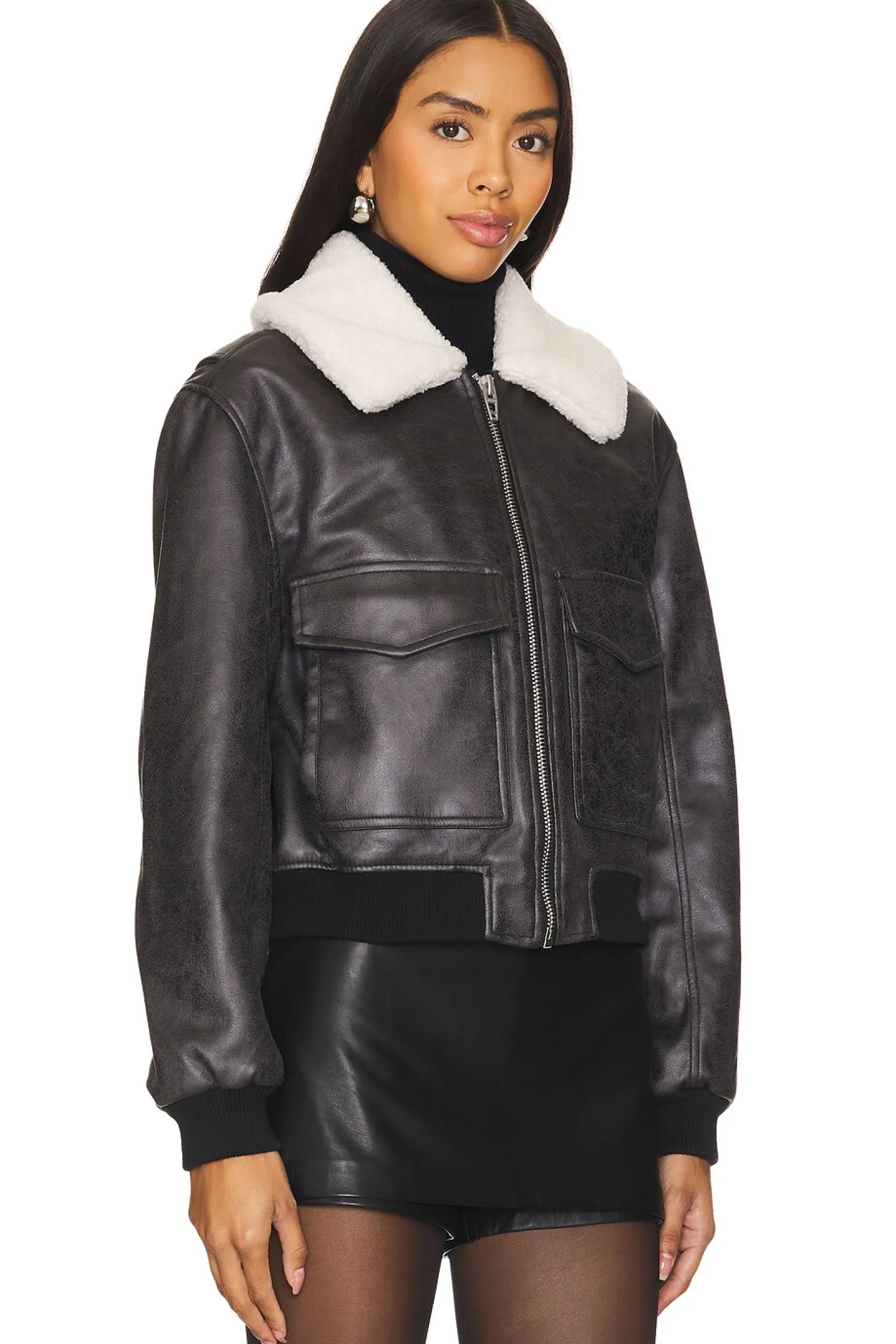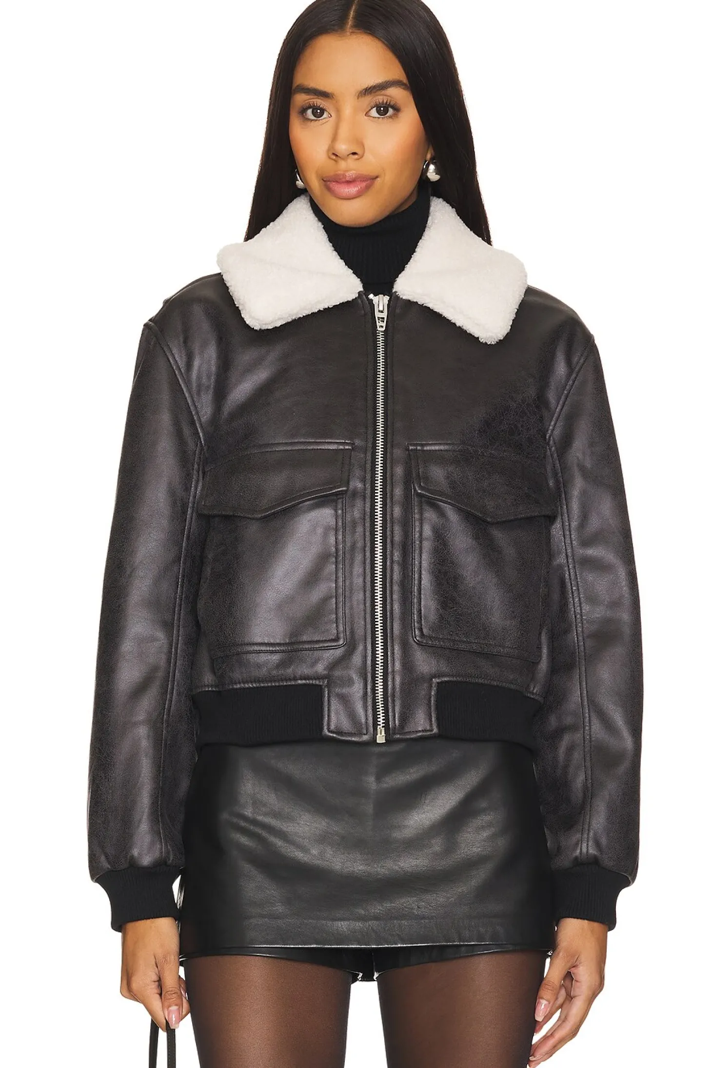 Self: 95% polyester 5% spandex Lining: 97% polyester 3% spandex Rib: 95% cotton 5% spandex Trim: 100% polyester.Made in China.Dry clean only.Front zipper closure.Side flap pockets.Sherpa collar.Faux leather fabric