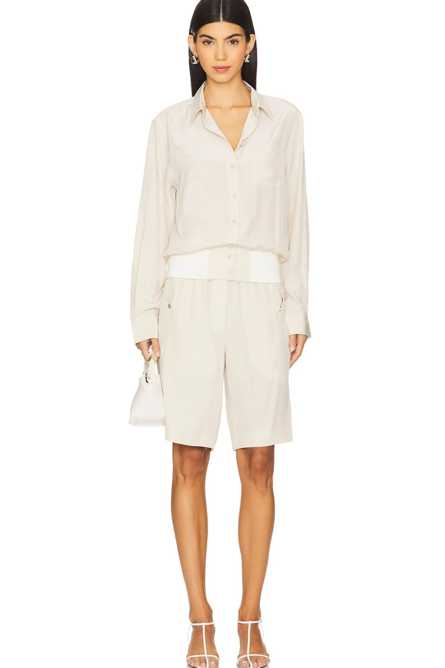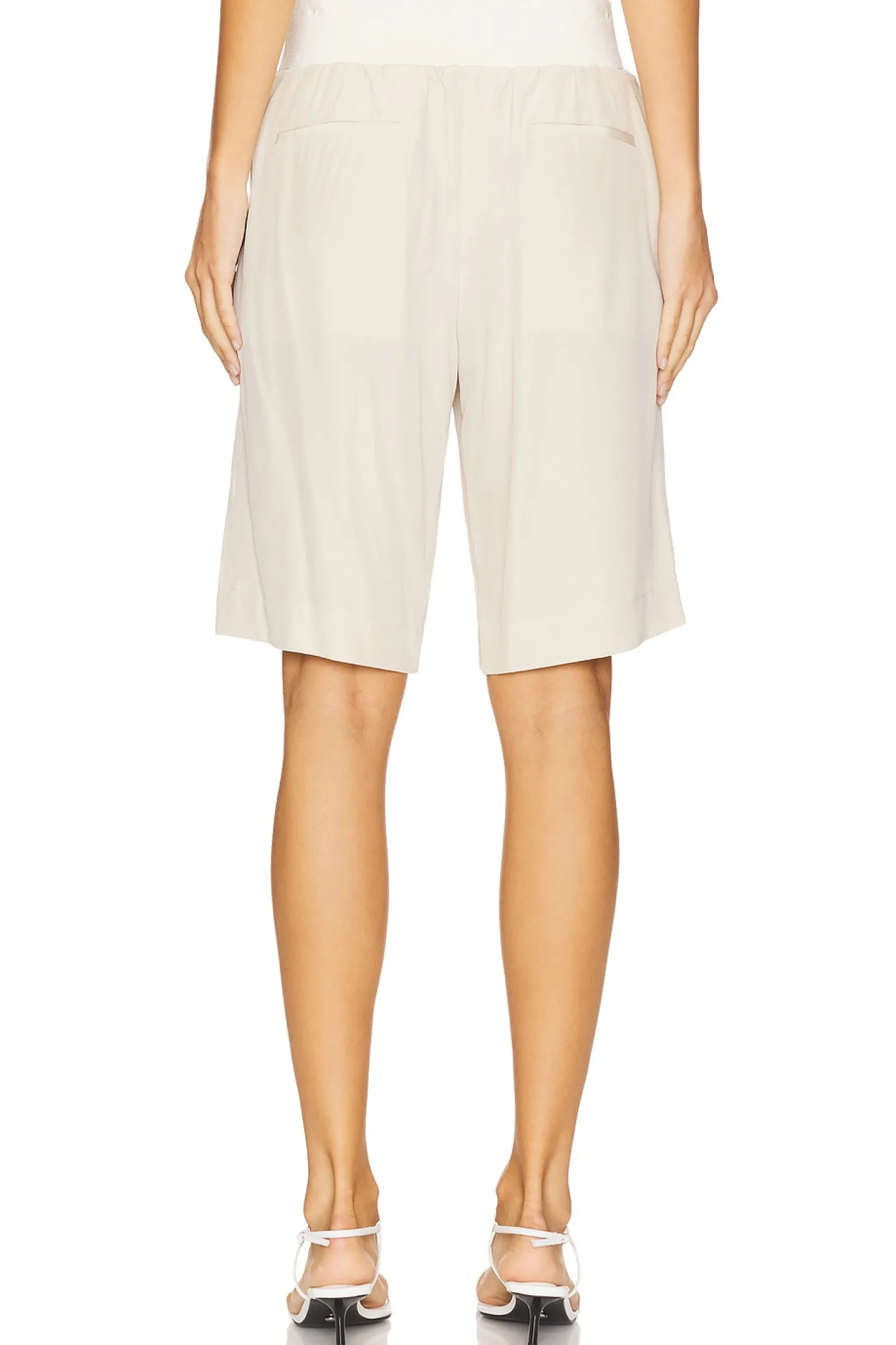 Self 1: 100% silk Self 2: 83% viscose 15% polyester 2% elastane.Made in China.Dry clean only.Pull-on styling with elastic waistband.Side flap pockets with snap button closure.Back welt pockets.Light-weight satin fabric.Shorts measure approx 21" in length