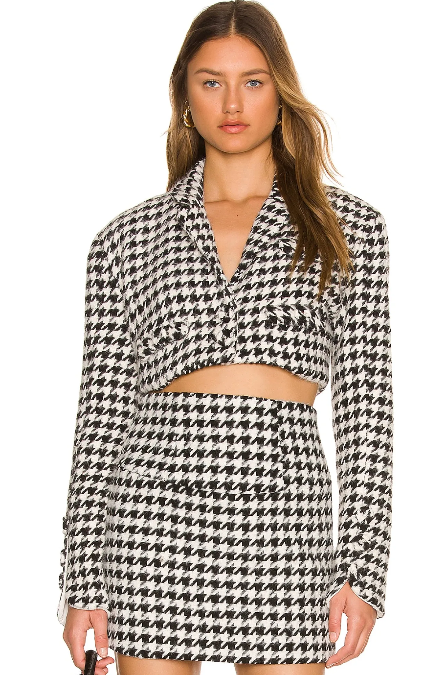 Poly blend.Imported.Dry clean recommended.Front button closure.Front flap pockets.Notched cuffs with faux button closures.Tweed fabric.Item not sold as a set