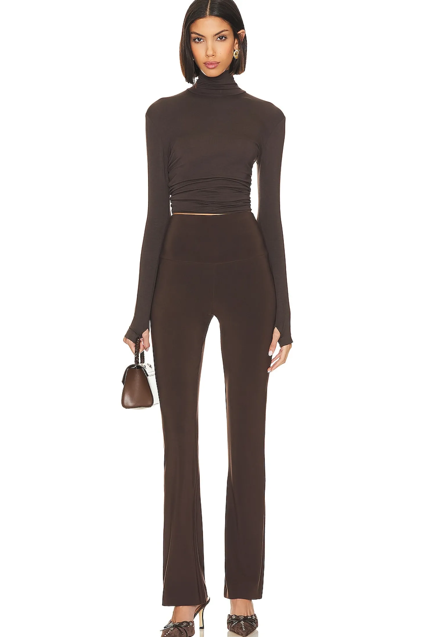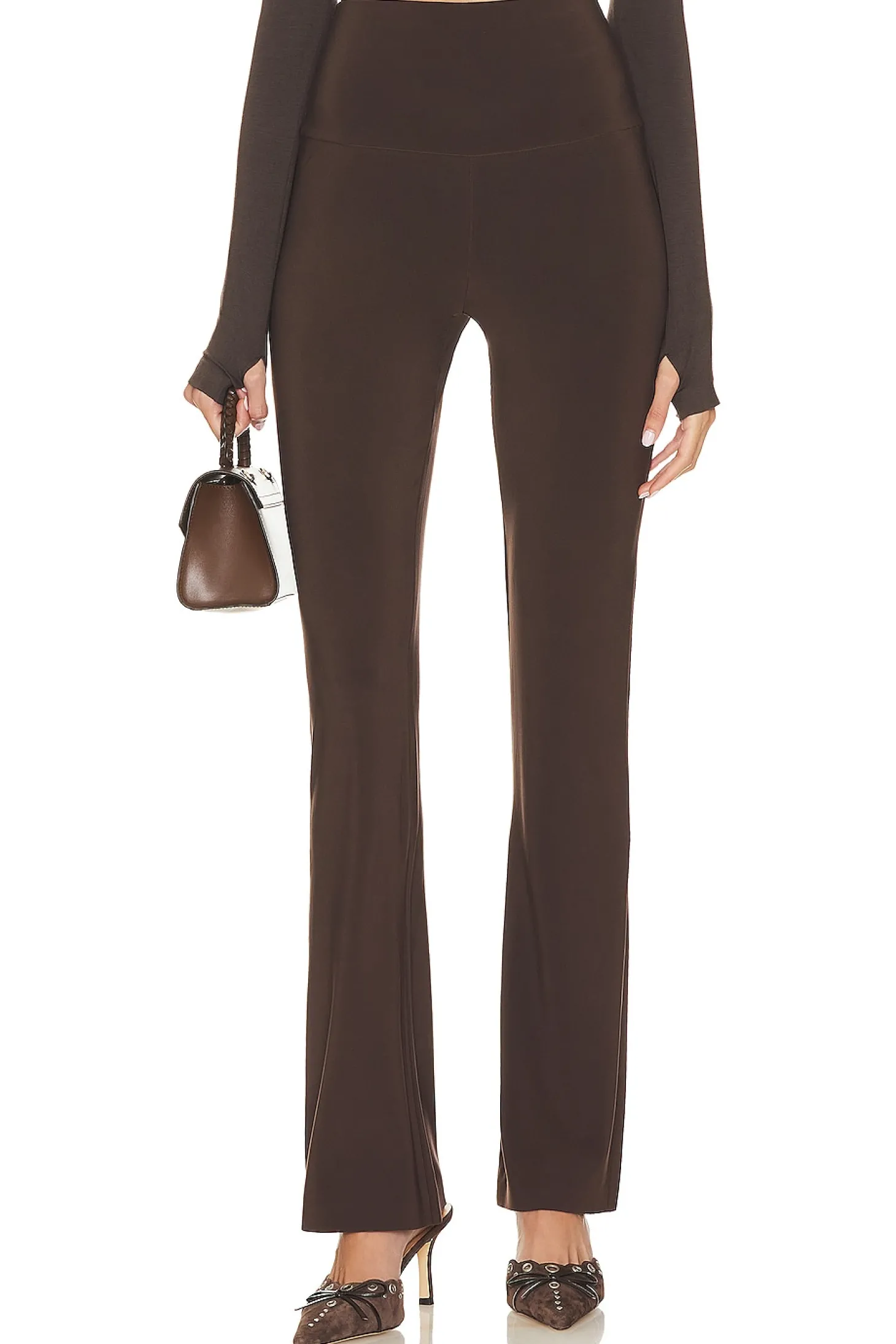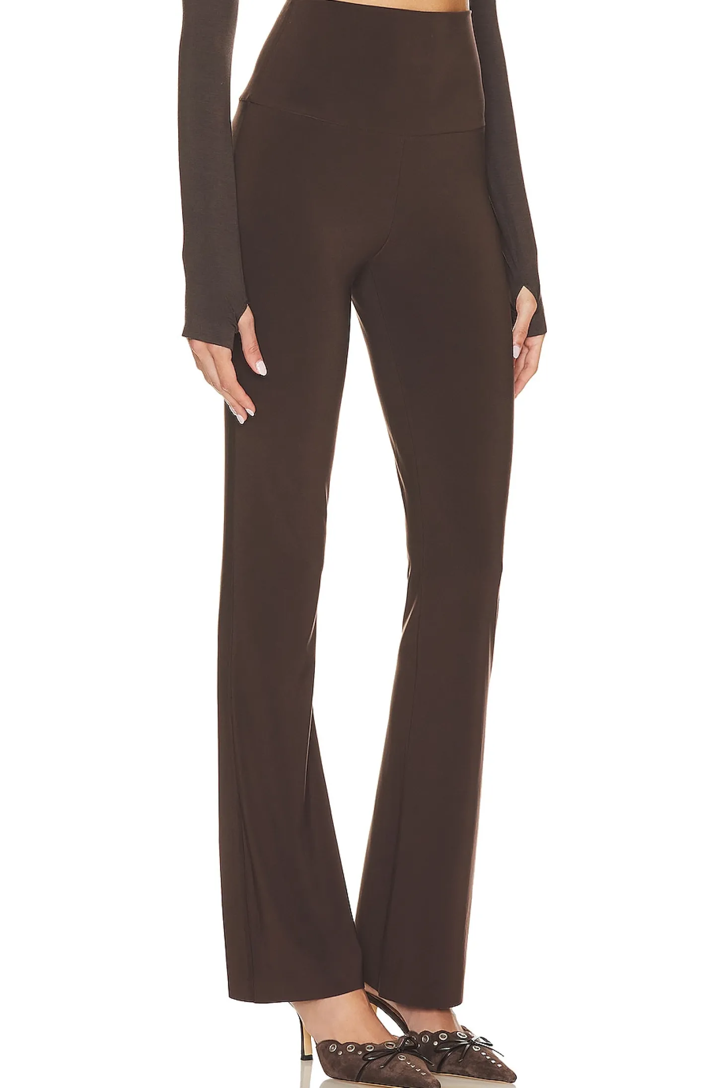 Elevate your fall fashion with Norma Kamali's Chocolate Boot Pant. These high-waisted, tailored pants are figure-flattering and perfect for the season, adding a touch of sophistication to your autumn wardrobe..95% polyester 5% spandex.Made in China.Machine wash.Pull-on styling with wide stretch waistband.Lightweight slinky jersey fabric.Item not sold as a set.14" at the knee breaks to 18" at the leg opening.style runs large, size down