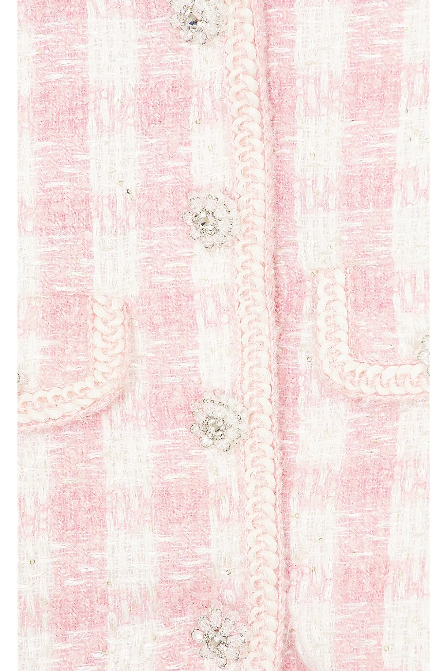 Self: 91% polyester 8% cotton 3% wool 1% viscose Lining: 100% polyester.Made in China.Dry clean only.Crystal-embellished front button closure.Breast button pockets.Button cuffs.Tweed fabric with bouclé detail.Item not sold as set