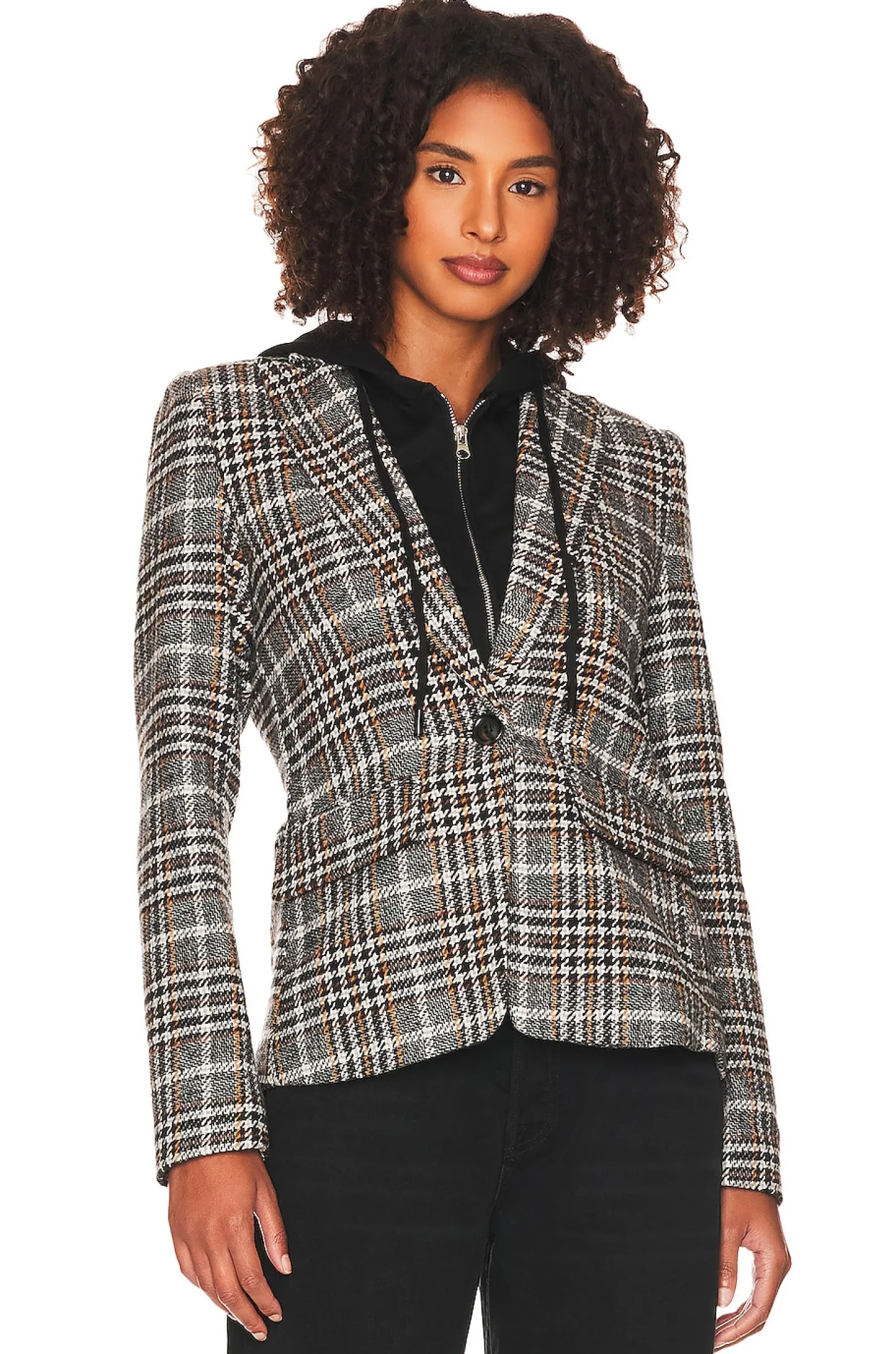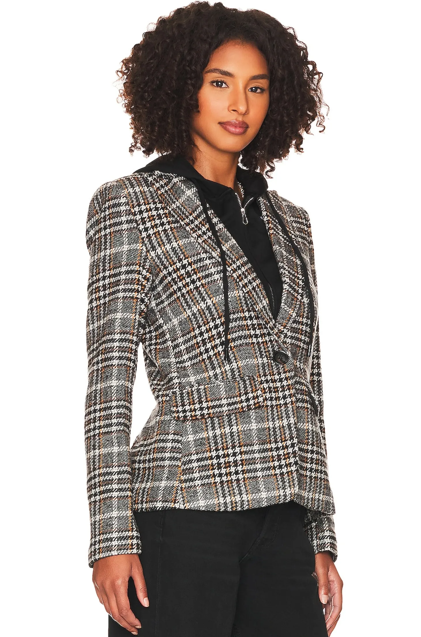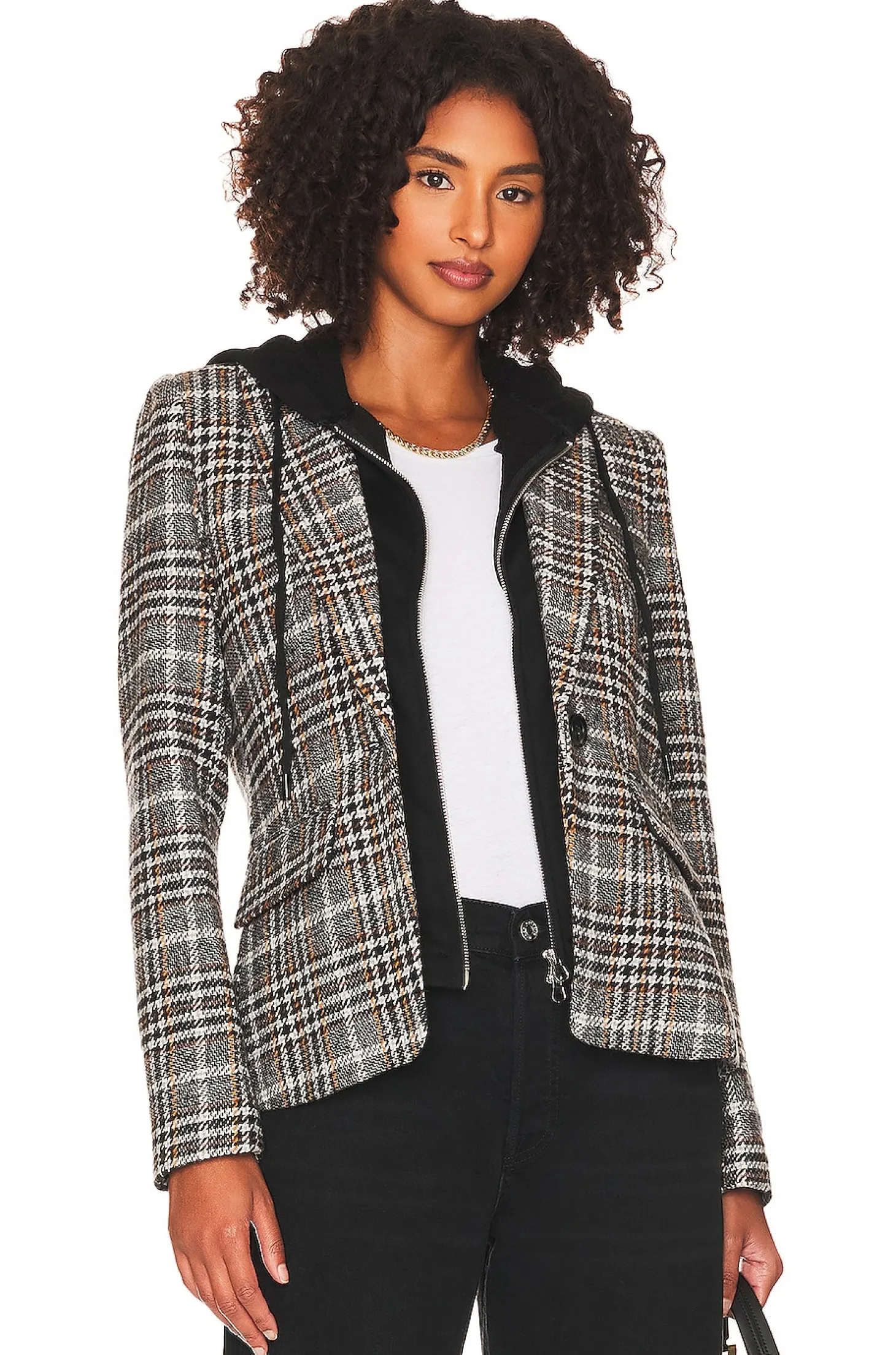 Self & Lining: 100% polyester Contrast Fabric: 80% polyester 20% rayon.Made in China.Dry clean only.Front button closure.Detachable zipper hoodie.Front flap pockets.Back vent