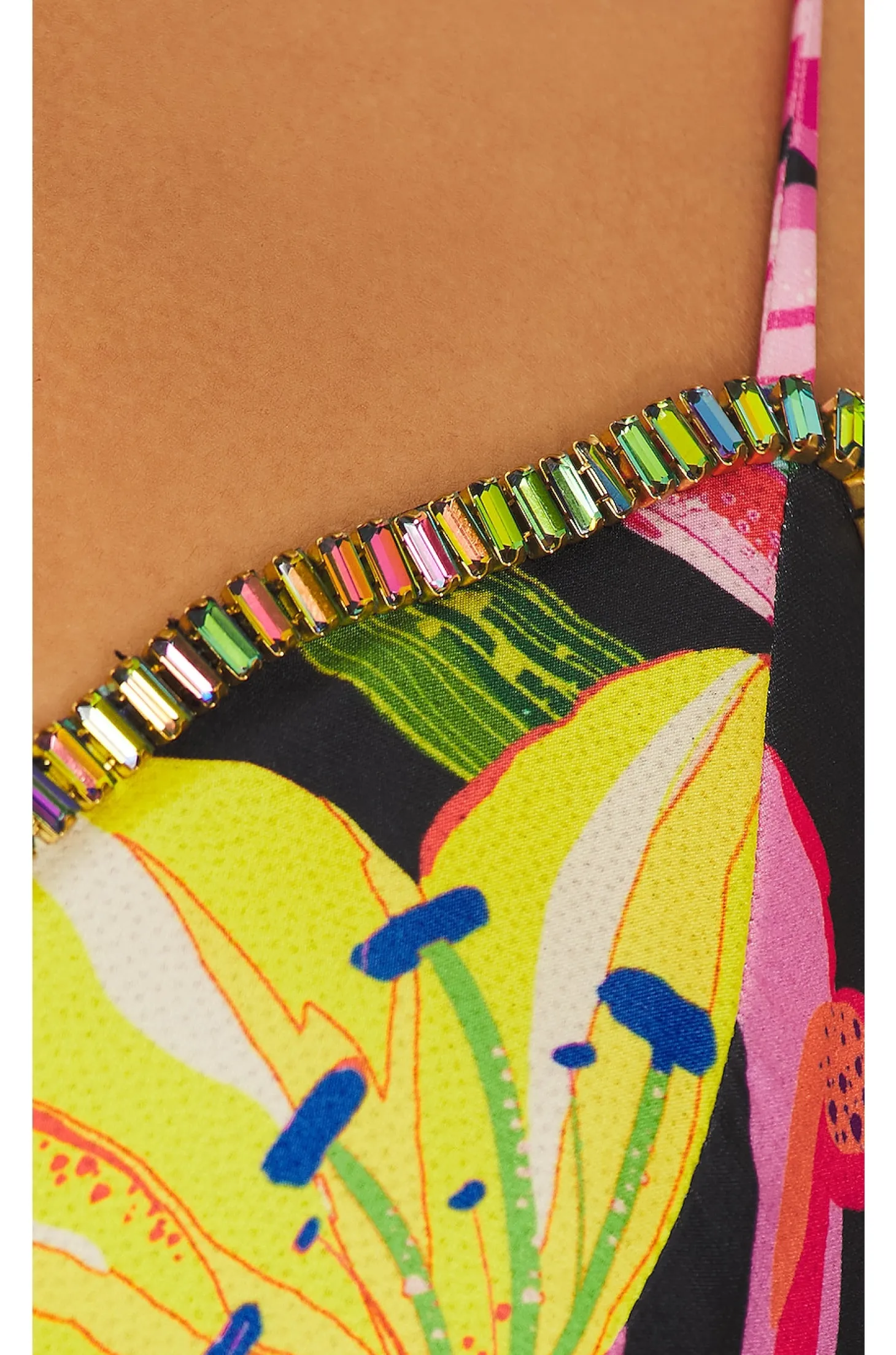 98% polyester 2% lycra.Made in India.Dry clean only.Unpadded.Back clasp closure.Adjustable shoulder straps.Iridescent crystal embellishments at neckline.Item not sold as set