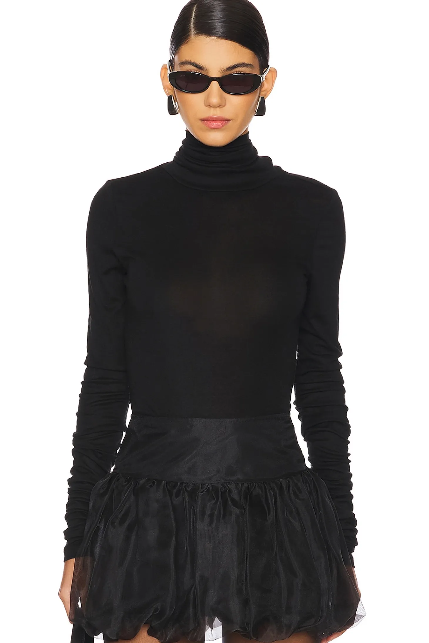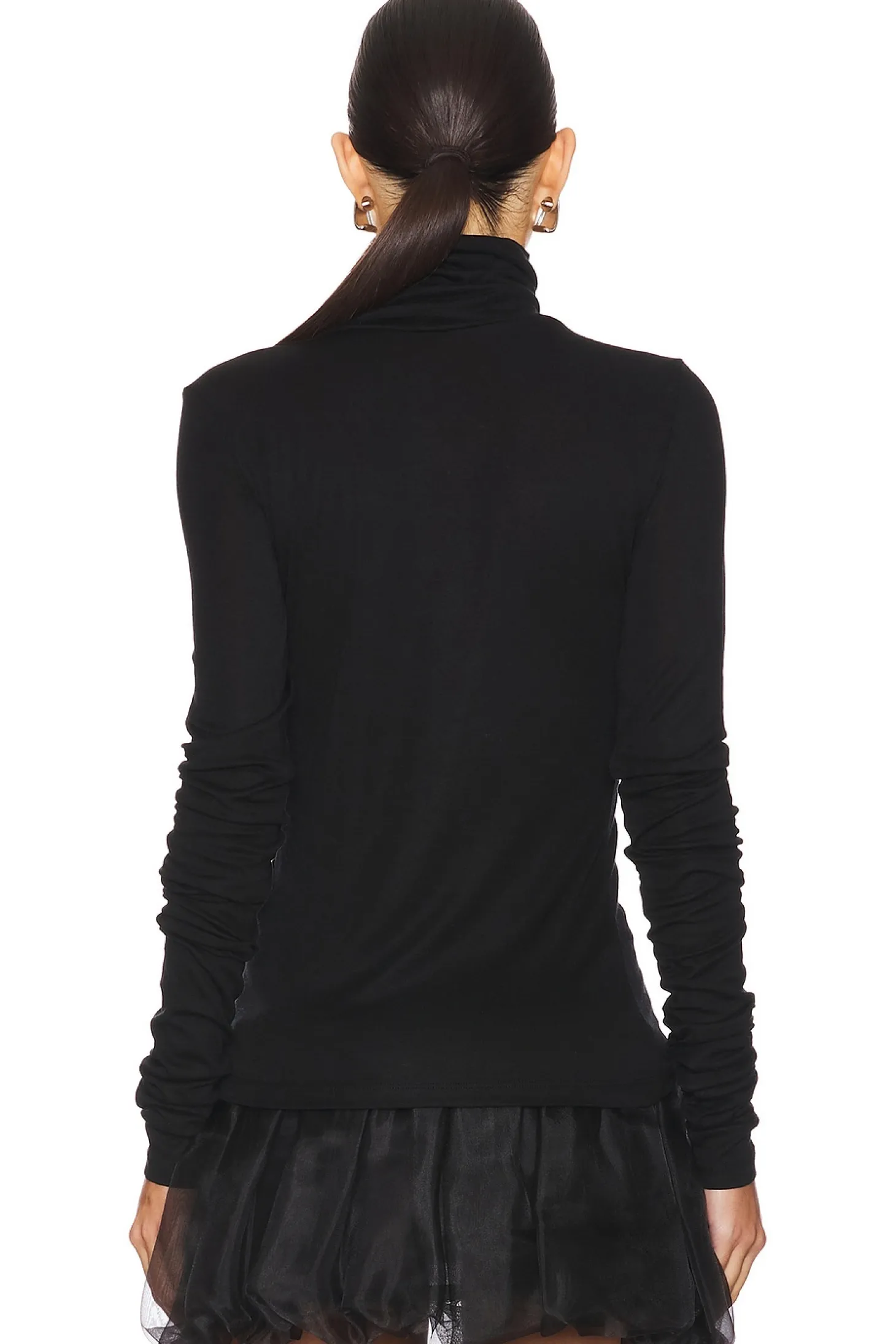 76% lyocell 19% wool 5% elastane.Made in China.Hand wash.Pull-on styling.Turtleneck styling.Lightweight knit fabric with intentional bunched sleeves