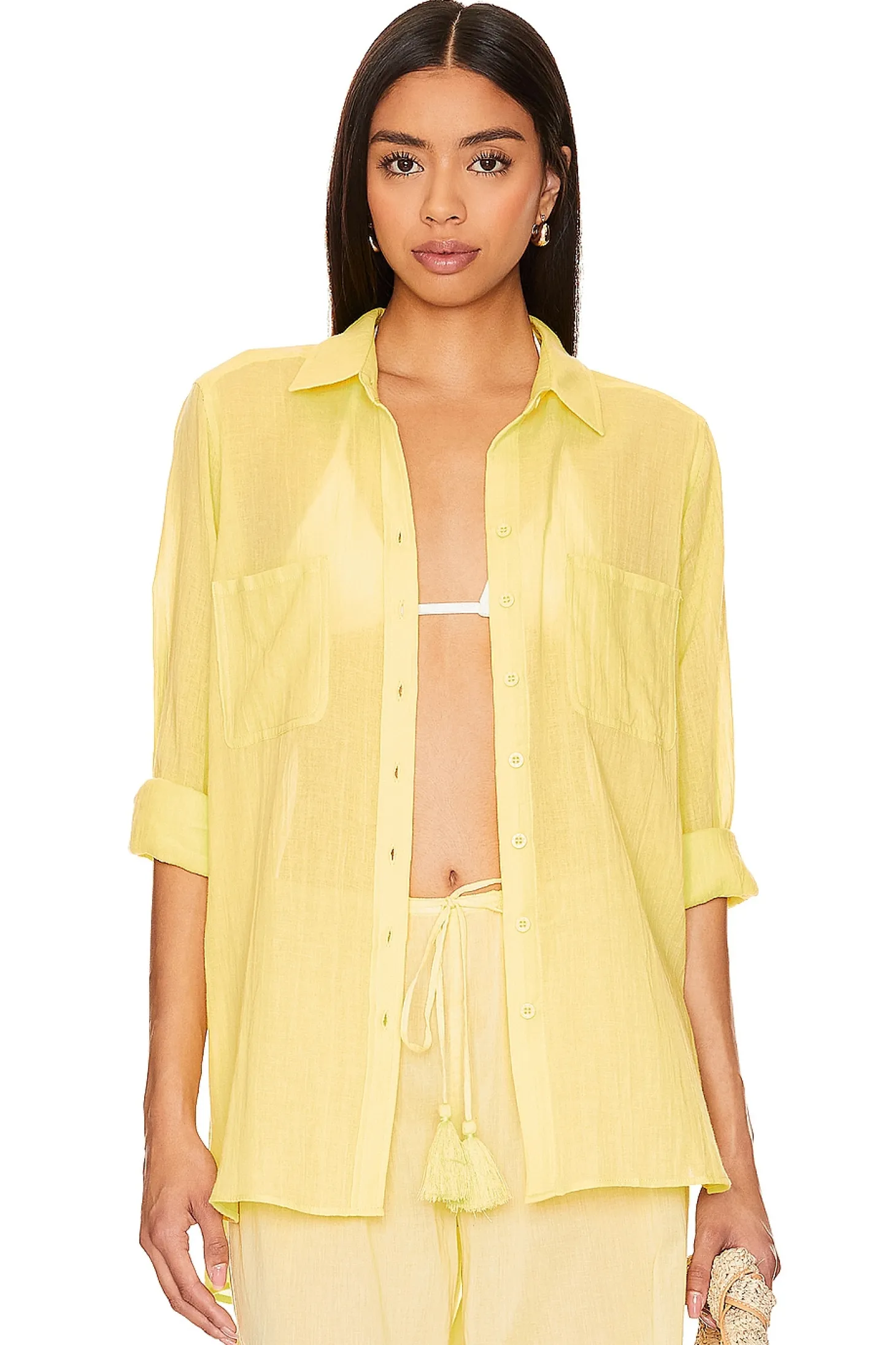 100% cotton.Made in China.Hand wash.Front button closure.Breast patch pockets.Lightweight gauze fabric.Item not sold as a set.Garment is made with a semi-sheer fabric, undergarments can show through