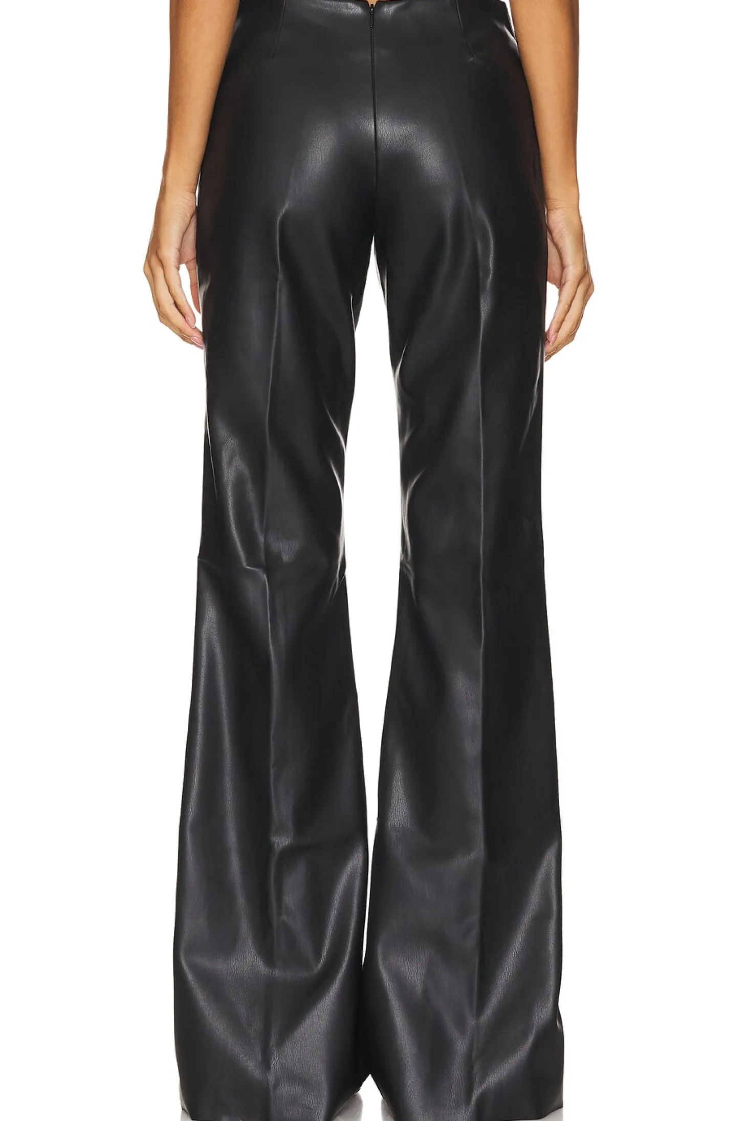 Self: 50% polyurethane 50% polyester.Made in Ukraine.Hand wash.Hidden back zipper closure.Heart cut-out design at hips.Faux leather fabric.18" at the knee breaks to 24" at the leg opening