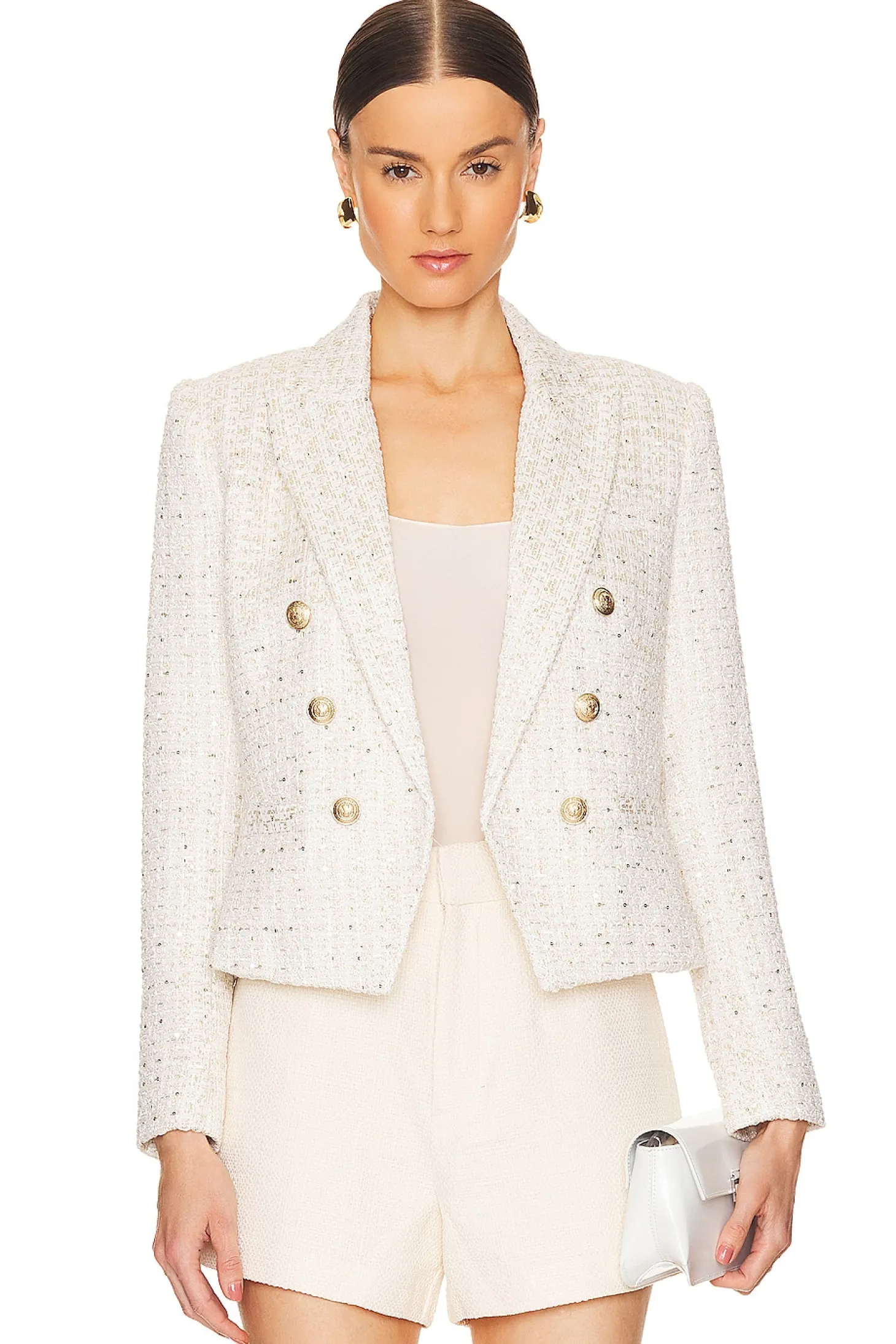 Self: 94% polyester 6% metallic Lining: 100% polyester.Made in China.Dry clean only.Open front.Padded shoulders.Front welt pockets.Midweight tweed fabric with gold-tone threading throughout