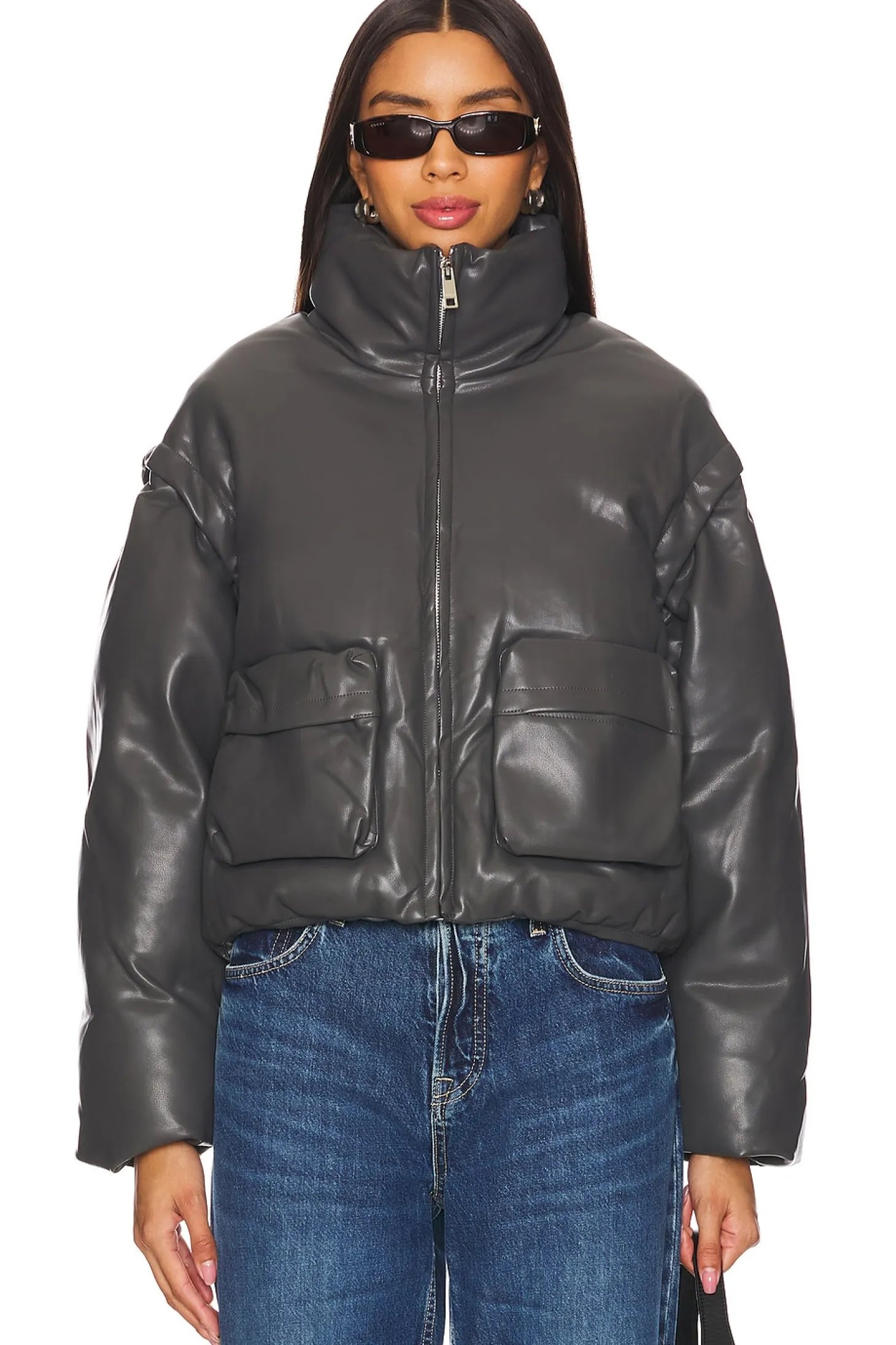 Self: 100% polyurethane Lining: 100% polyester.Made in China.Dry clean only.Front zip closure.Front slip pockets.Heavyweight faux leather fabric with optional and detachable sleeves with zip closure