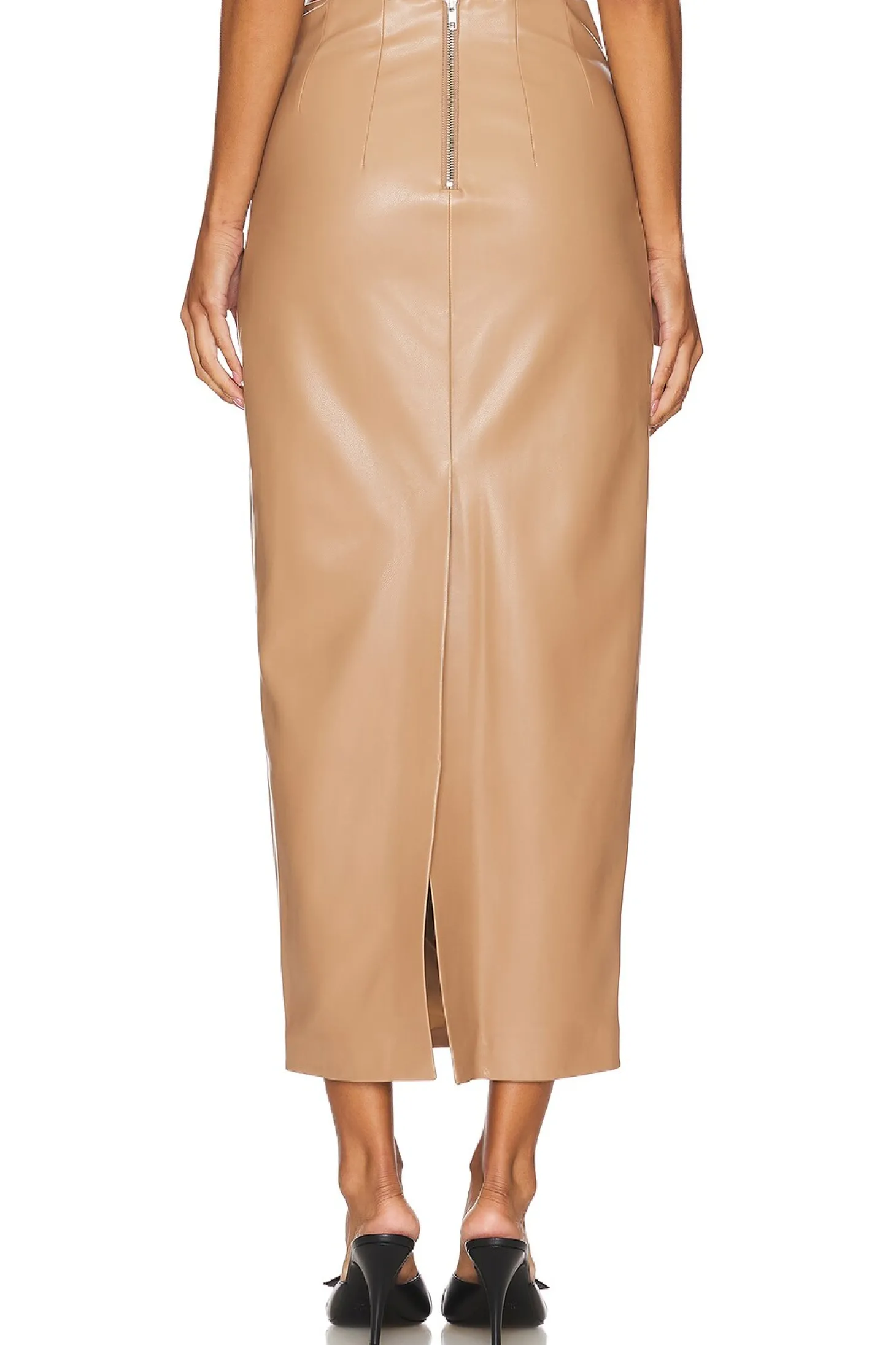 Self: 100% polyurethane Backing & Lining: 100% polyester.Made in China.Hand wash.Unlined.Exposed back zipper closure.Back vent.Smooth faux leather fabric Item not sold as a set.Skirt measures approx 36.5" in length