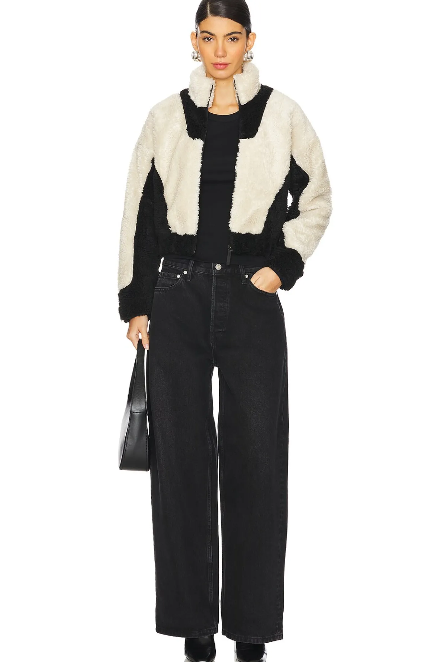 Self: 100% polyester Lining: 100% polyamide.Made in Moldova.Machine wash.Front zipper closure.Side slant zippered pockets.High pile fleece fabric with cinched hem and jersey cuffs