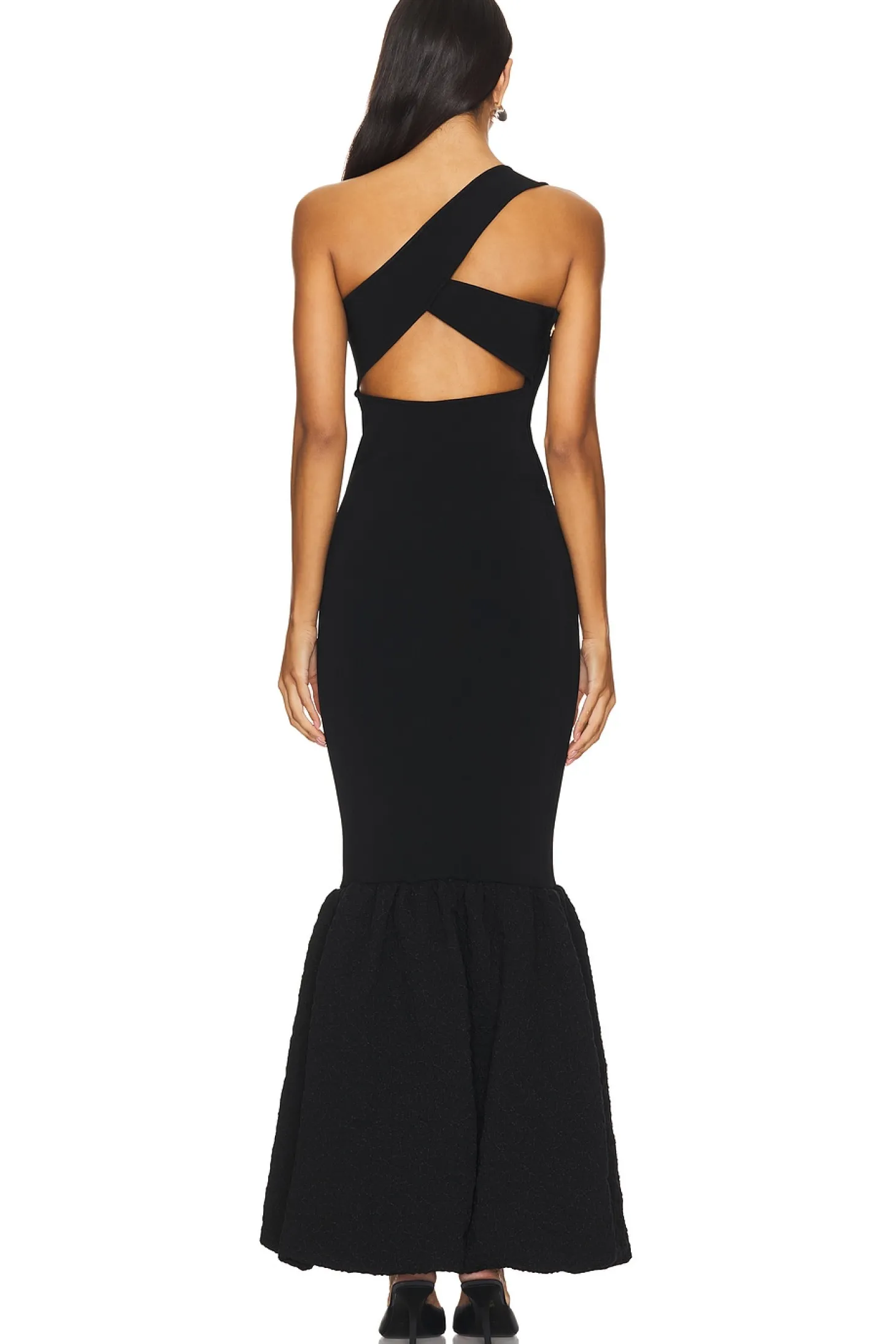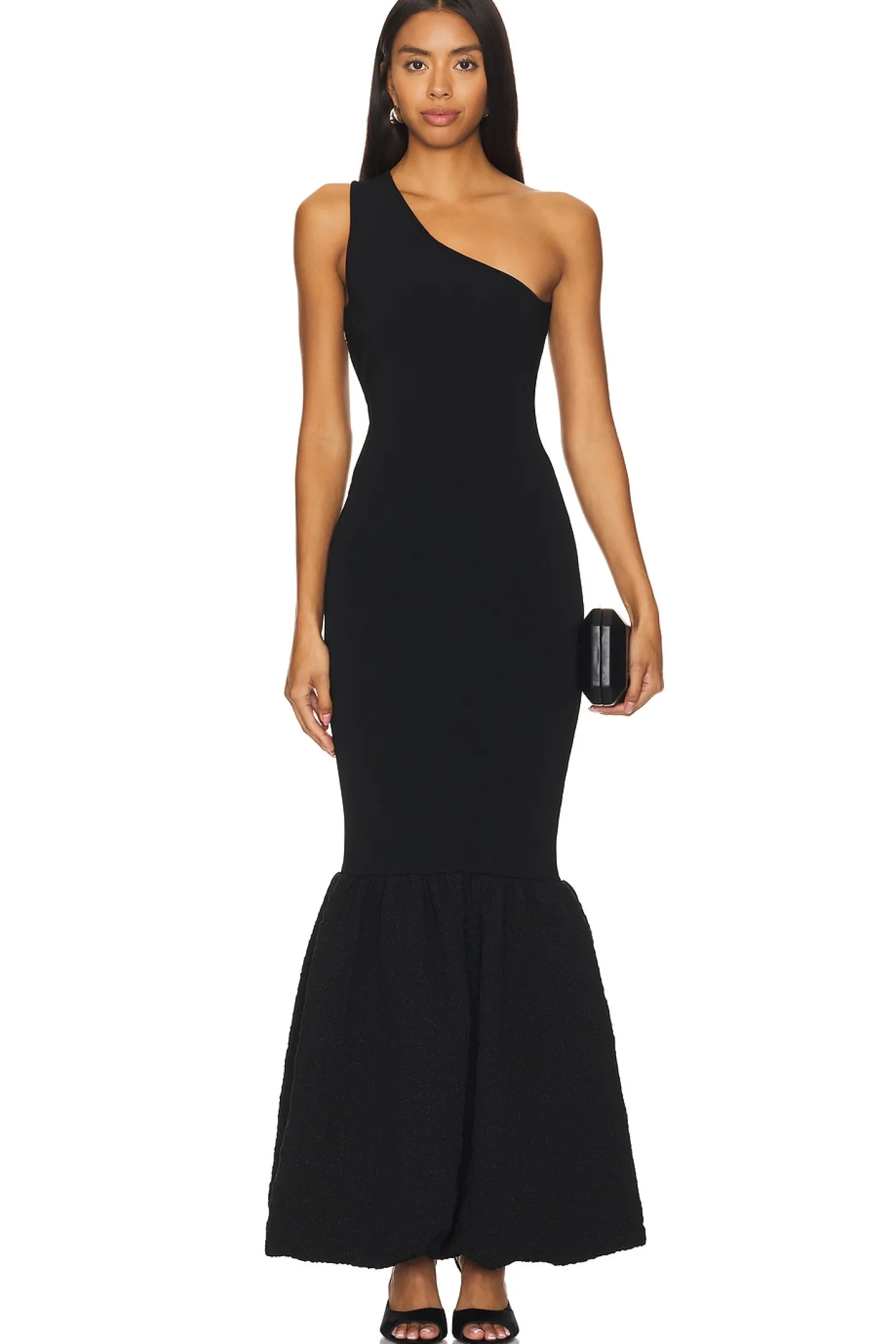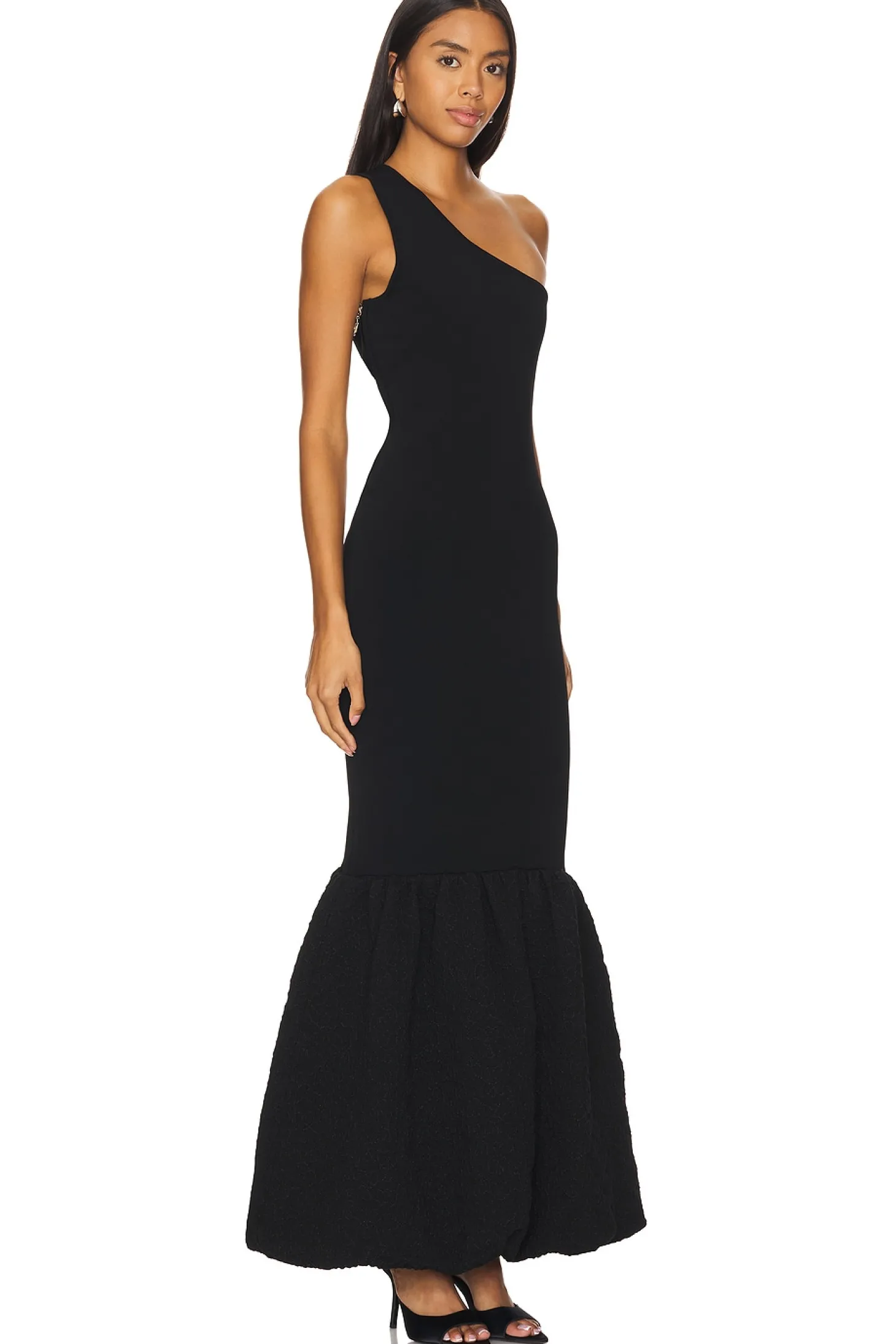 73% viscose 13% polyester 10% lycra 2% metalized fiber 2% nylon.Made in China.Dry clean only.Unlined.Exposed side zipper closure.One-shoulder design with cut-out detail at back.Ponte knit fabric with textured design at skirt
