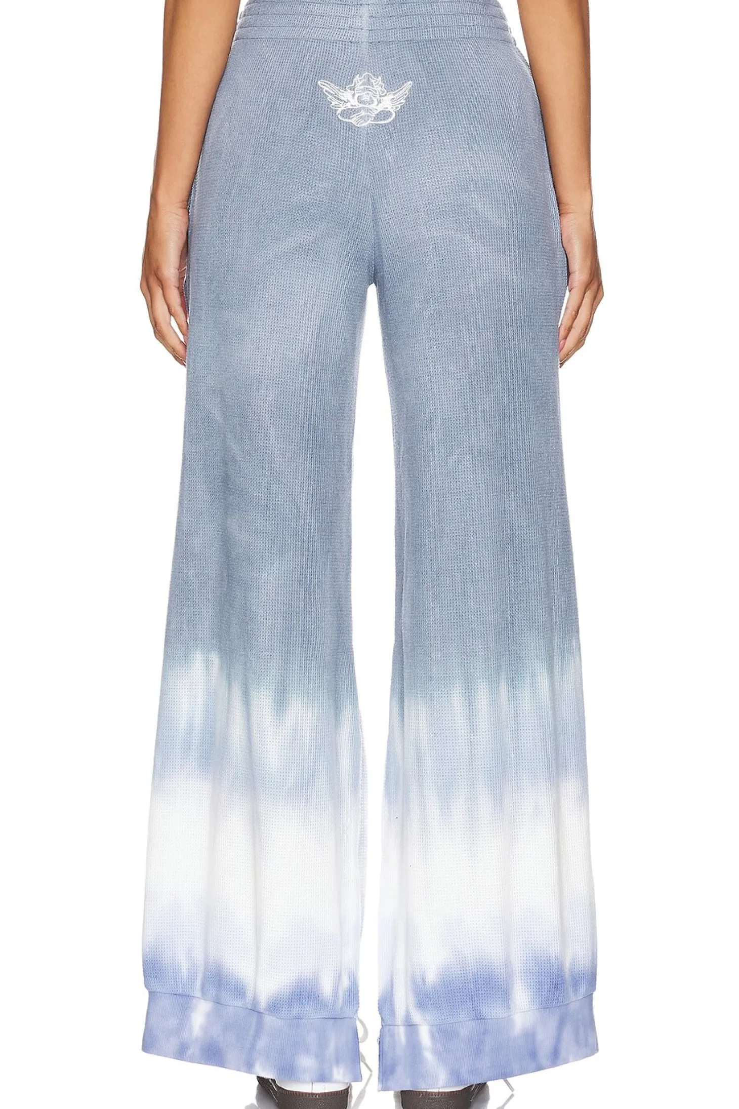 68% polyester 29% rayon 3% spandex.Made in China.Machine wash.Elastic waistband.Side pockets.Item not sold as set.Knit fabric with leg slits and front graphic.26" at the knee narrows to 21" at the leg opening