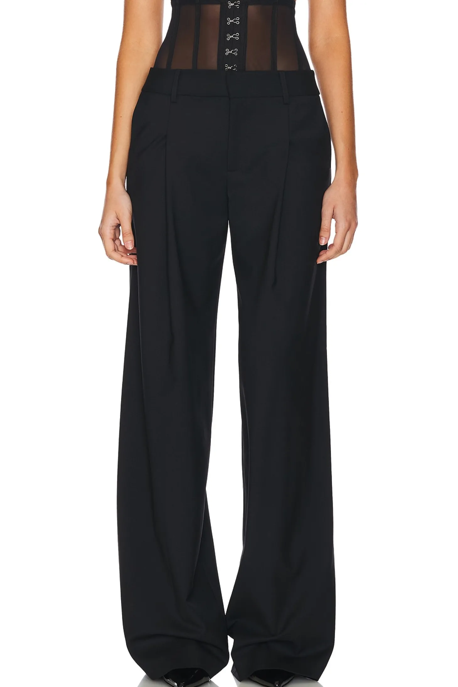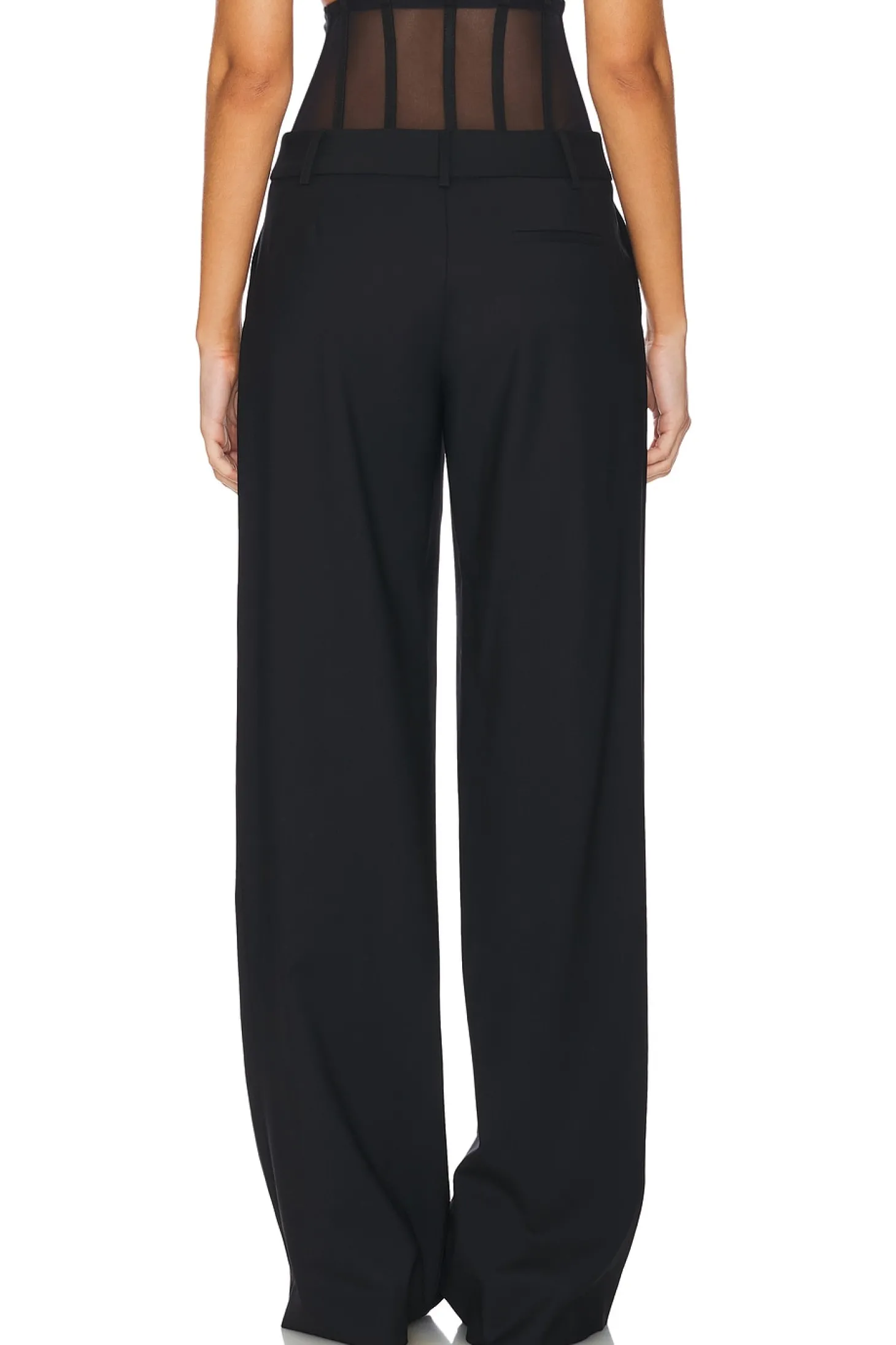 95% virgin wool 5% elastane.Made in USA.Dry clean.Zip fly with hook and bar closures.4 pocket styling.Attached boned corset detail with hook and eye closures.24" at the knee and 24" at the leg opening