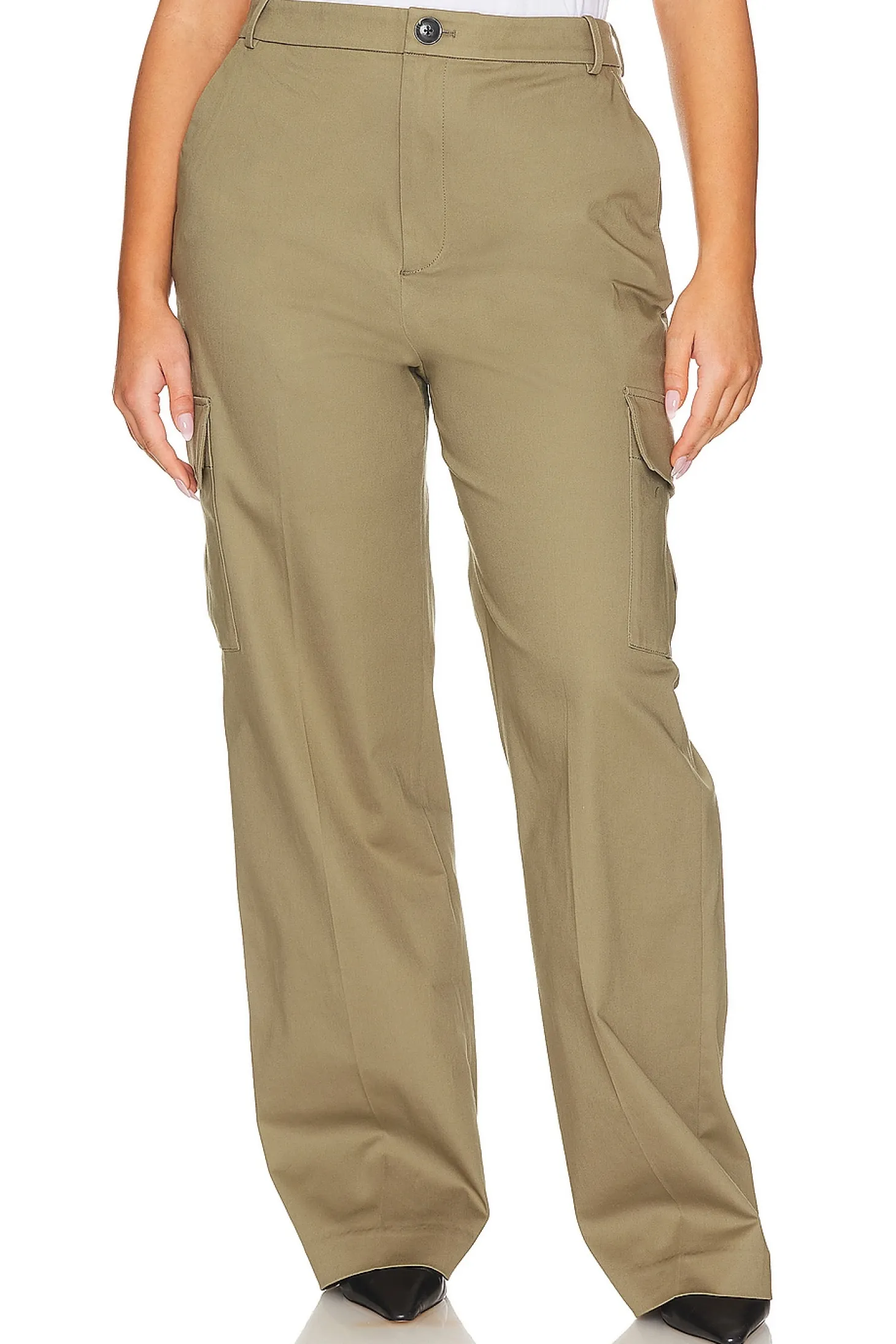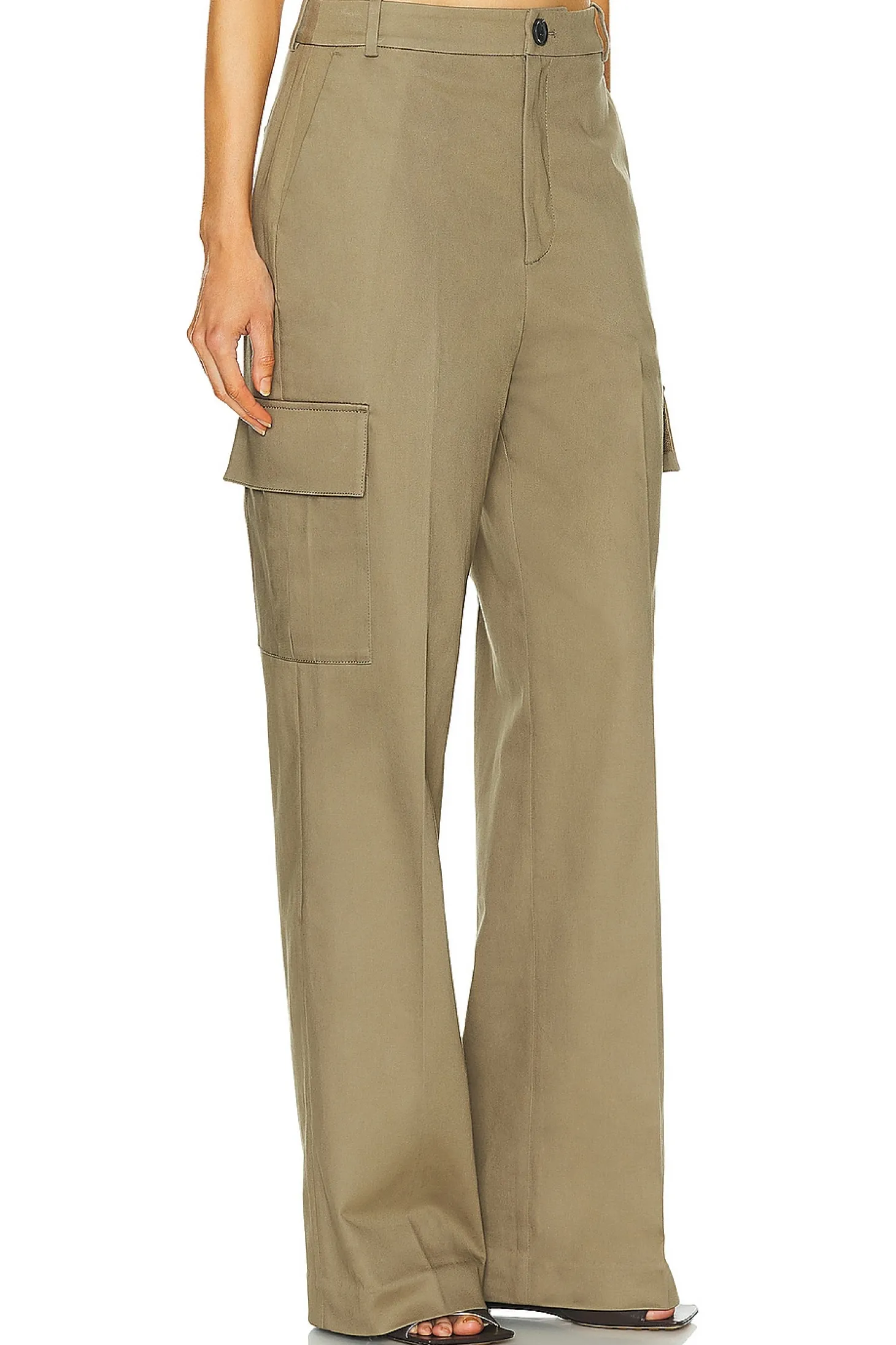 Self: 97% cotton 3% elastane Lining: 100% cotton.Made in China.Dry clean only.Zip fly with button closure.4-pocket design.Cargo pockets.Midweight twill fabric.20" at the knee narrows to 17" at the leg opening