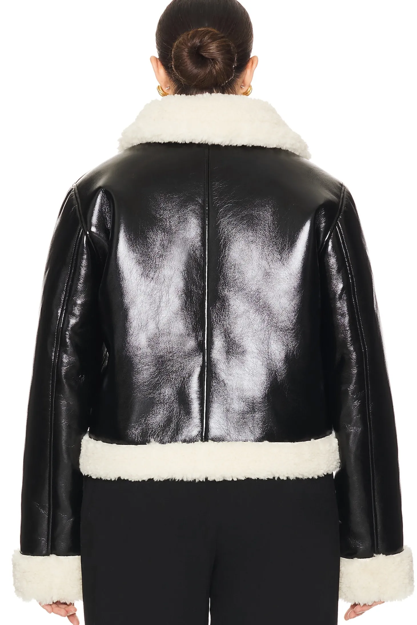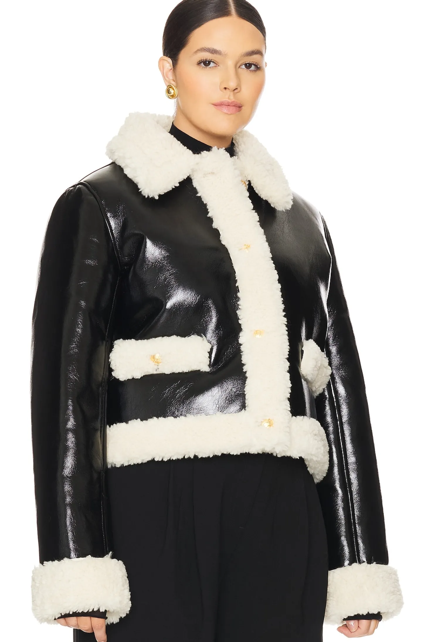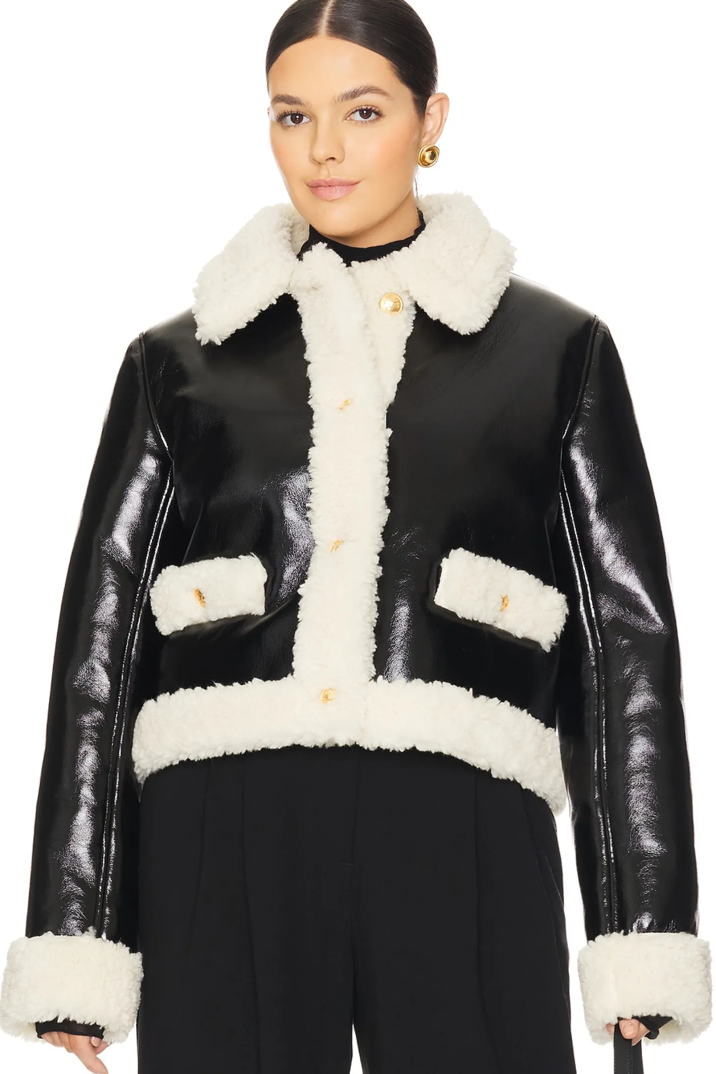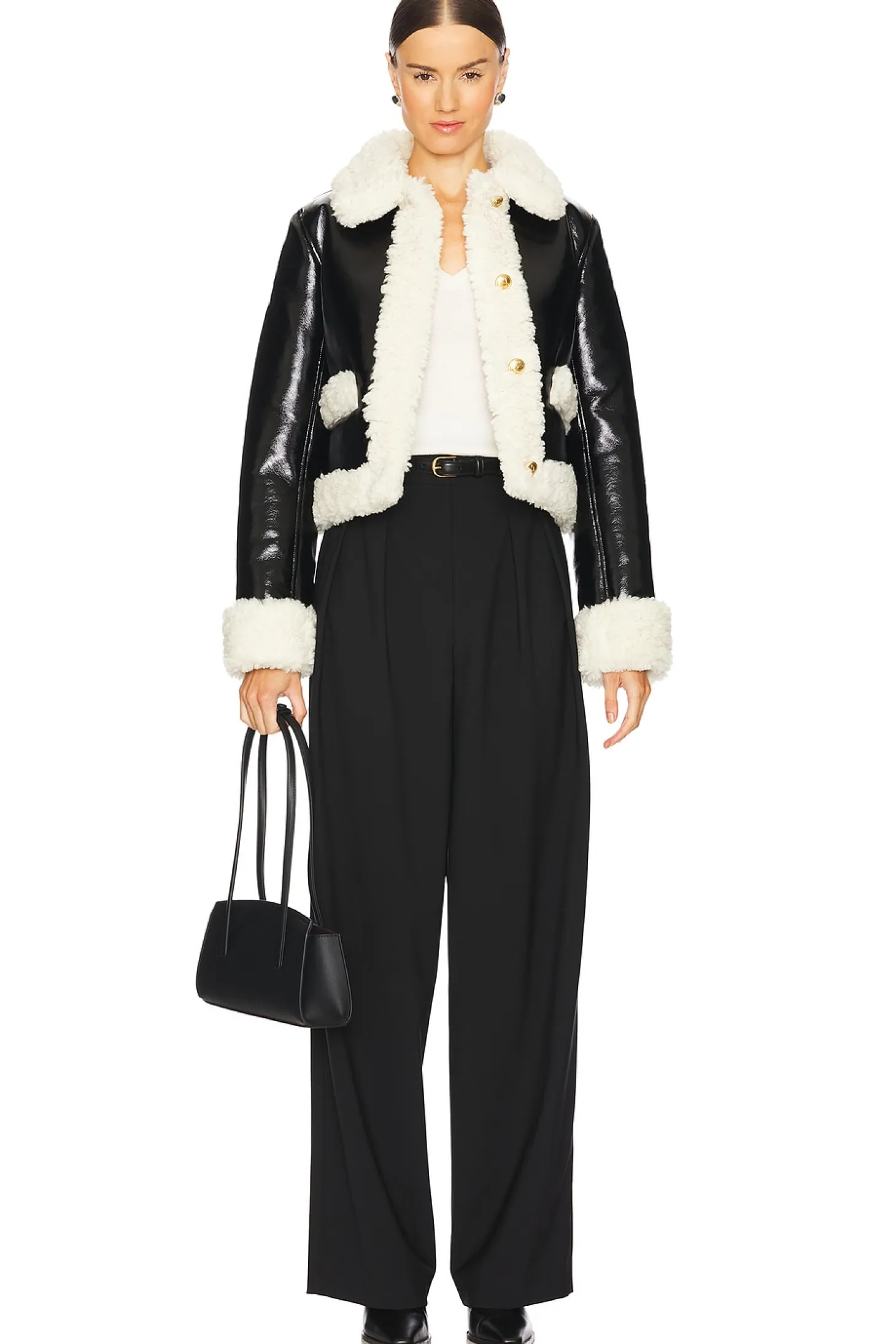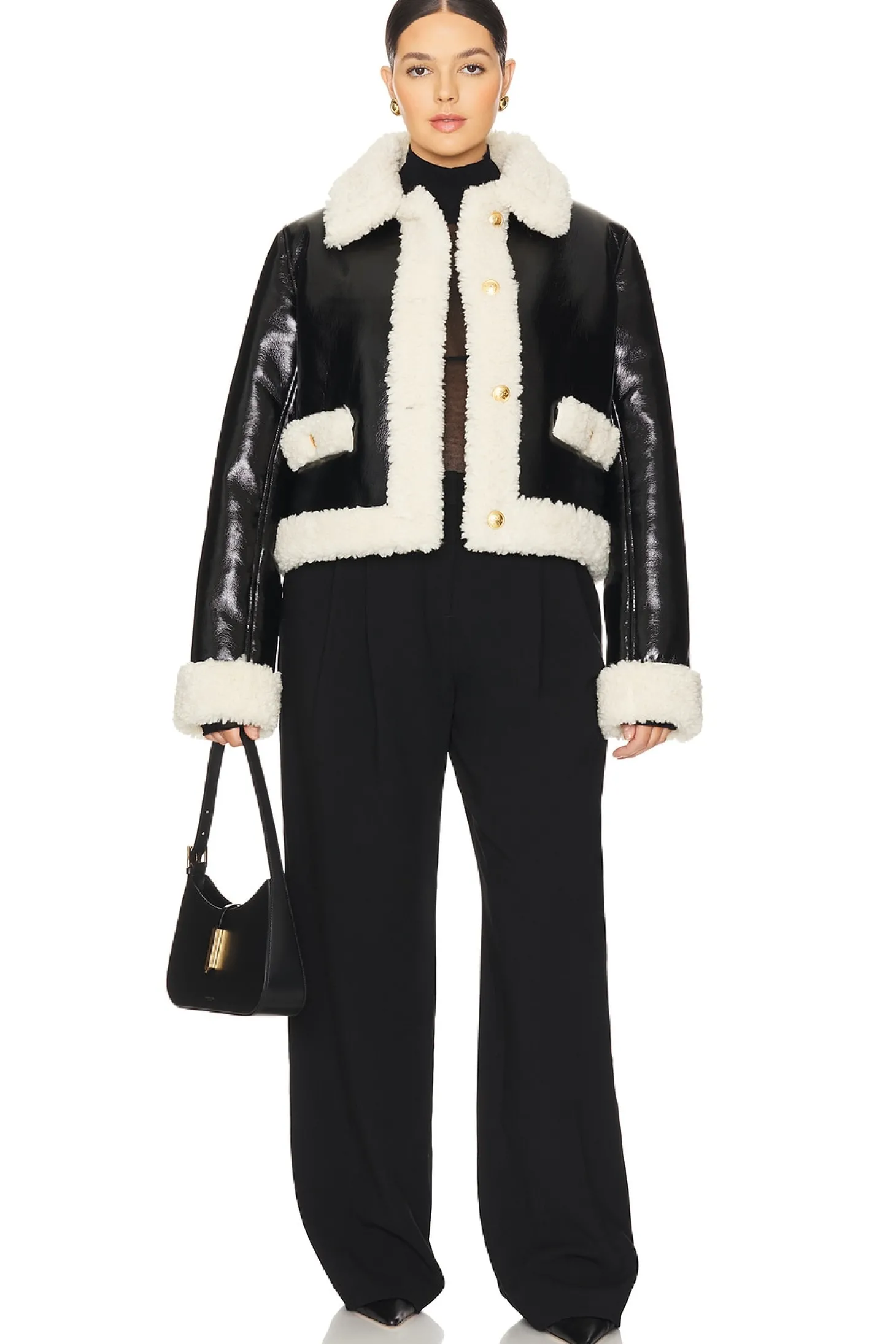 Self 1: 100% polyurethane Self 2: 100% polyester Faux Fur: 100% polyester.Made in China.Dry clean only.Front button closure.Front pockets.Faux fur lining.Faux leather