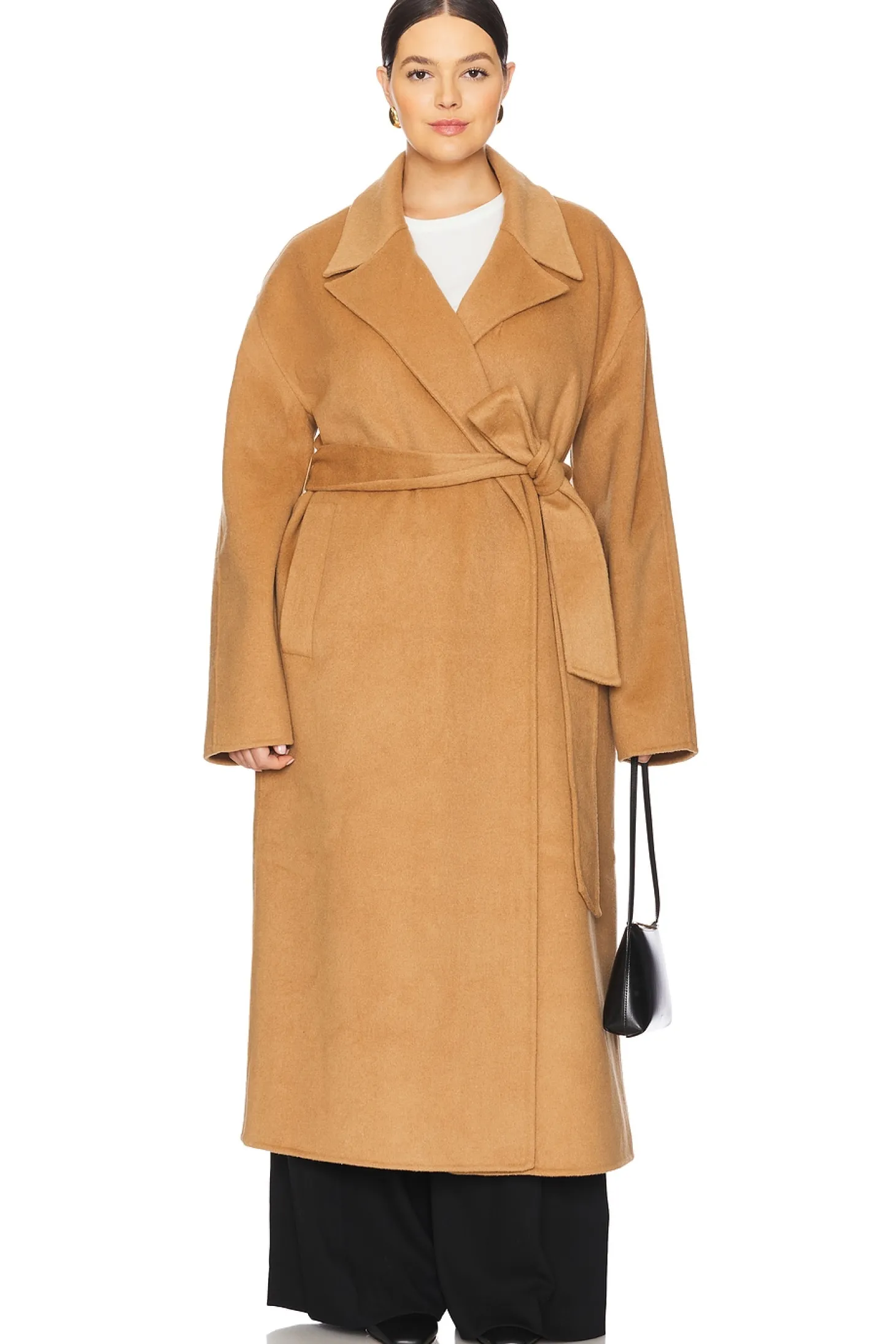 70% wool 30% polyester.Made in China.Dry clean only.Front tie-up closure.Side seam pockets.Optional belt at waist.Brushed twill fabric with back vent