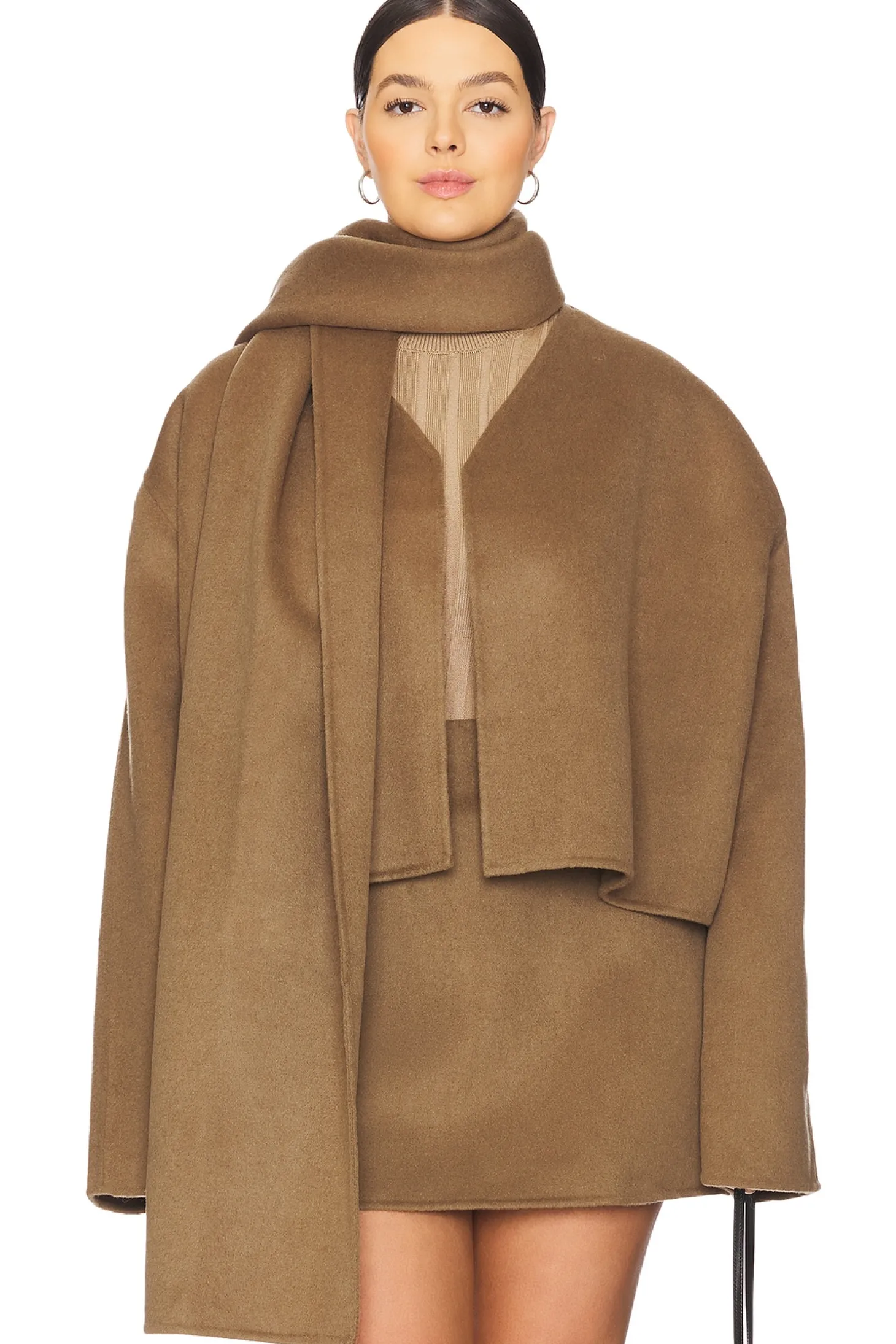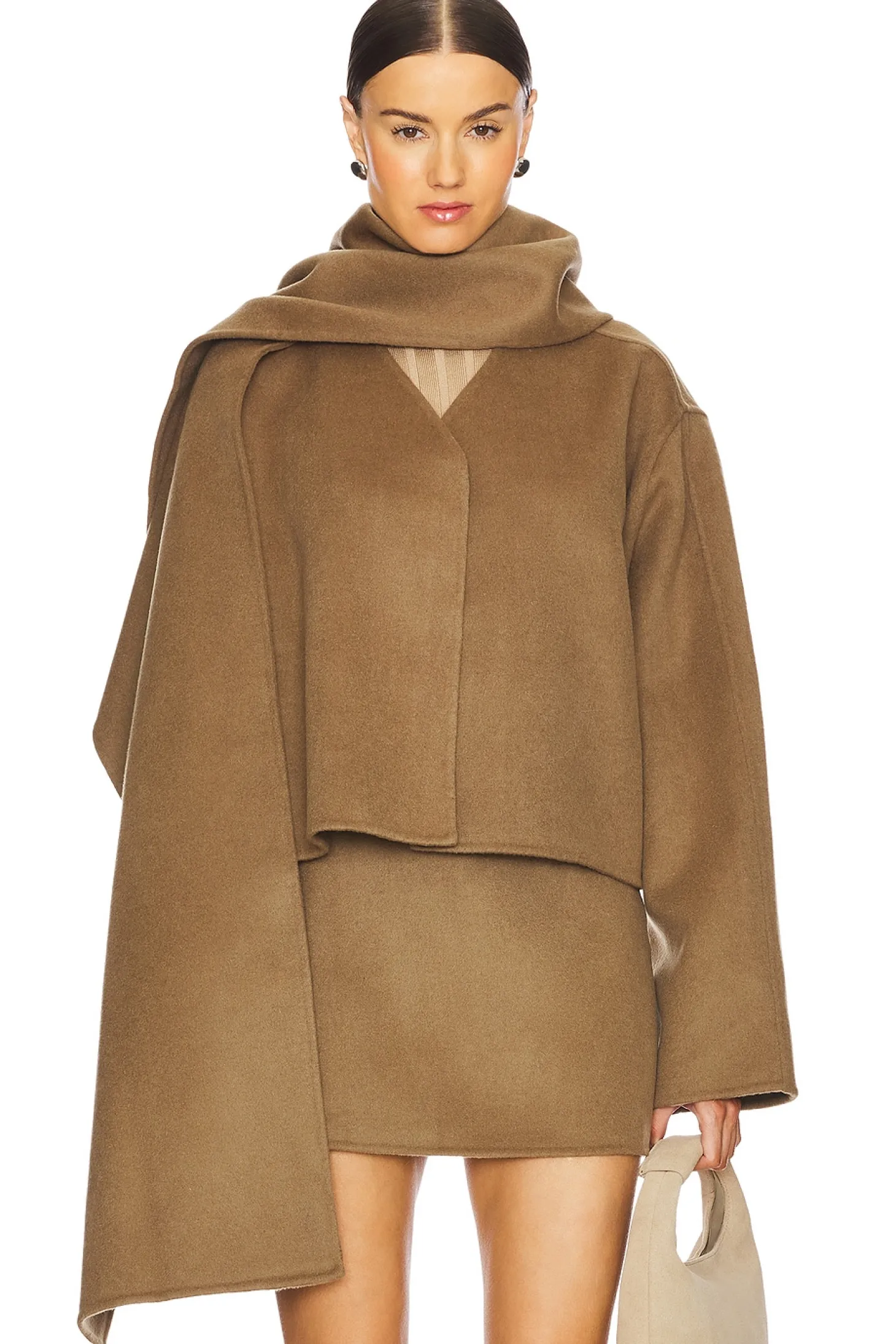 70% wool 30% polyester.Made in China.Dry clean only.Pull-on styling.Optional scarf included.Cropped fit.Brushed twill fabric Item not sold as a set