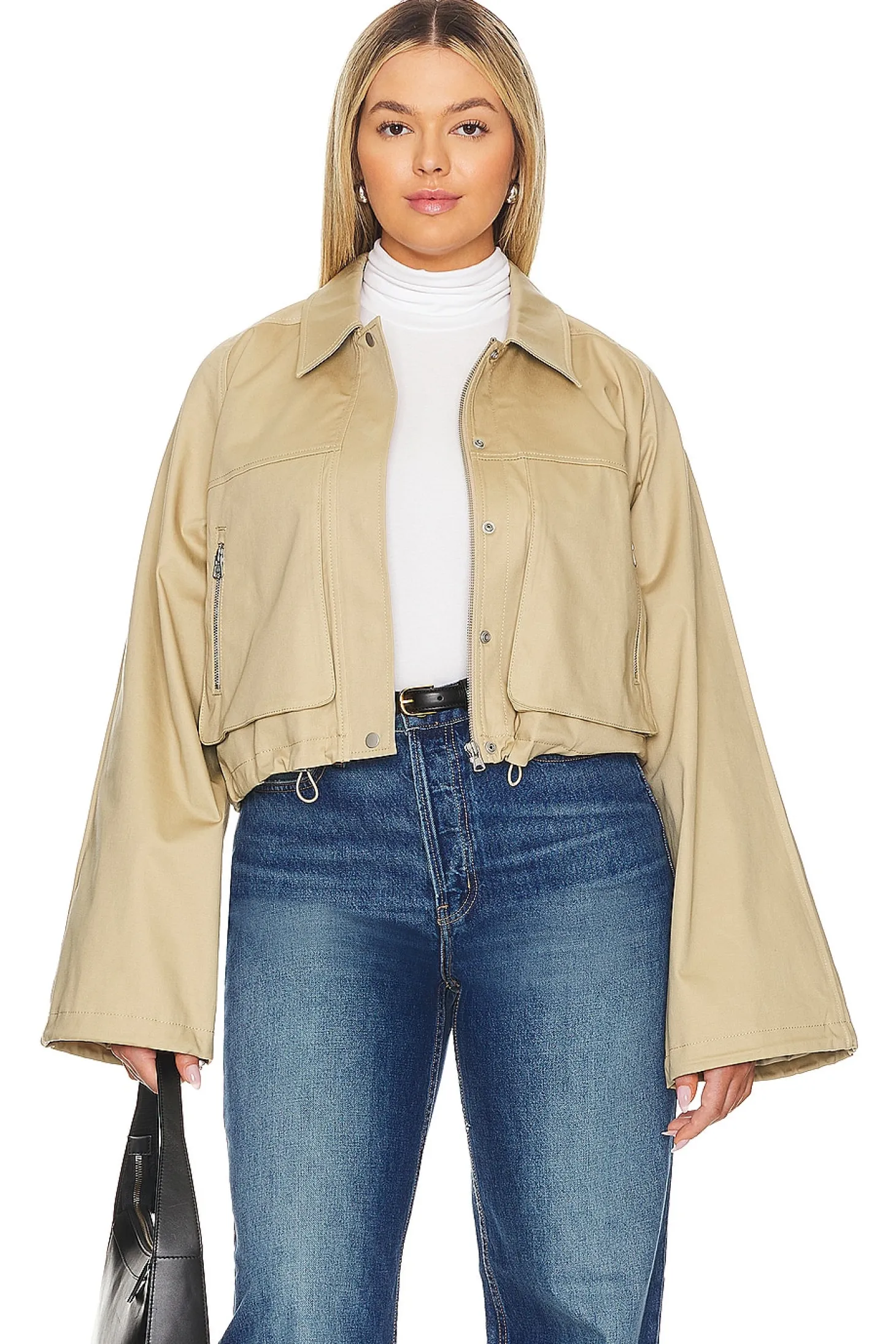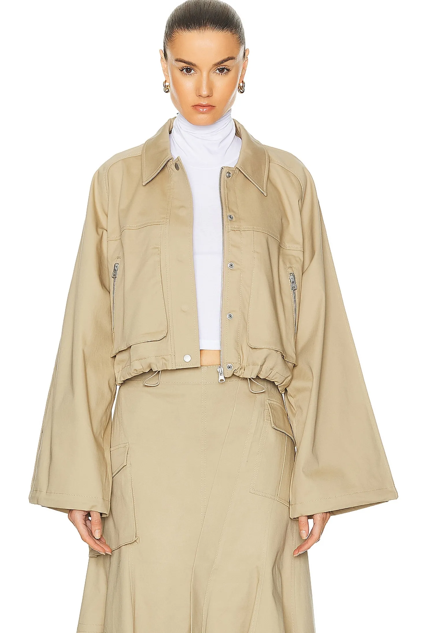 Self: 97% cotton 3% elastane Lining: 55% polyester 45% rayon.Made in China.Dry clean only.Front zipper closure.Side slant zipper pockets.Blouson sleeves with cinched cuffs.Drawcord detail at hem.Item not sold as a set