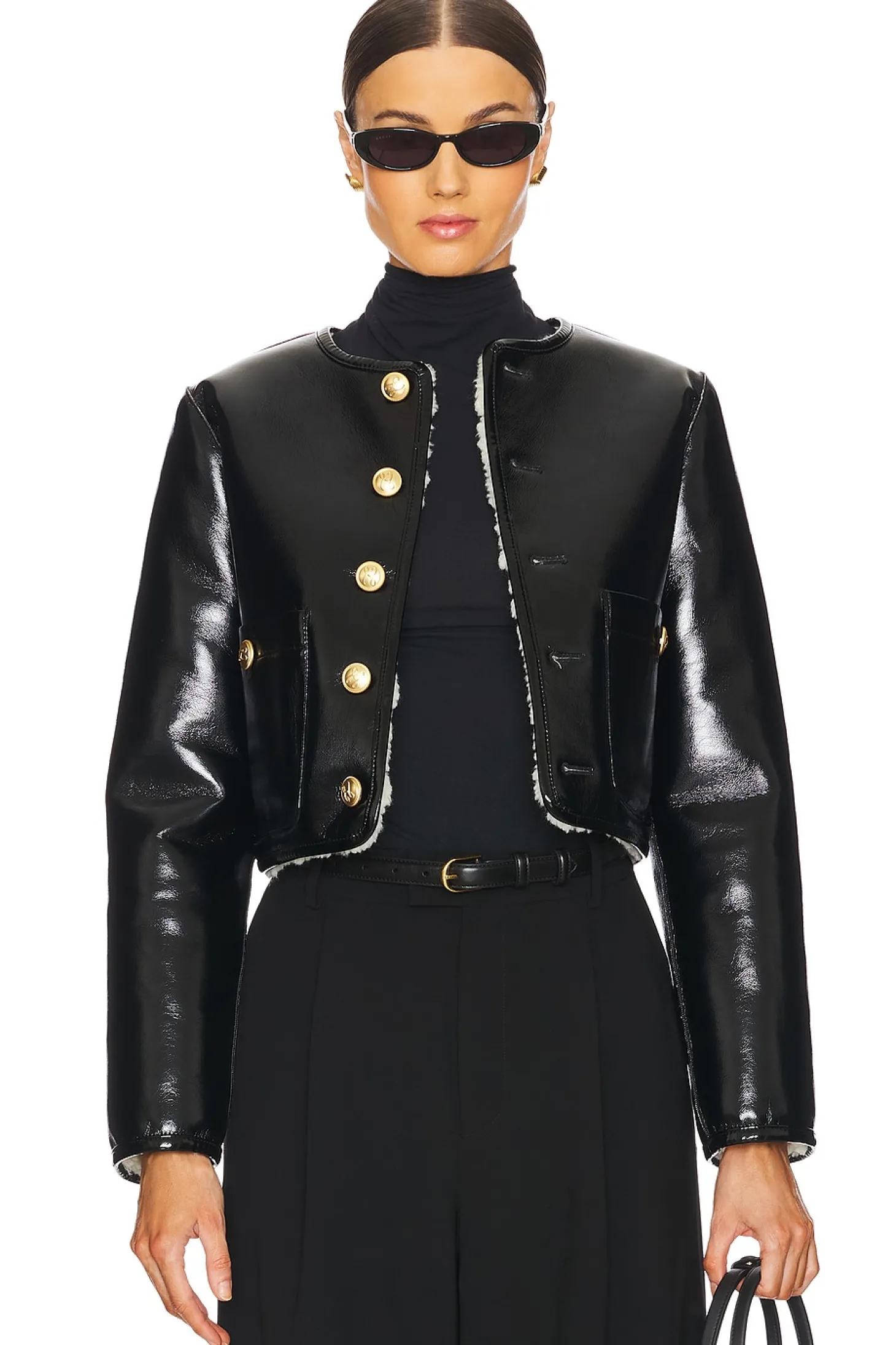 Self 1: 100% polyurethane Self 2: 100% polyester.Made in China.Dry clean only.Front button closure.Reversible styling.Front pouch pockets.Faux leather and faux fur fabric
