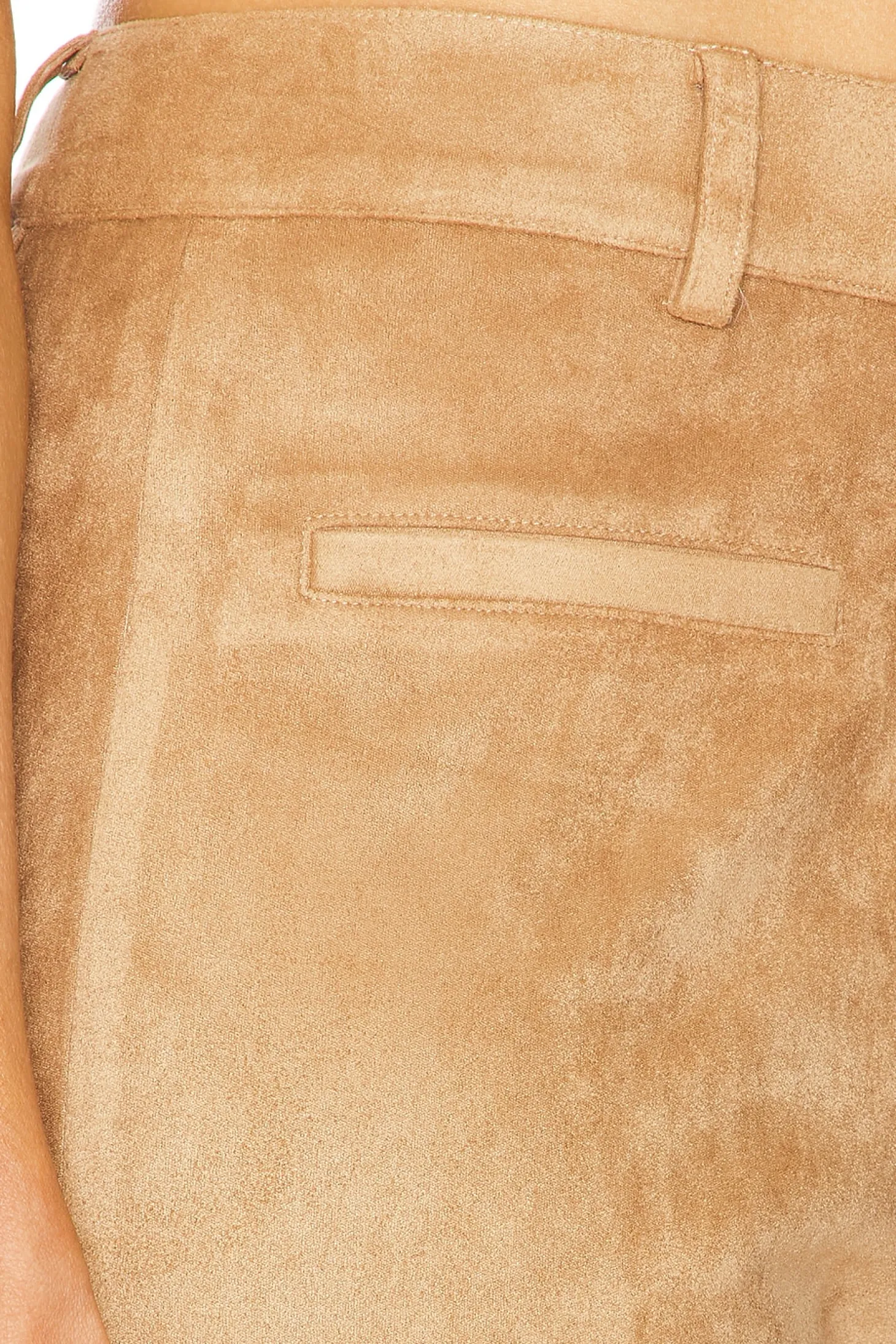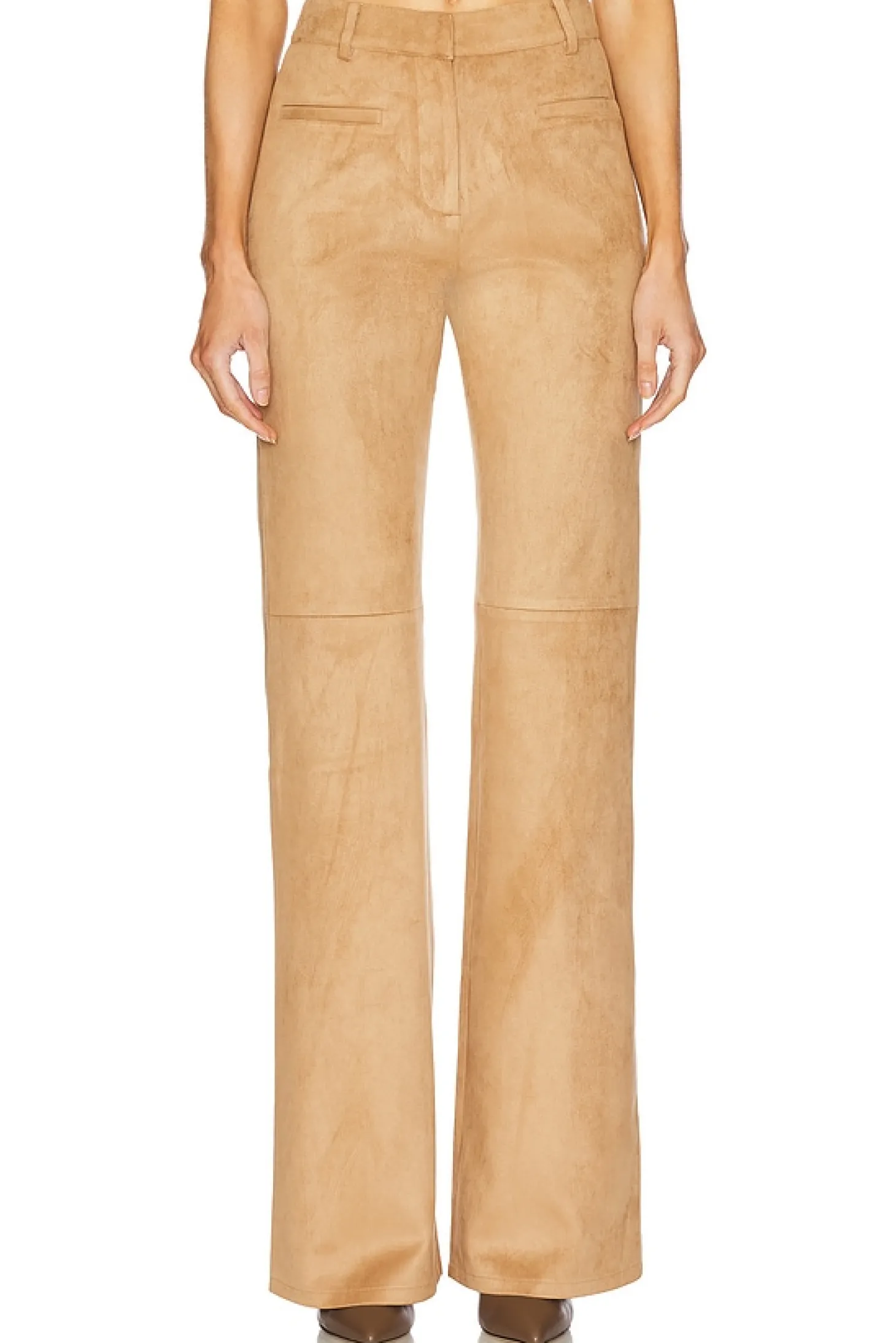 Self: 90% polyester 10% elastane Lining: 100% polyester.Made in China.Spot clean only.Zip fly with hook and bar closure.4-pocket styling.Faux suede fabric.Item not sold as a set.17" at the knee breaks to 22" at the leg opening