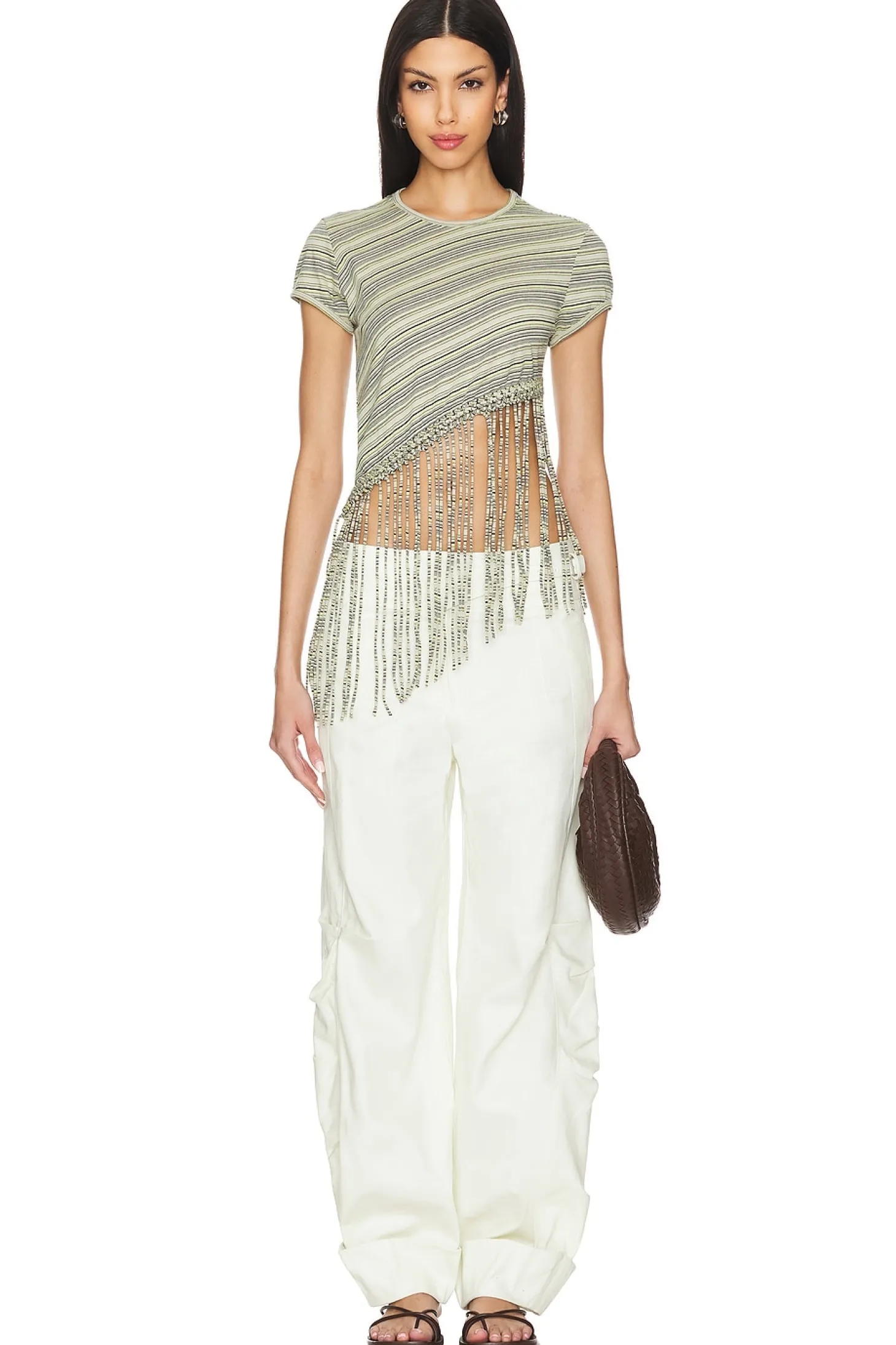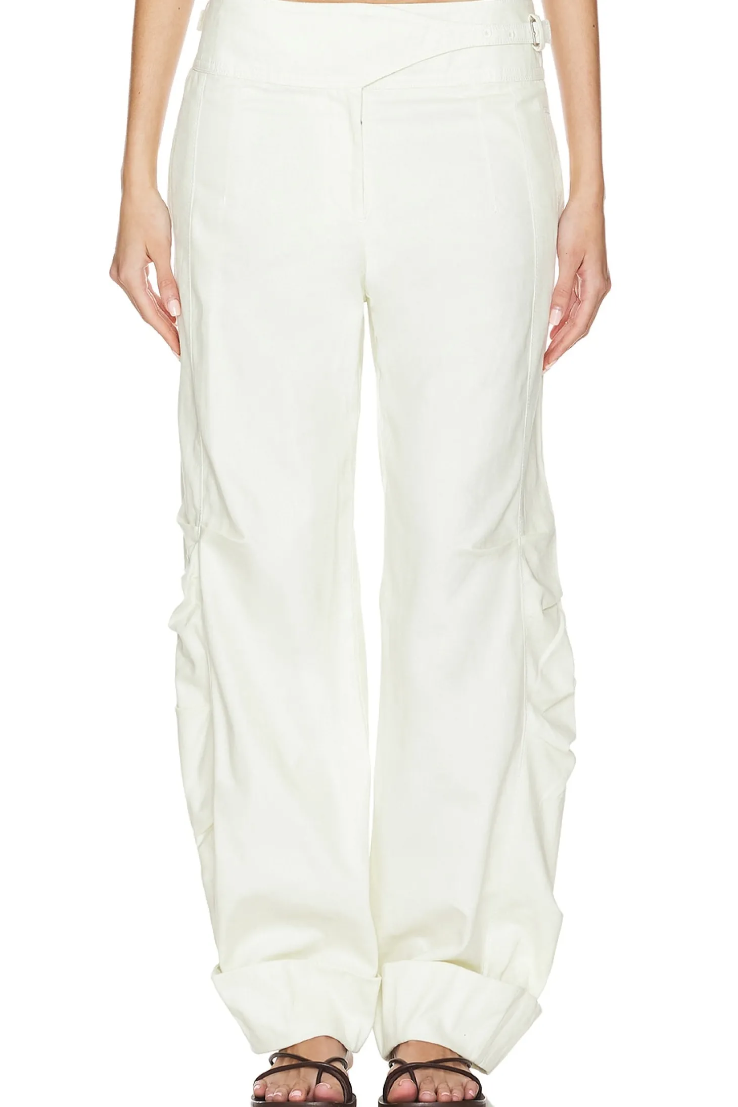 100% cotton.Made in Indonesia.Hand wash.Surplice waist with adjustable tabs at sides.Hidden zip fly.Side pockets.Rolled hem.22" at the knee narrows to 17" at the leg opening