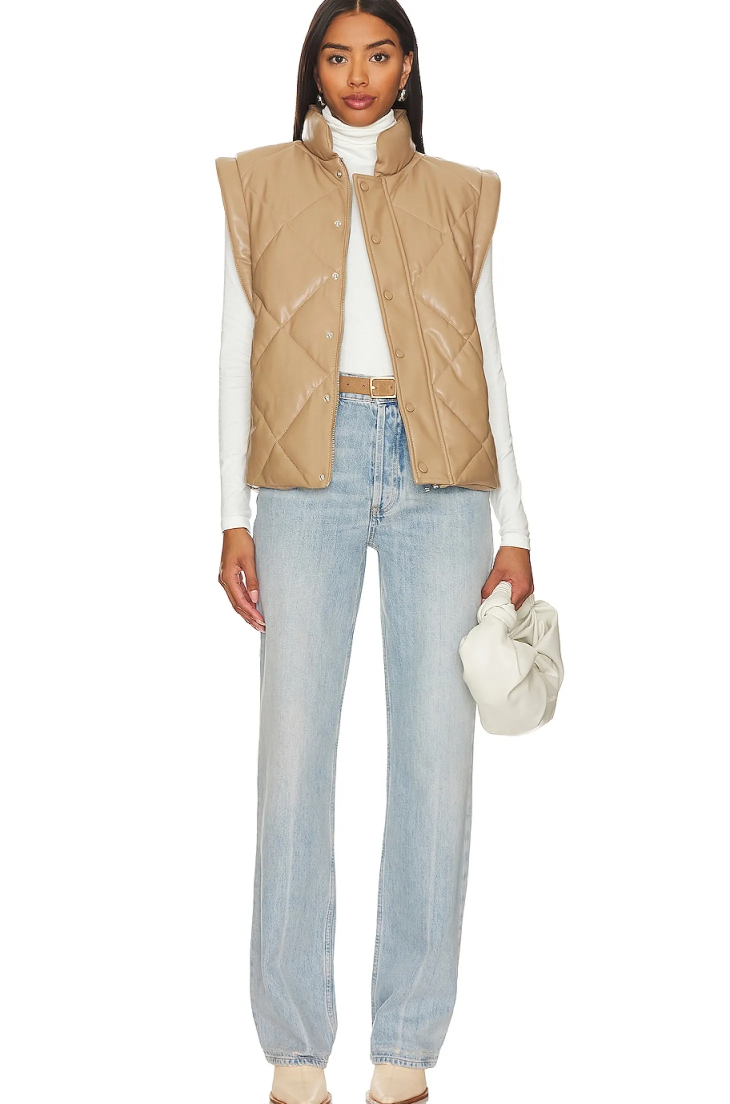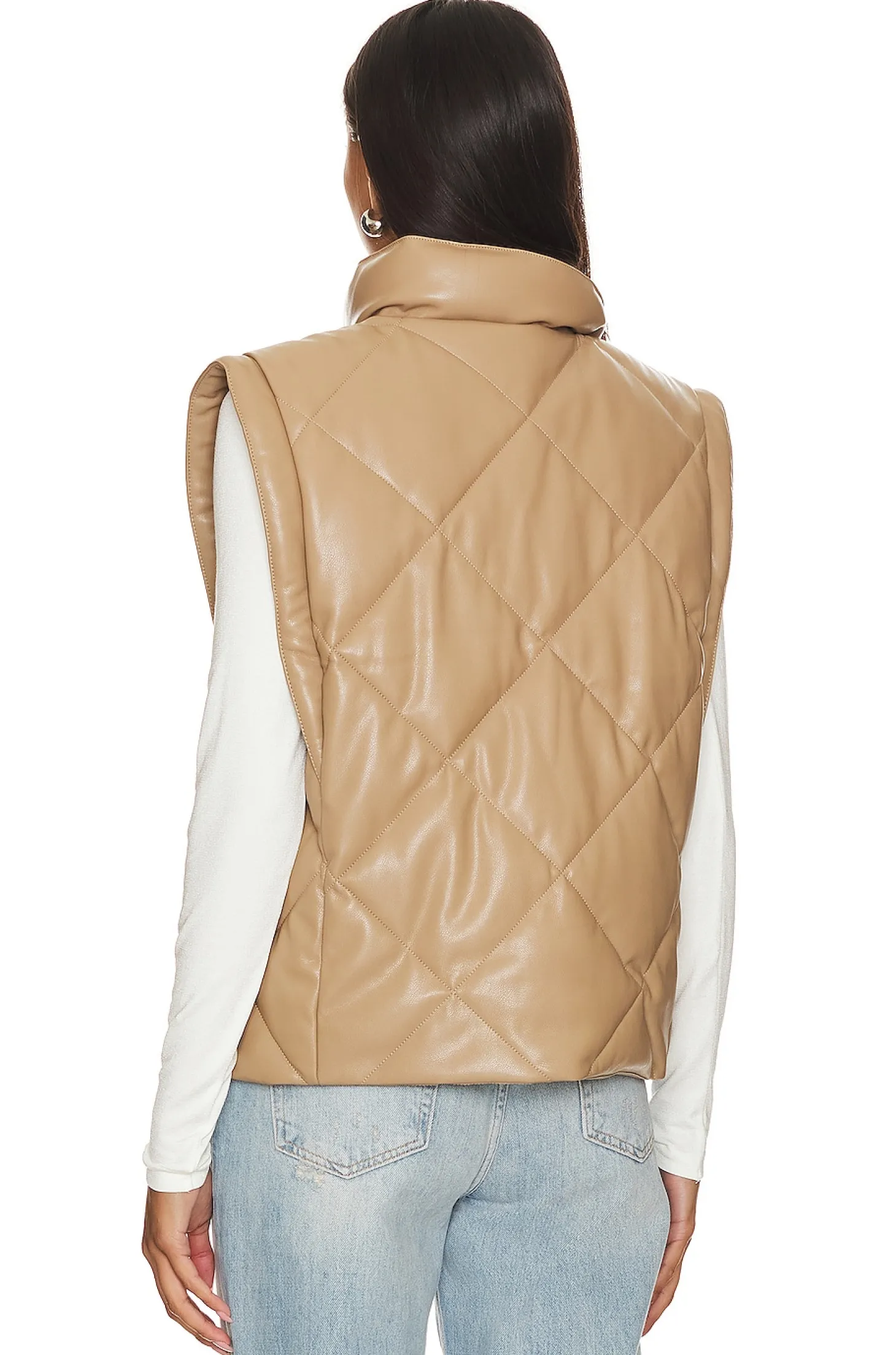 Polyurethane blend.Imported.Hand wash recommended.Front zipper and button closure.Side seam pockets.Stand up collar.Midweight padded faux leather fabric