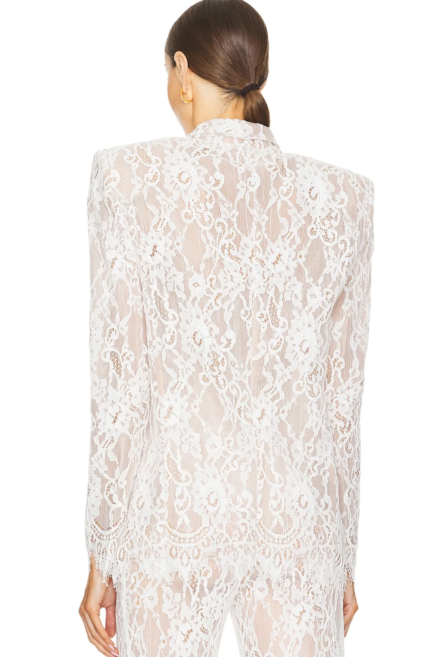 Self: 80% viscose 20% cotton Lining: 95% polyester 5% elastane.Made in China.Dry clean only.Front button closure.Heavy padding at shoulders.Lace fabric