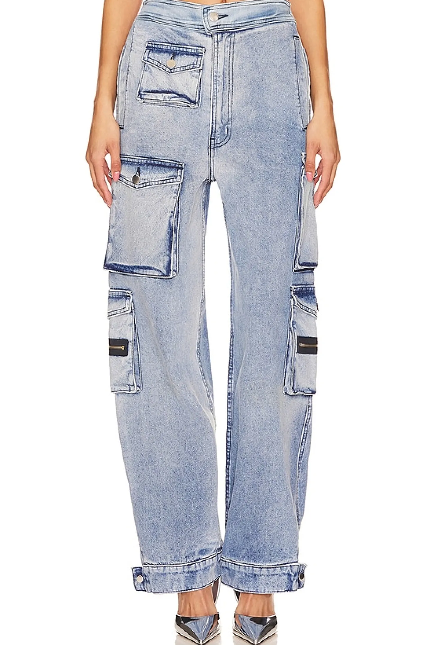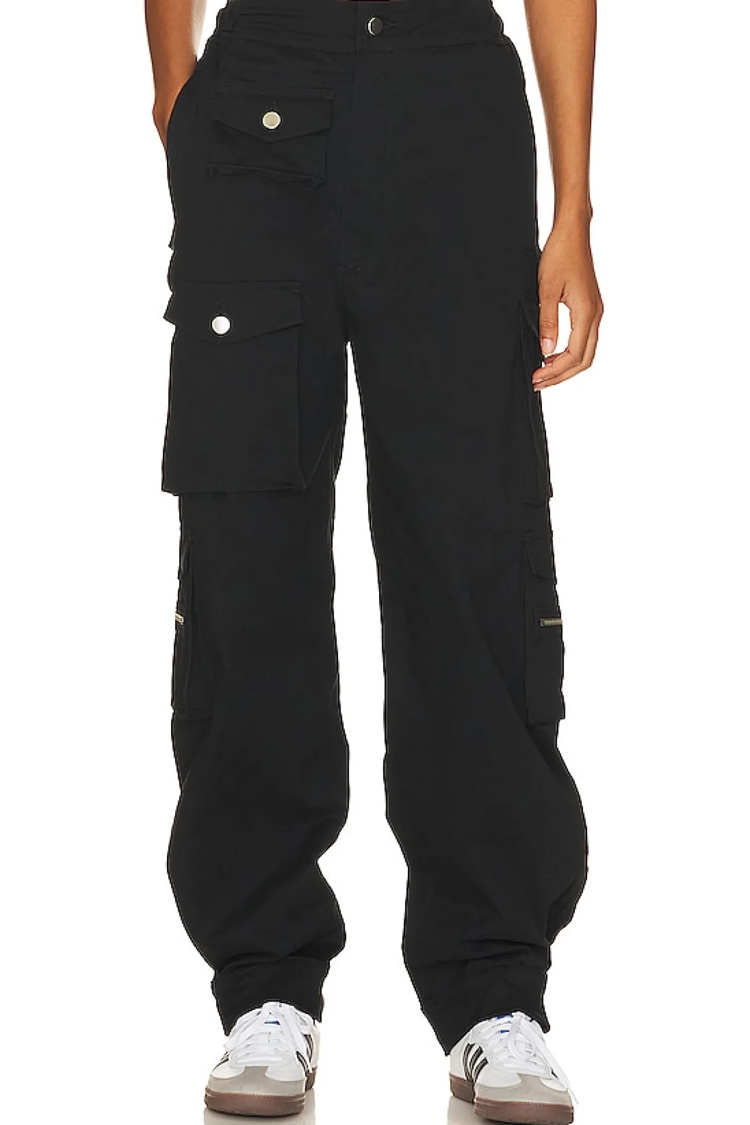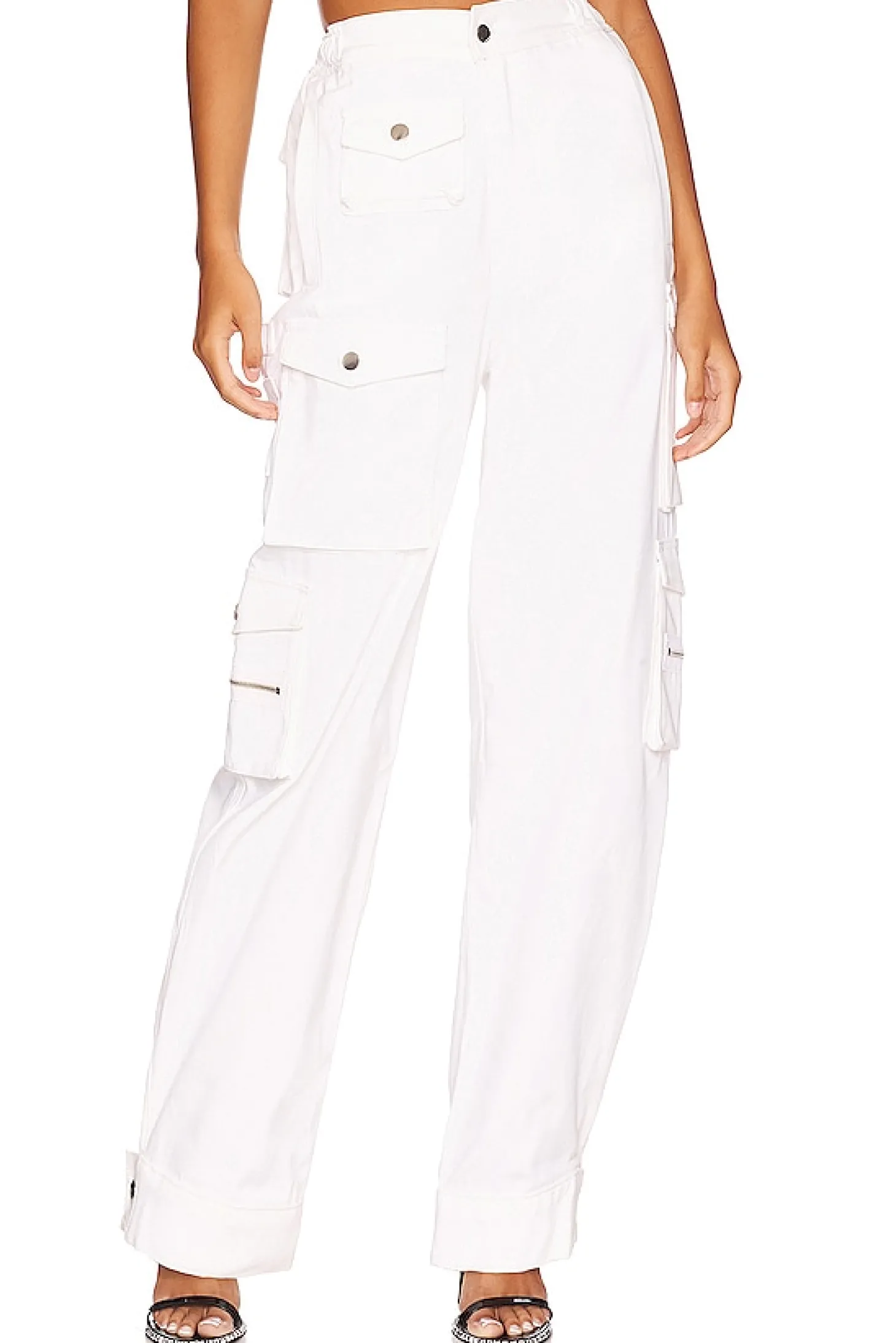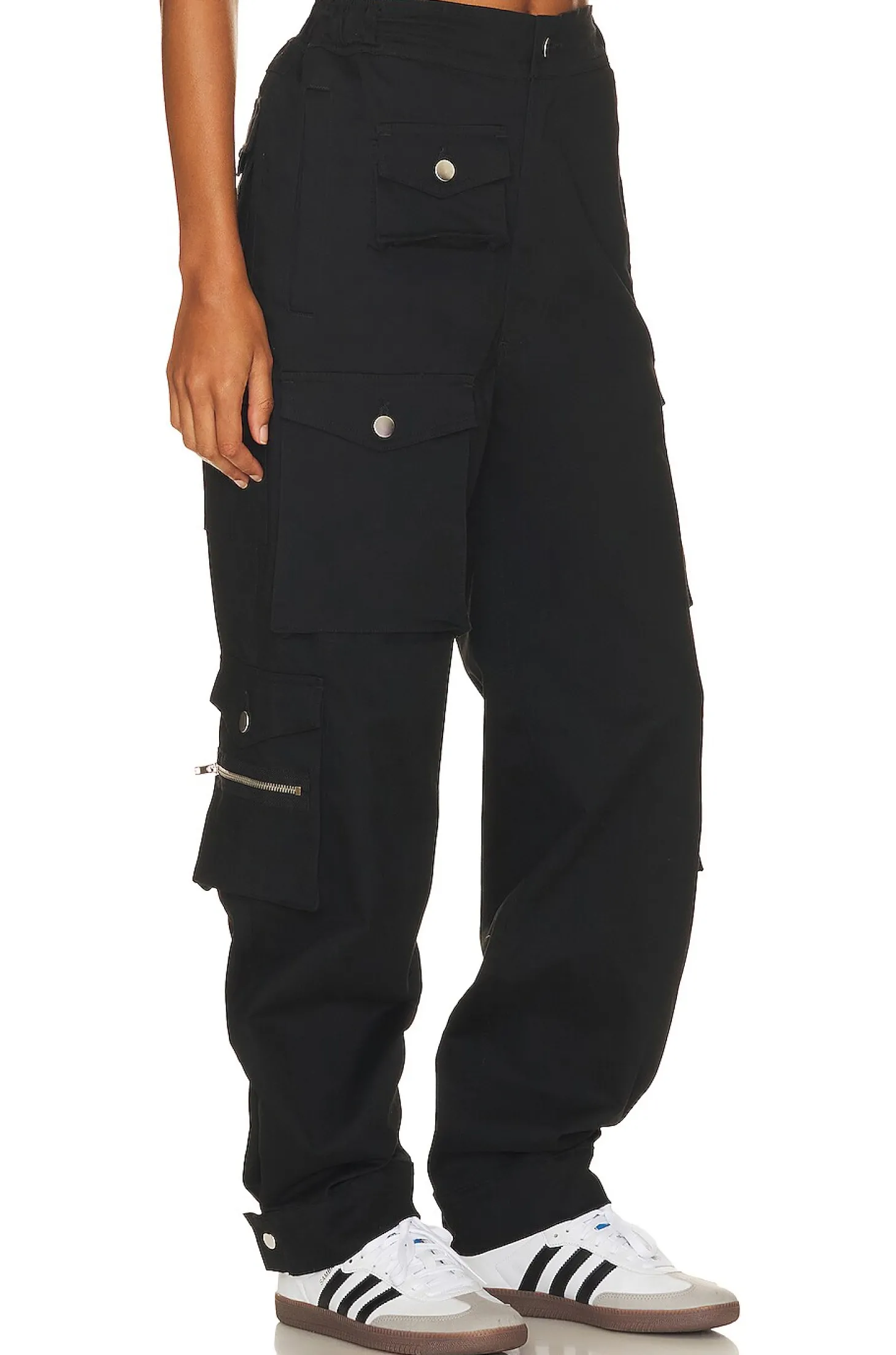 Self: 98% cotton 2% spandex Lining: 80% polyester 20% cotton.Made in USA.Dry clean only.Elastic waistband.Zip fly with button closure.Side slip pockets.Back and side flap pockets with button closure.24" at the knee narrows to 22" at the leg opening