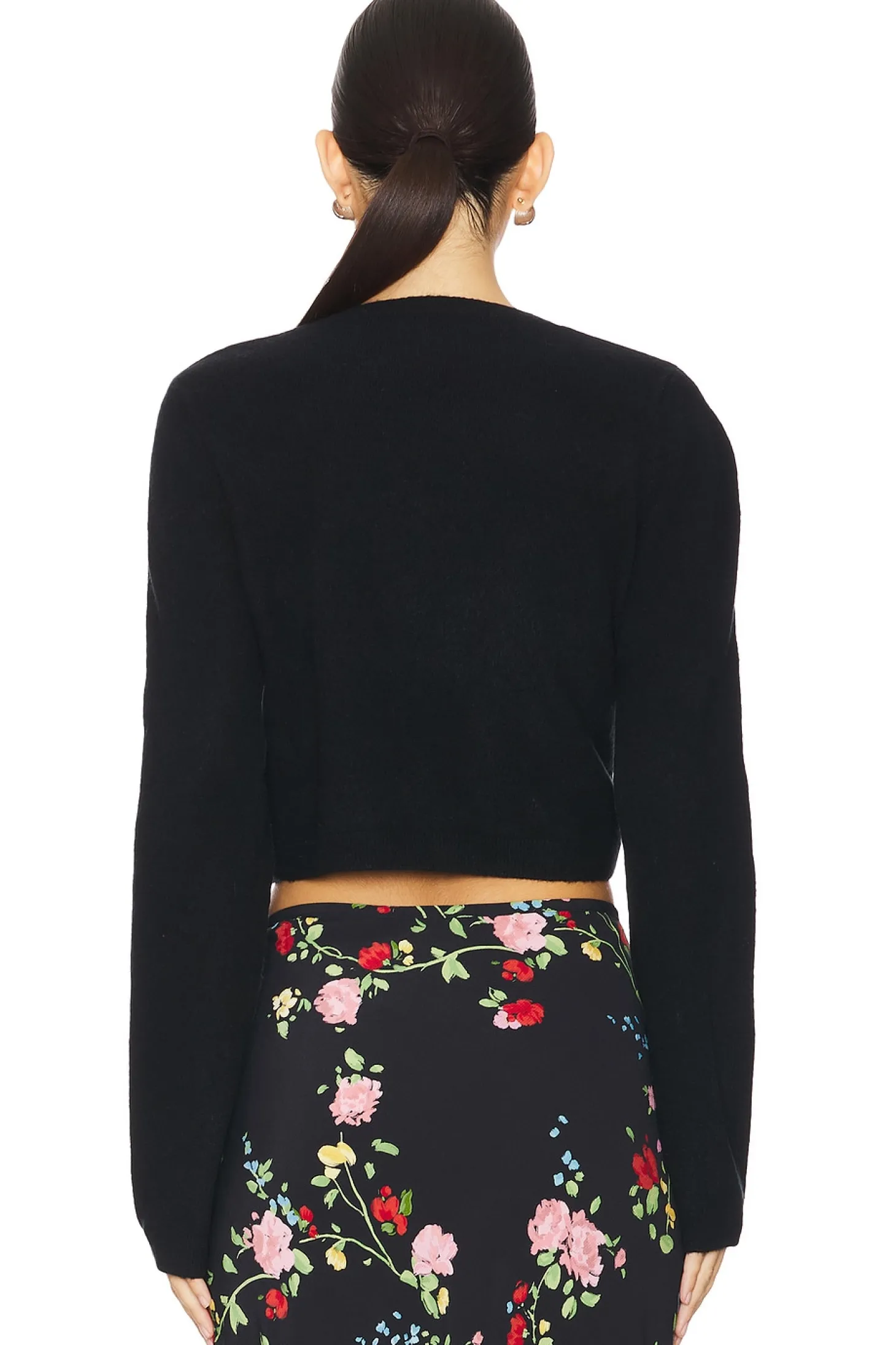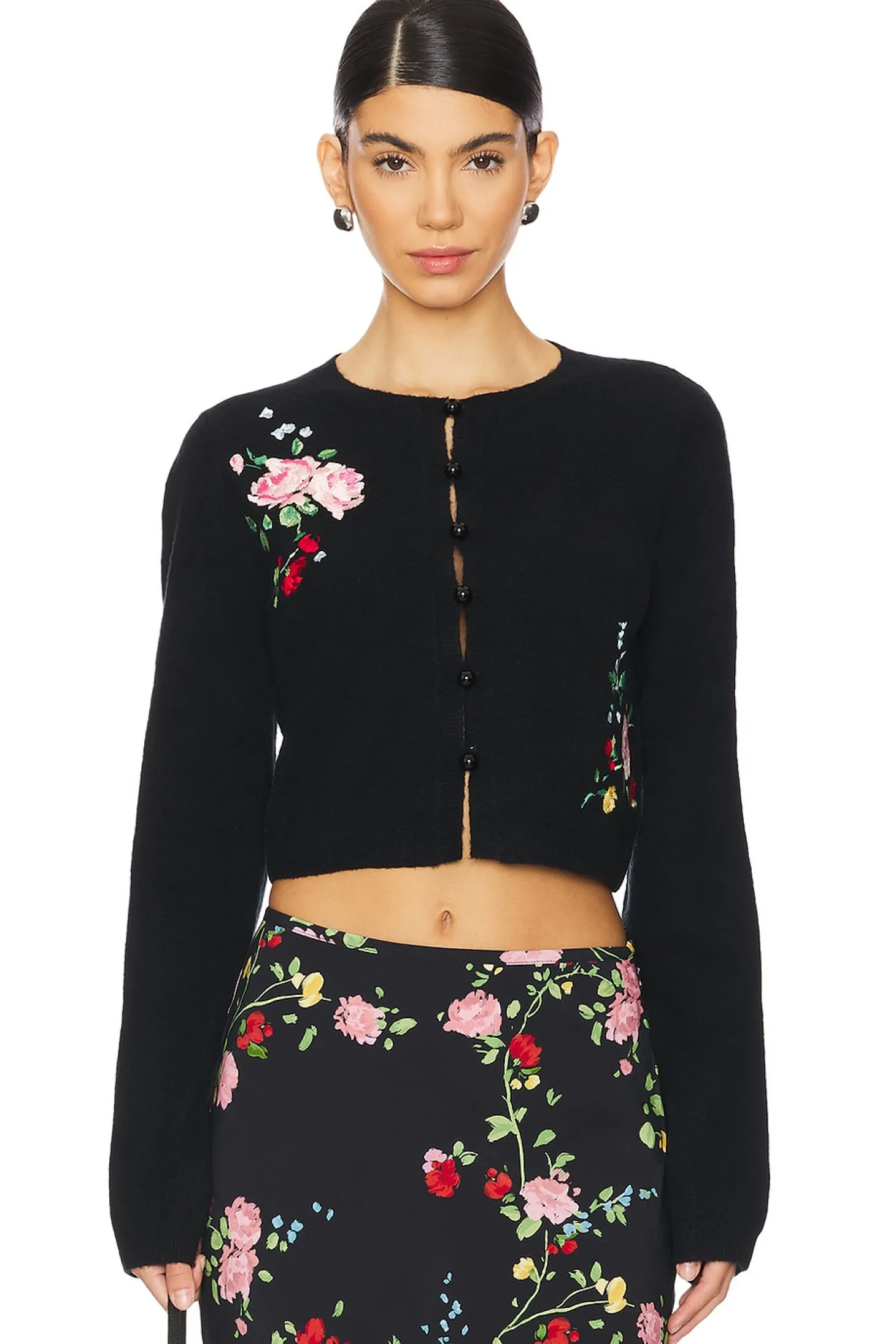 58% polyamide 31% acrylic 8% wool 3% spandex.Made in China.Hand wash.Front button closure.Cropped fit design.Knit fabric with floral embroidery.Item not sold as a set