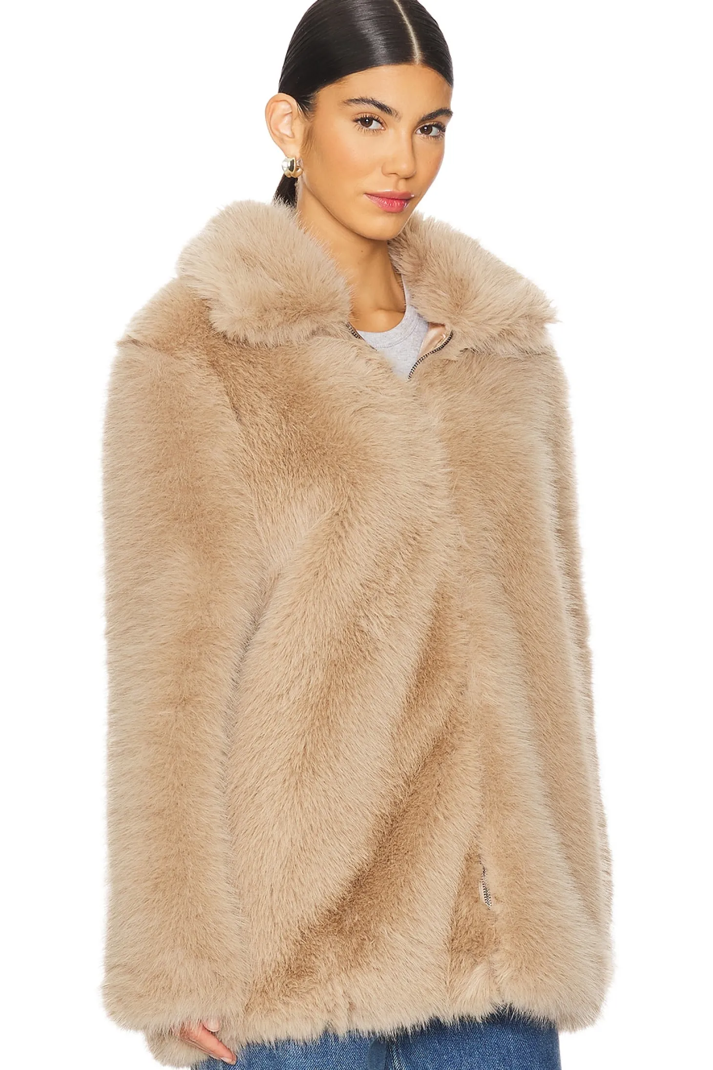 Faux Fur: 100% polyester Lining: 100% polyester.Made in China.Machine wash.Hidden front zipper closure.Faux fur exterior